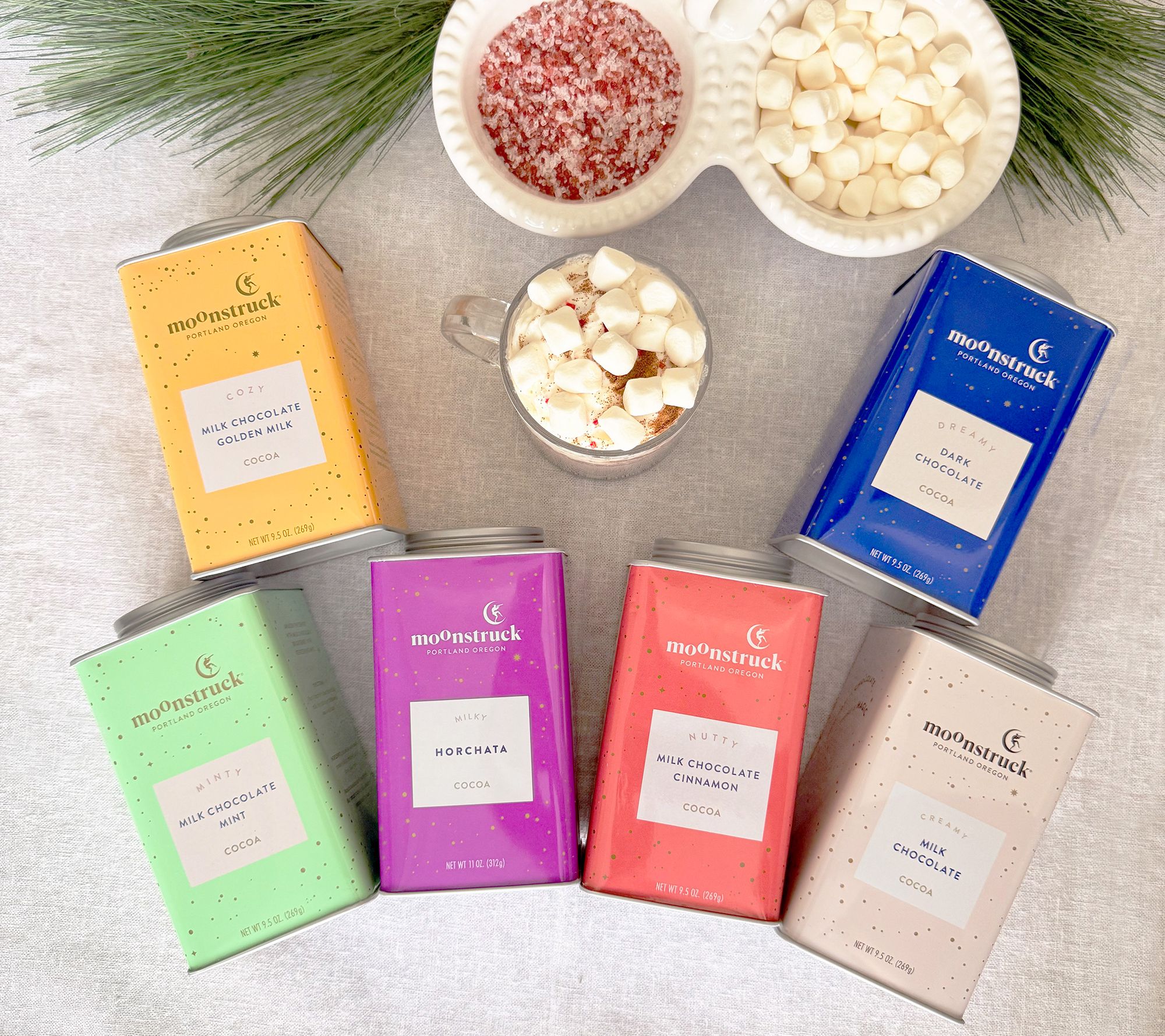 • Includes six 9.5-oz tins of hot cocoa mix: one each of Dreamy Dark Chocolate, Creamy Milk Chocolate, Milky Horchata, Nutty Milk Chocolate Cinnamon, Minty Milk Chocolate, and Cozy Milk Chocolate Golden Milk