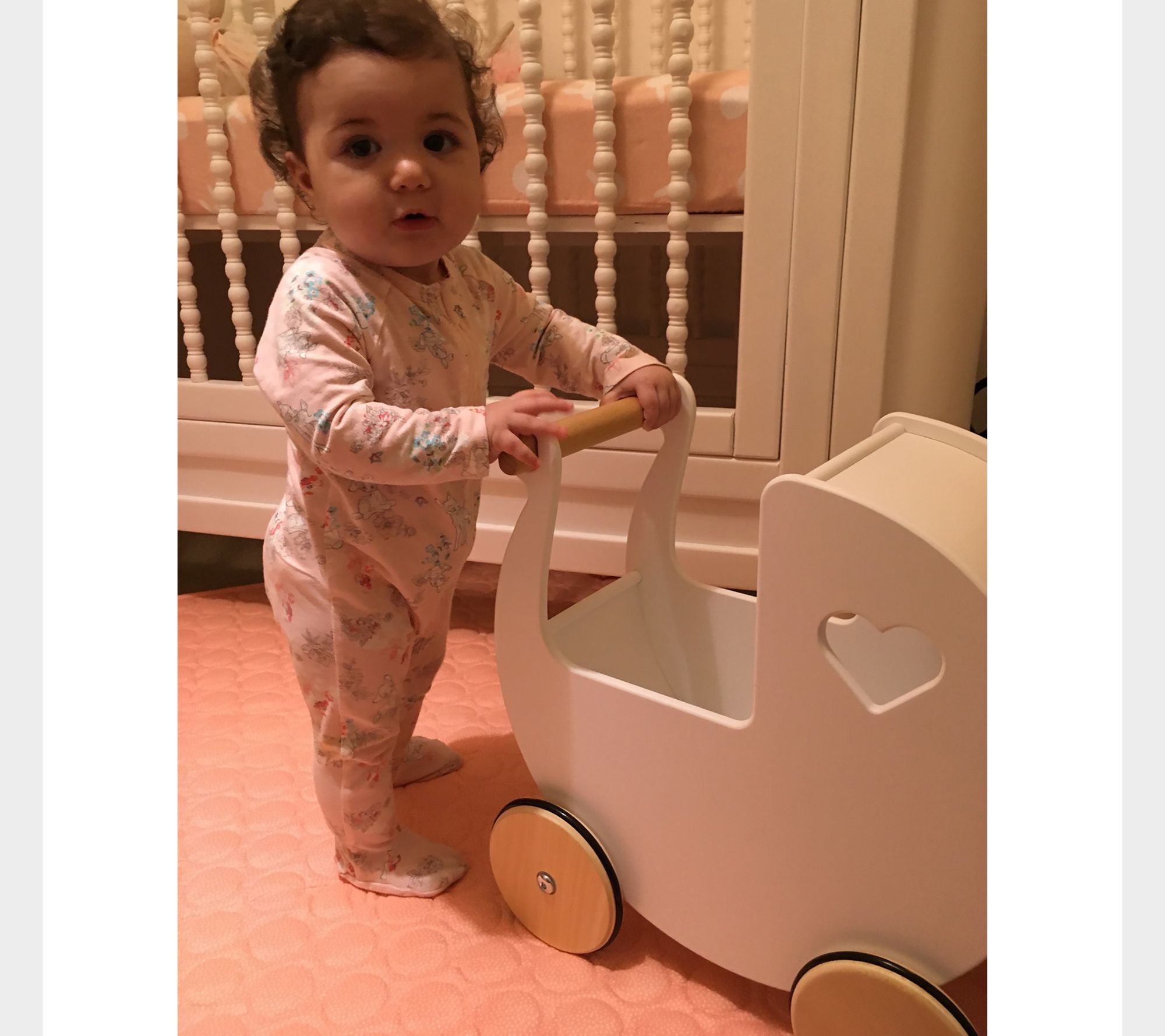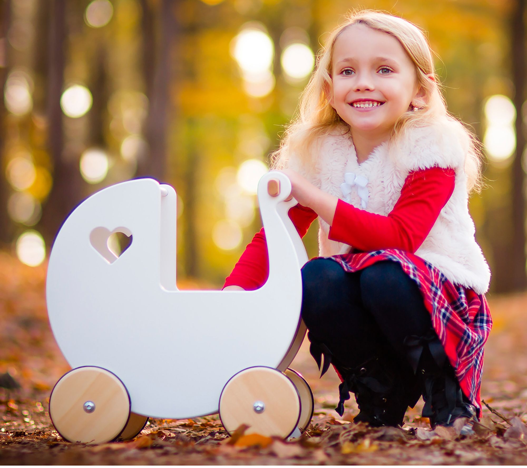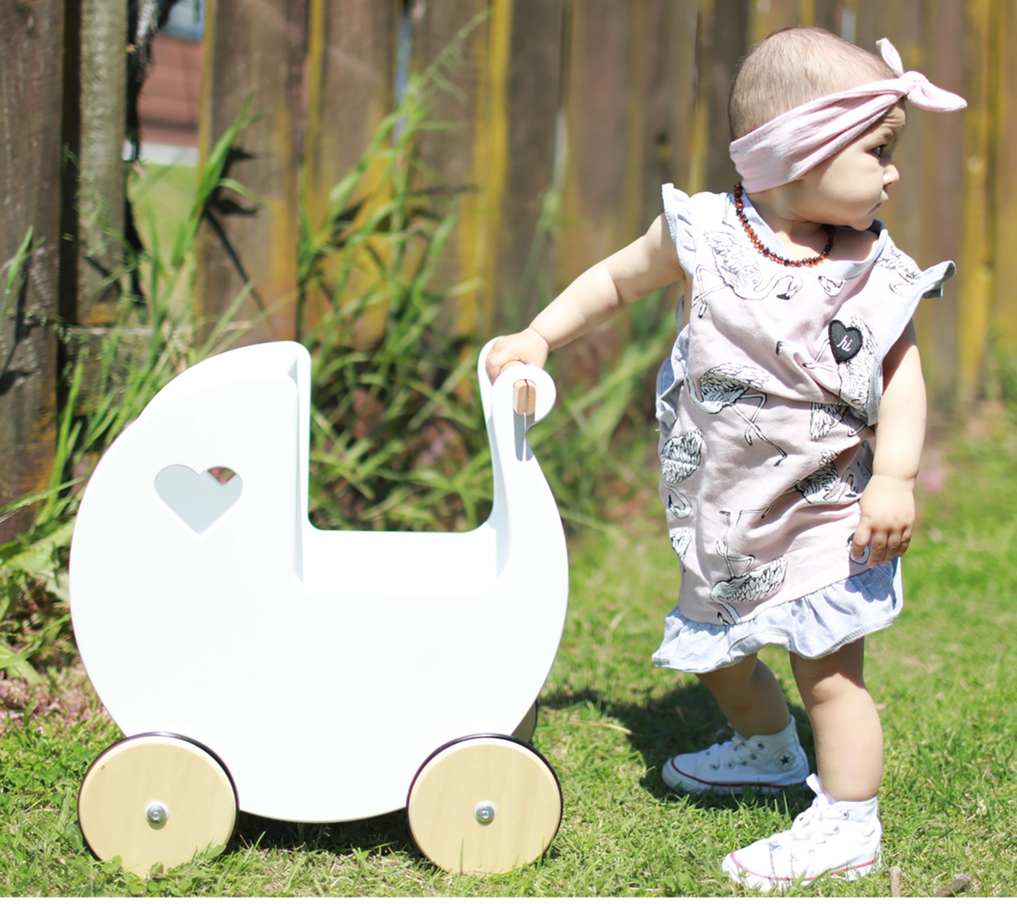 With its modern curves and cute heart windows, this toy pram is the perfect way for little ones to take a walk with a favorite doll or plush friend. From Moover.