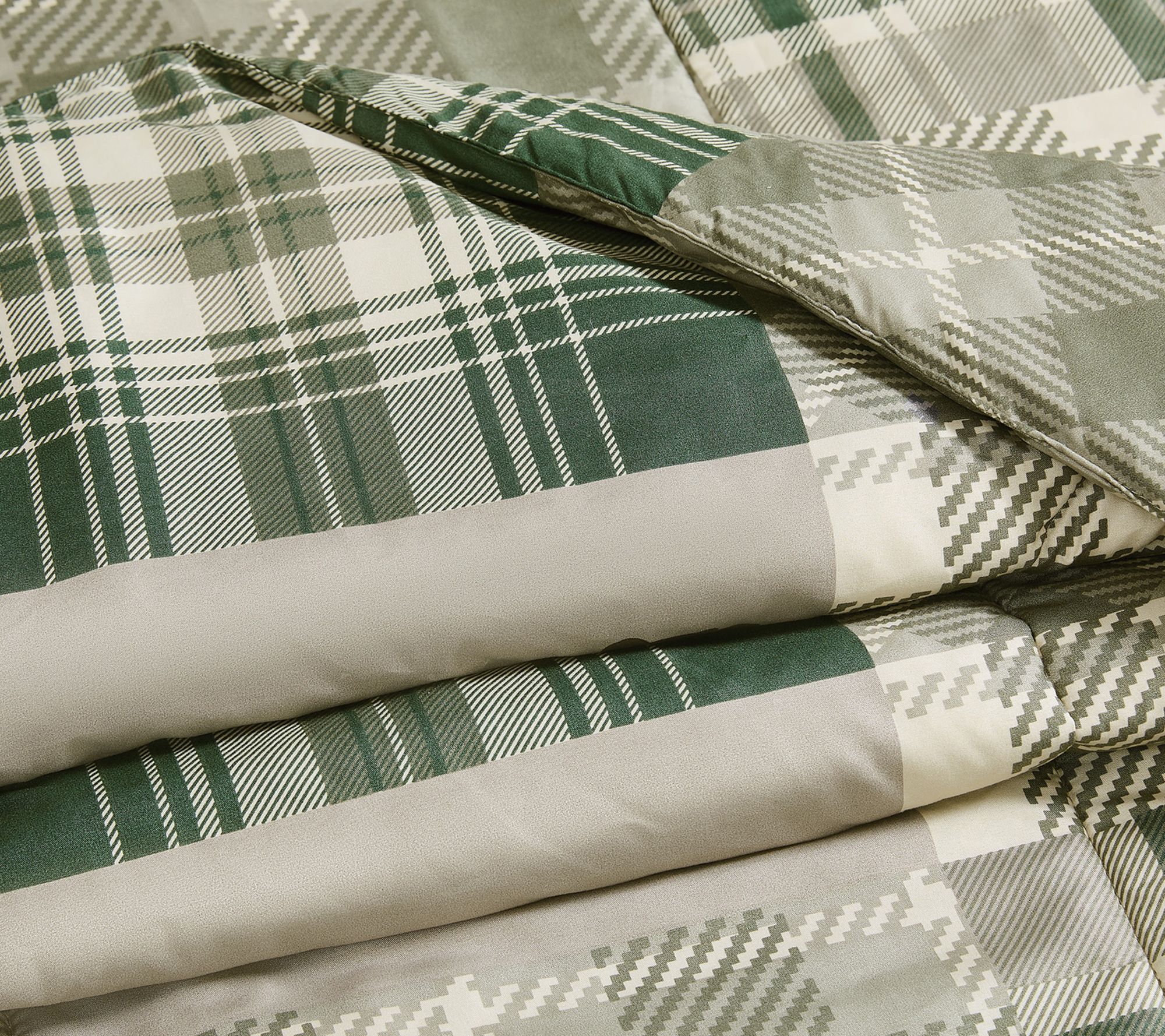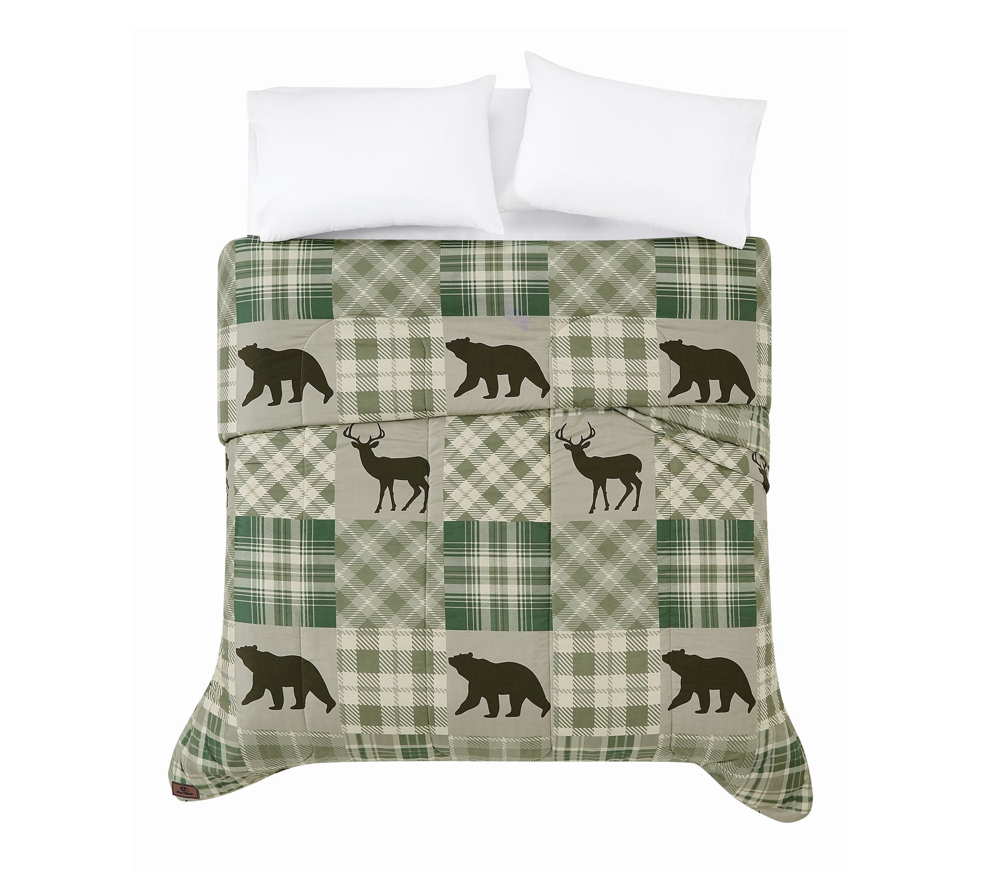 • Patchwork print with bear, plaid, and forest elements