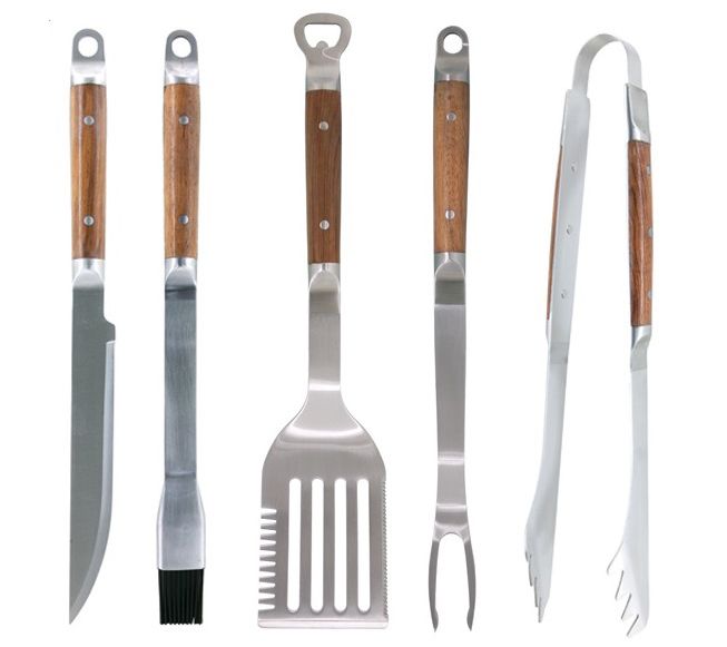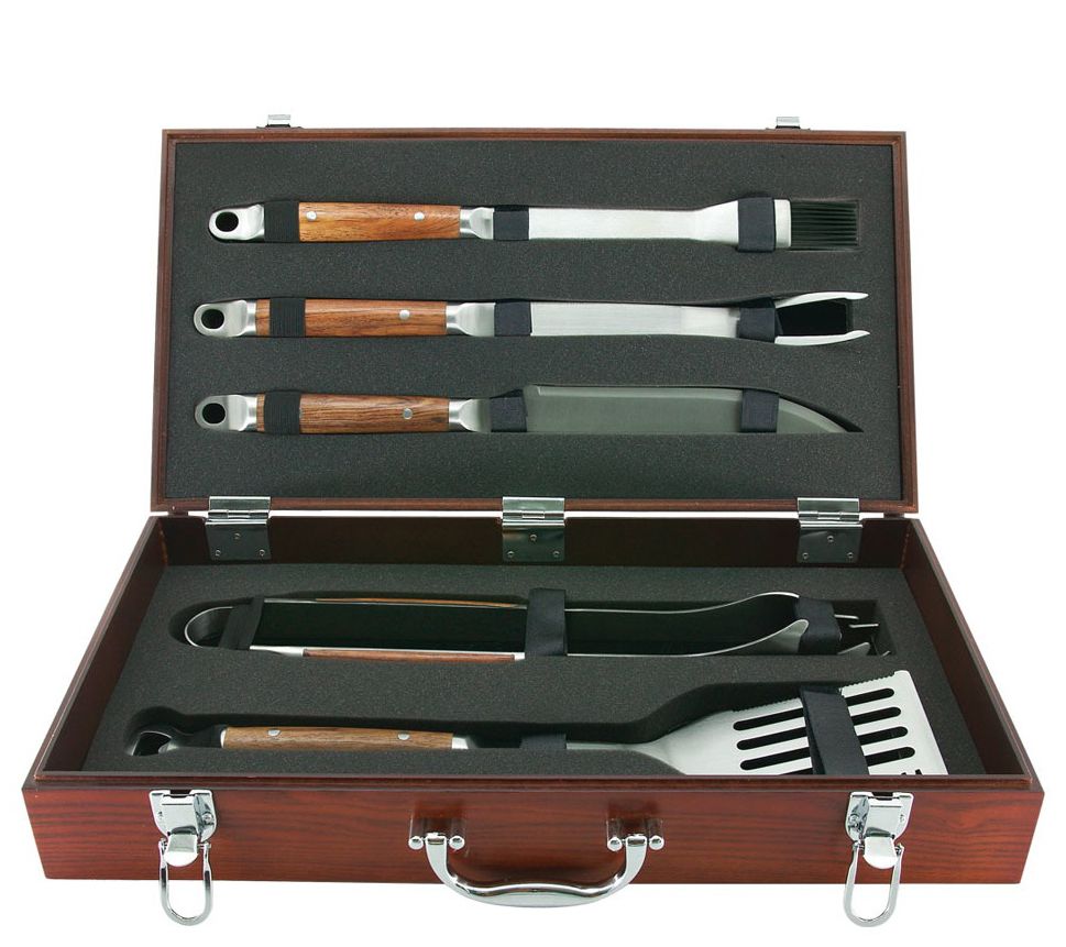 • Includes spatula, fork, tongs, basting brush, knife, and hardwood case