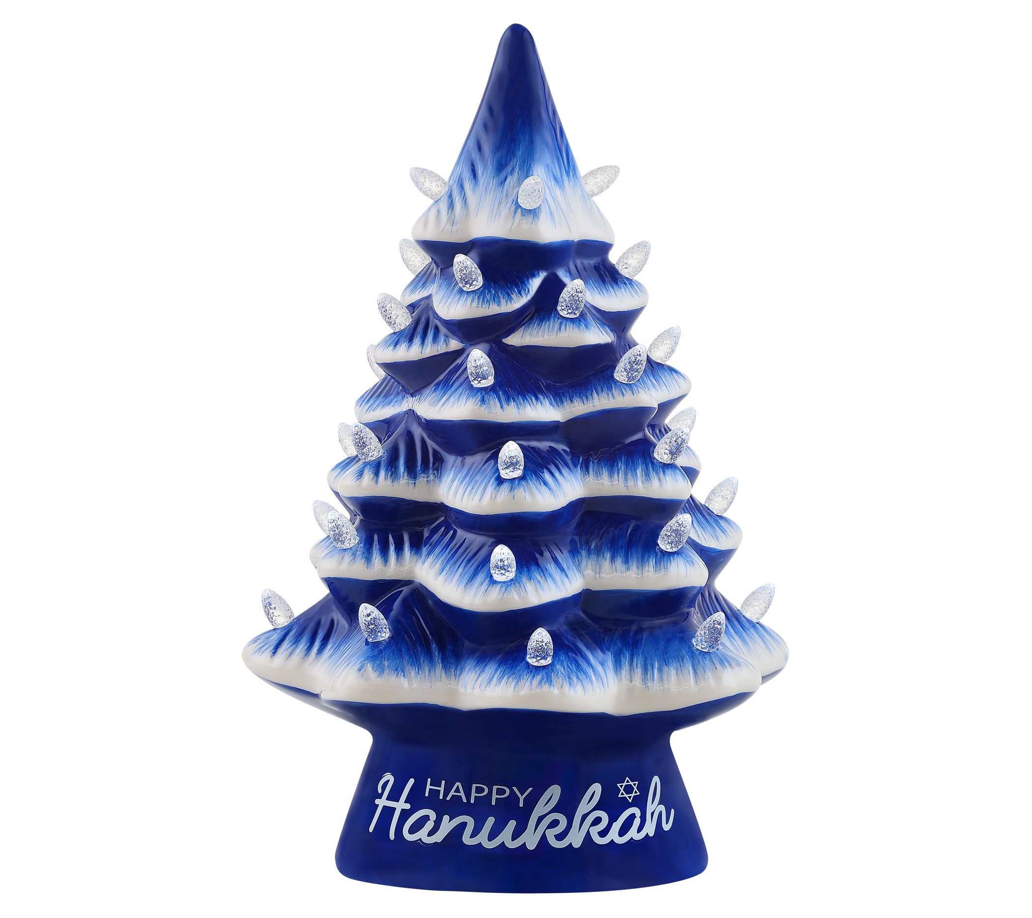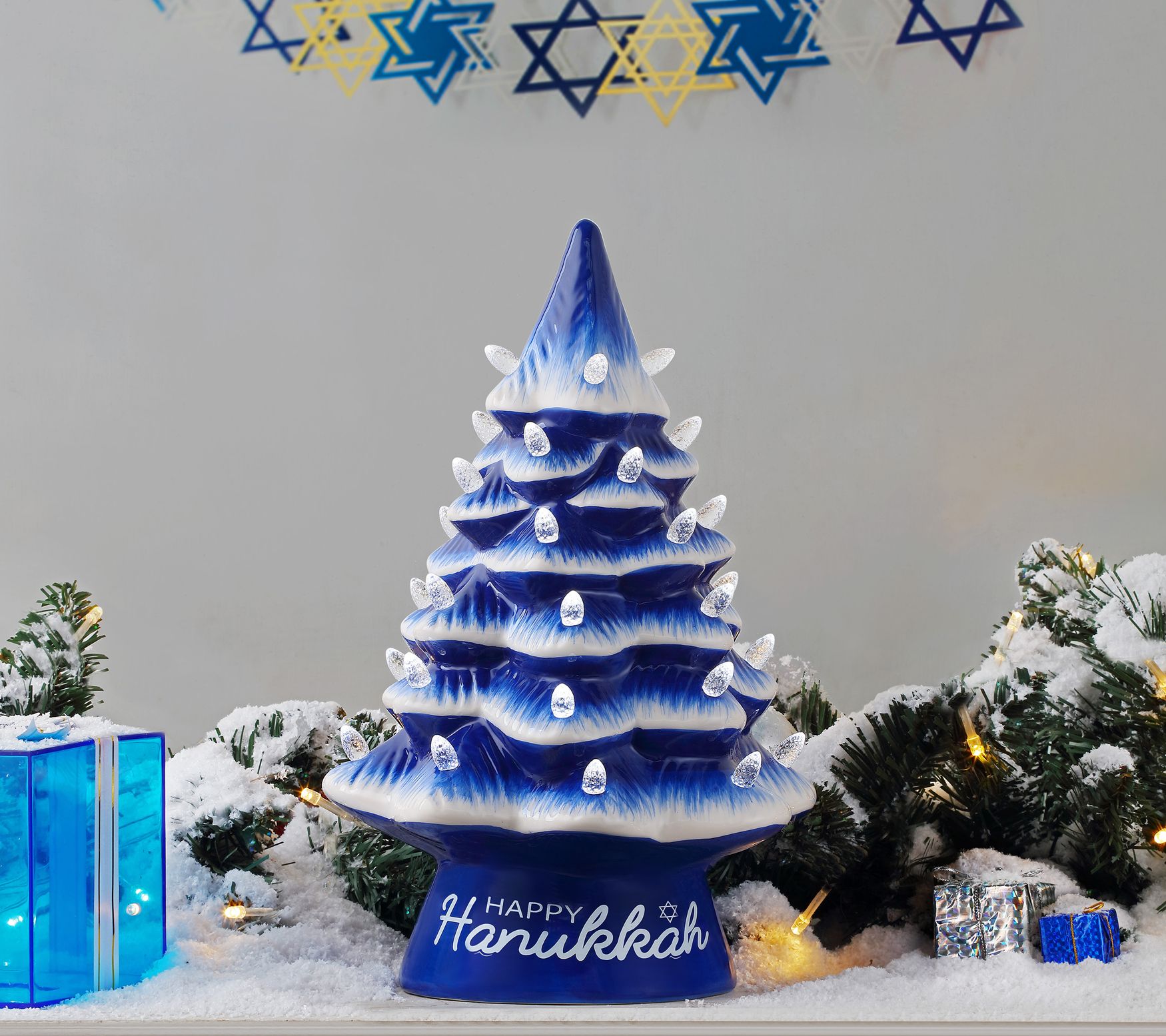 Celebrate the Festival of Lights with this illuminating tabletop Happy Hanukkah tree. From Mr. Christmas.