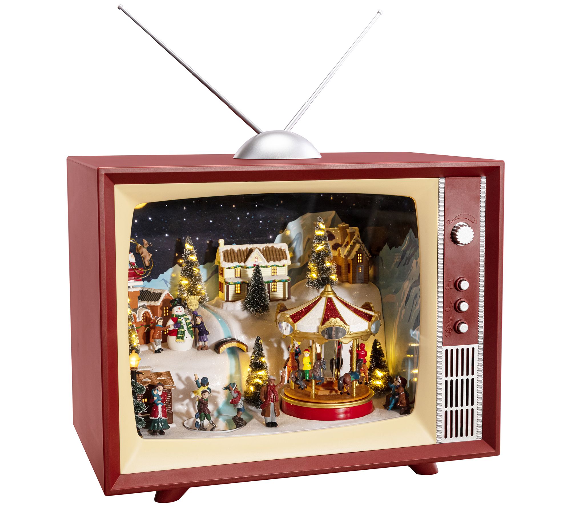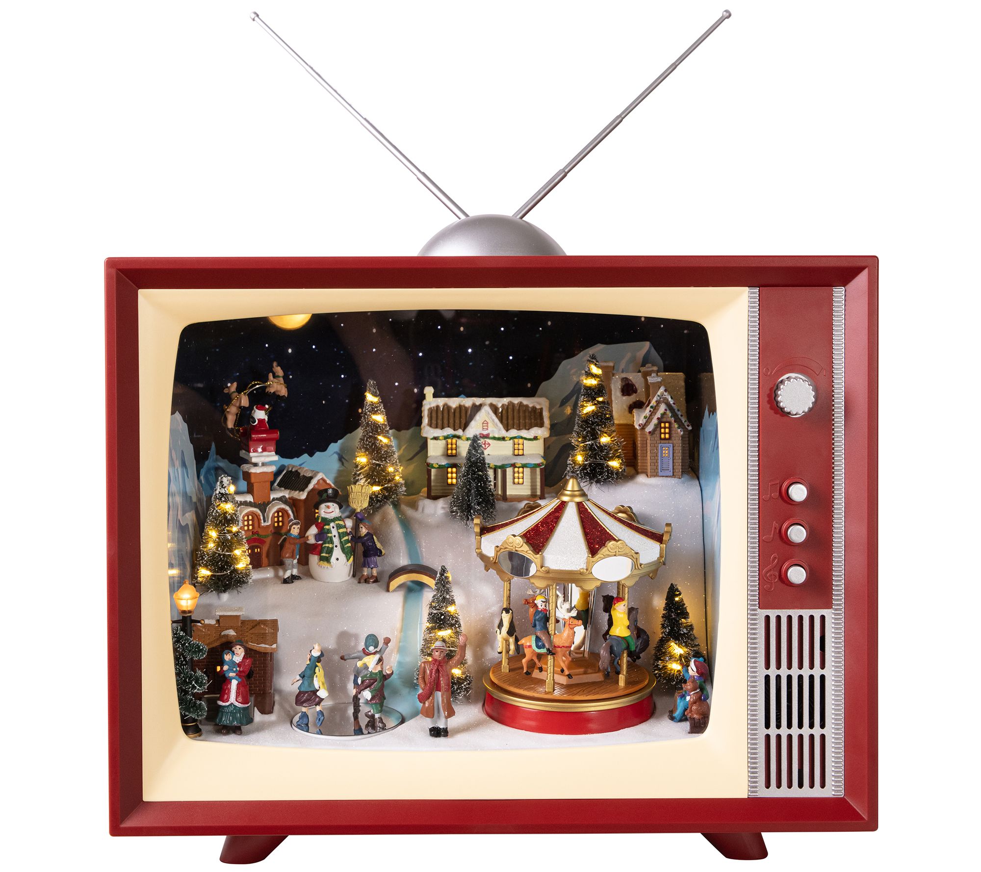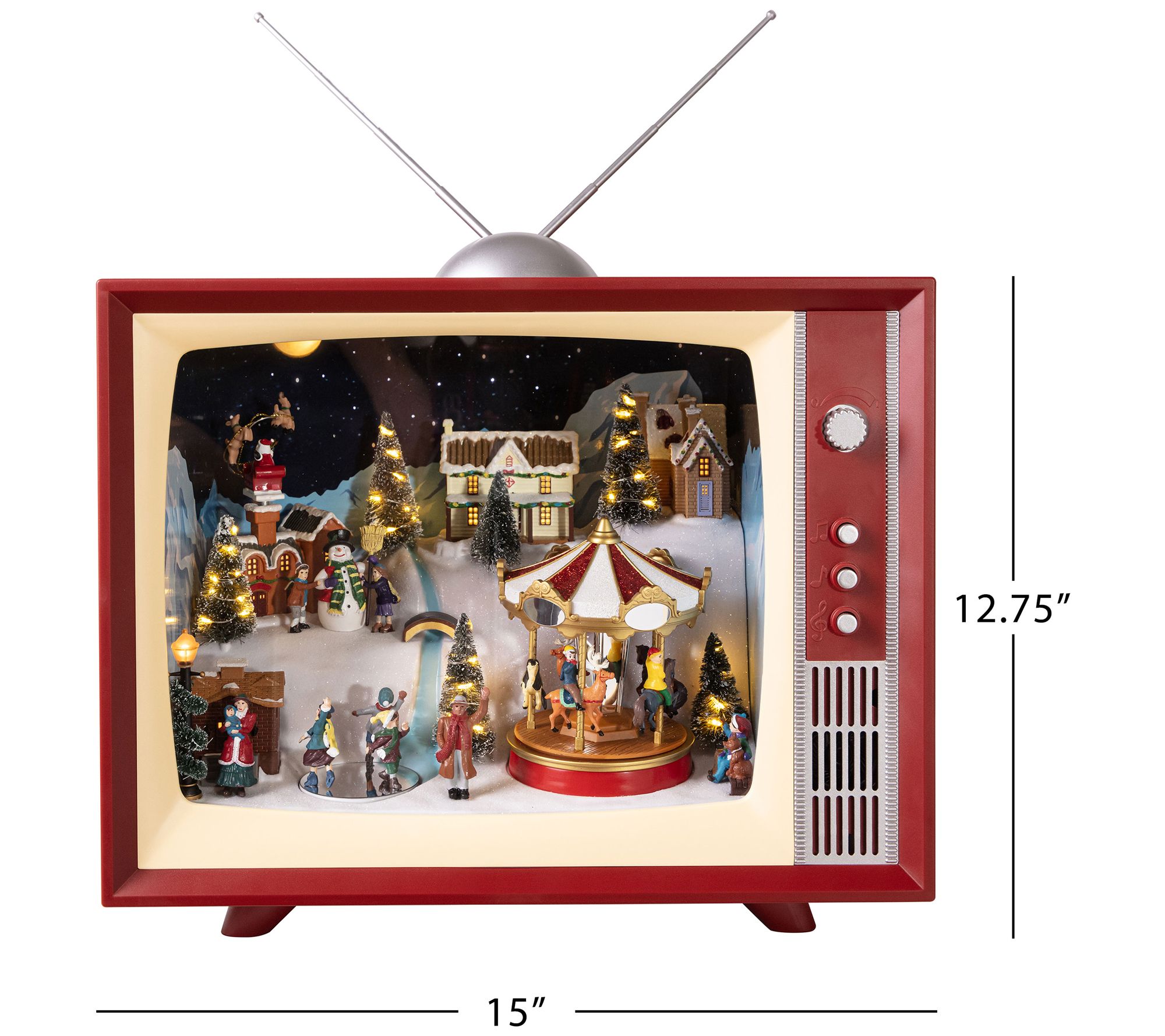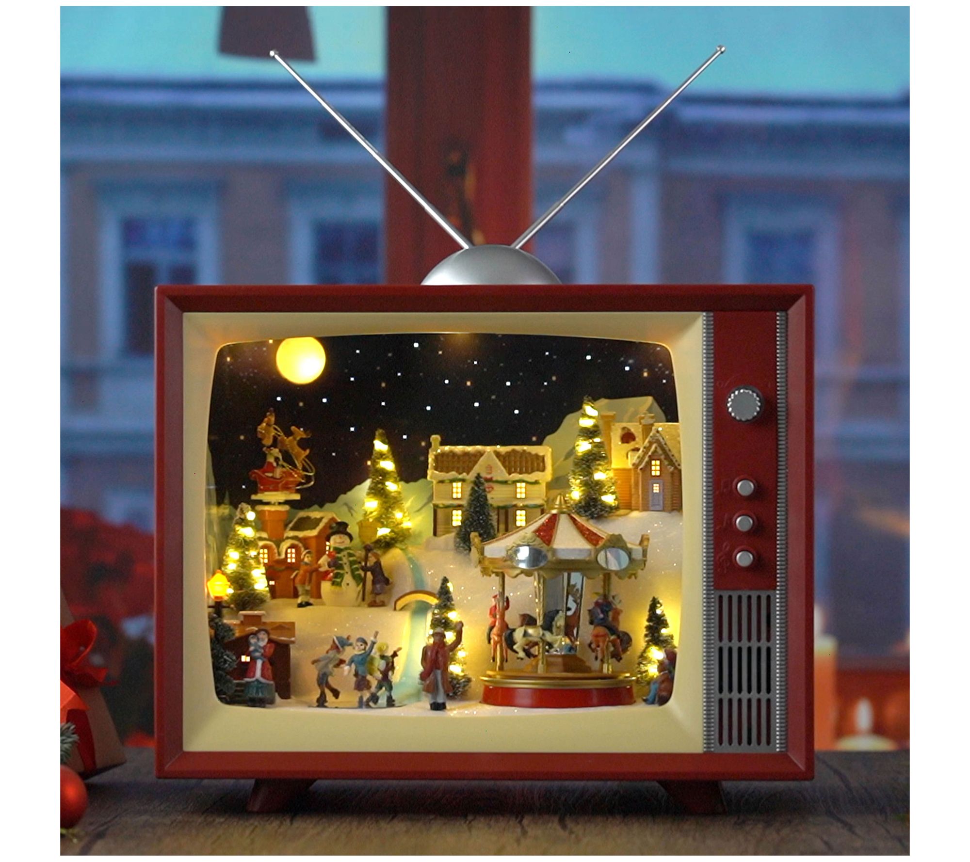 Capture the nostalgia of the holiday season with this fun vintage-inspired television that features a classic rabbit-ears antenna, traditional music, and an animated scene of a sleigh, carousel, and skaters. From Mr. Christmas.