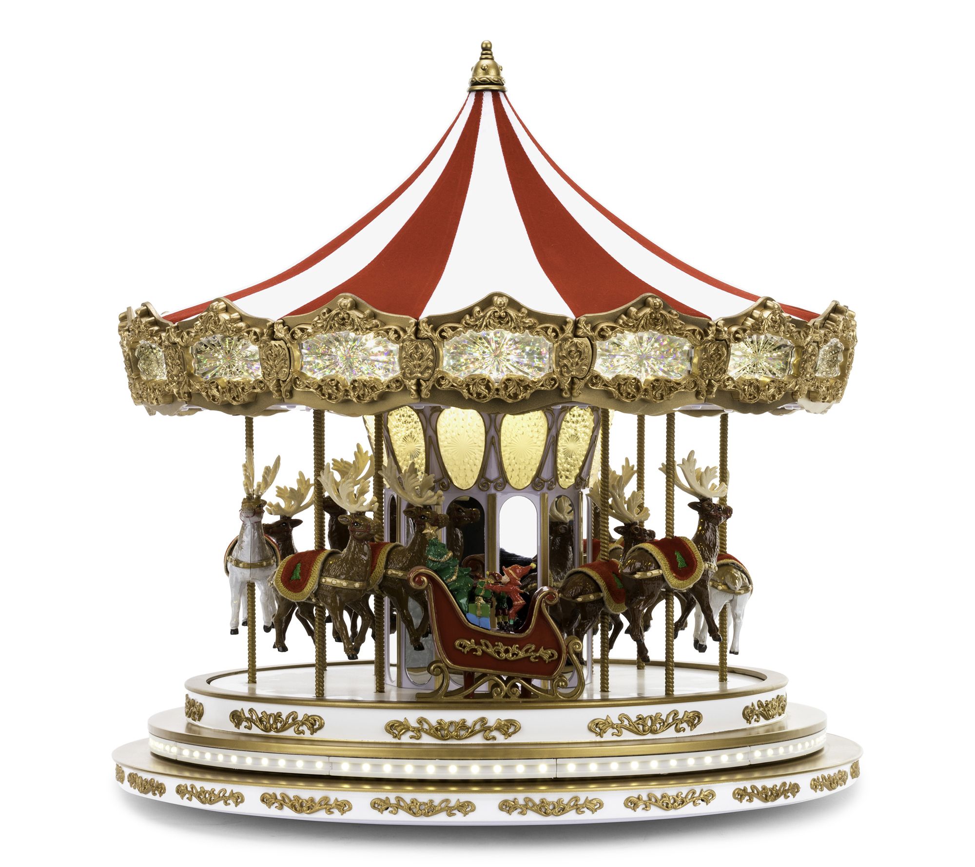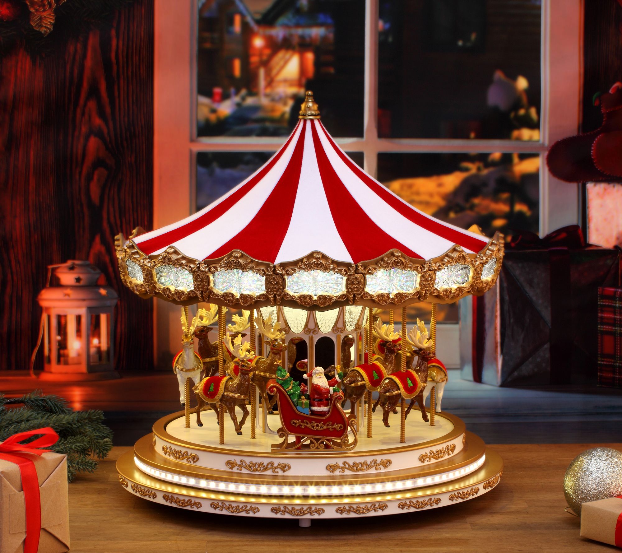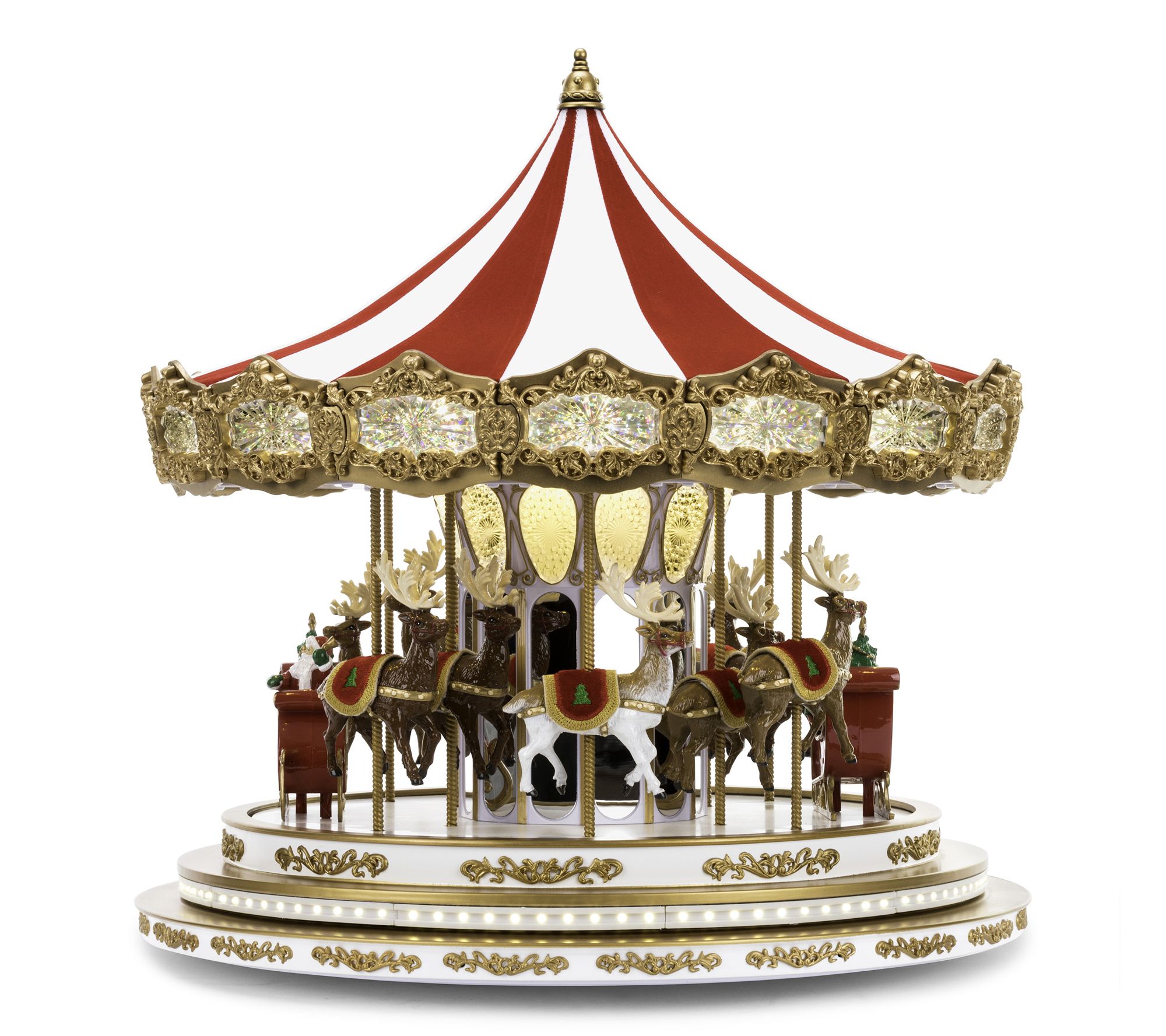 Regal and charming, this detailed and illuminated Christmas carousel turns while reindeer move up and down and Christmas carols play. From Mr. Christmas.