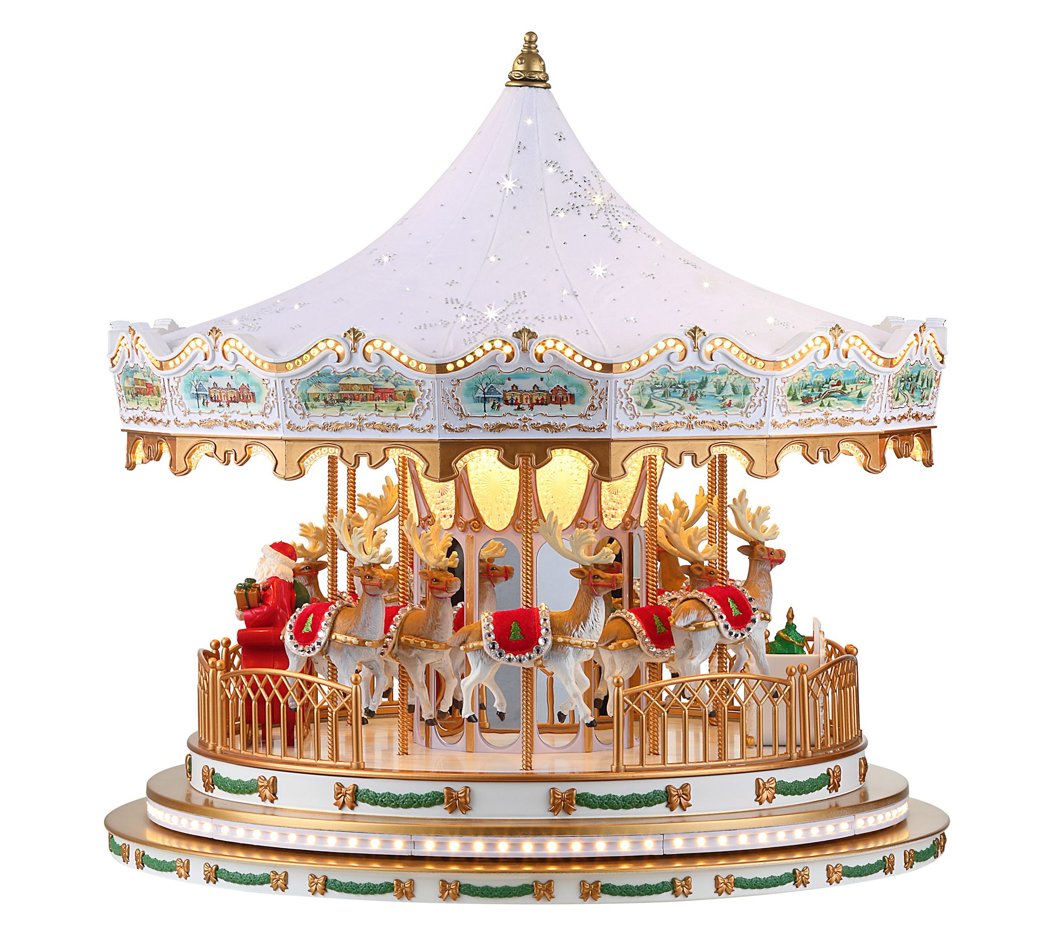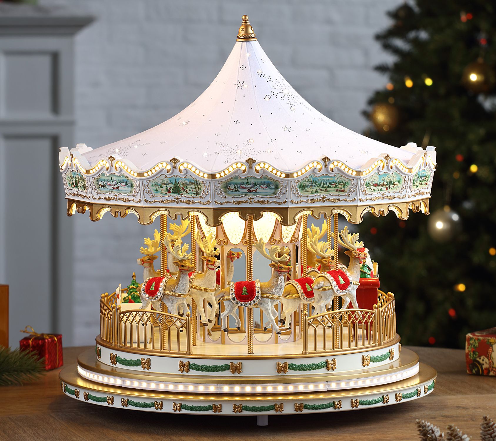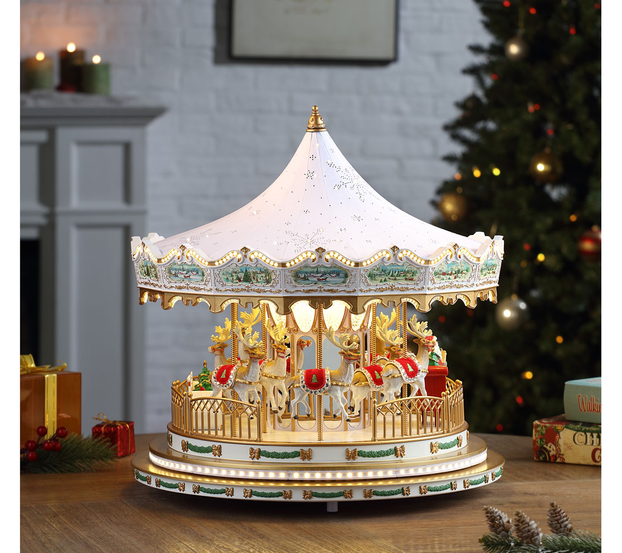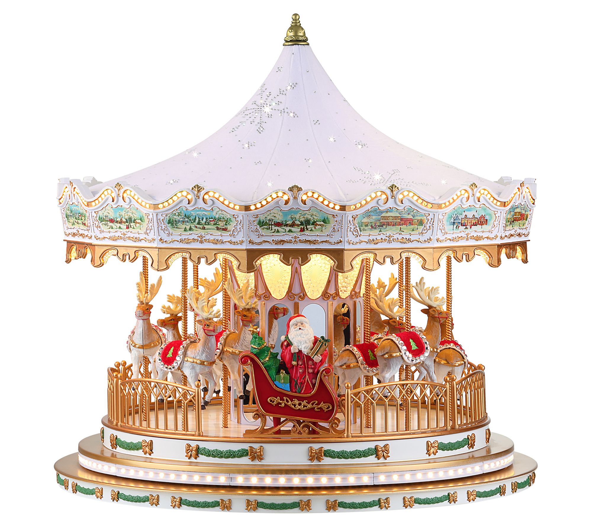 Bring a touch of magic to your holiday decor with the enchanting Deluxe Christmas Carousel by Mr. Christmas. Watch as Santa and Reindeer figures rise and fall to 20 beloved Christmas carols, all while the carousel's 300 LED lights create a mesmerizing light show. From Mr. Christmas.