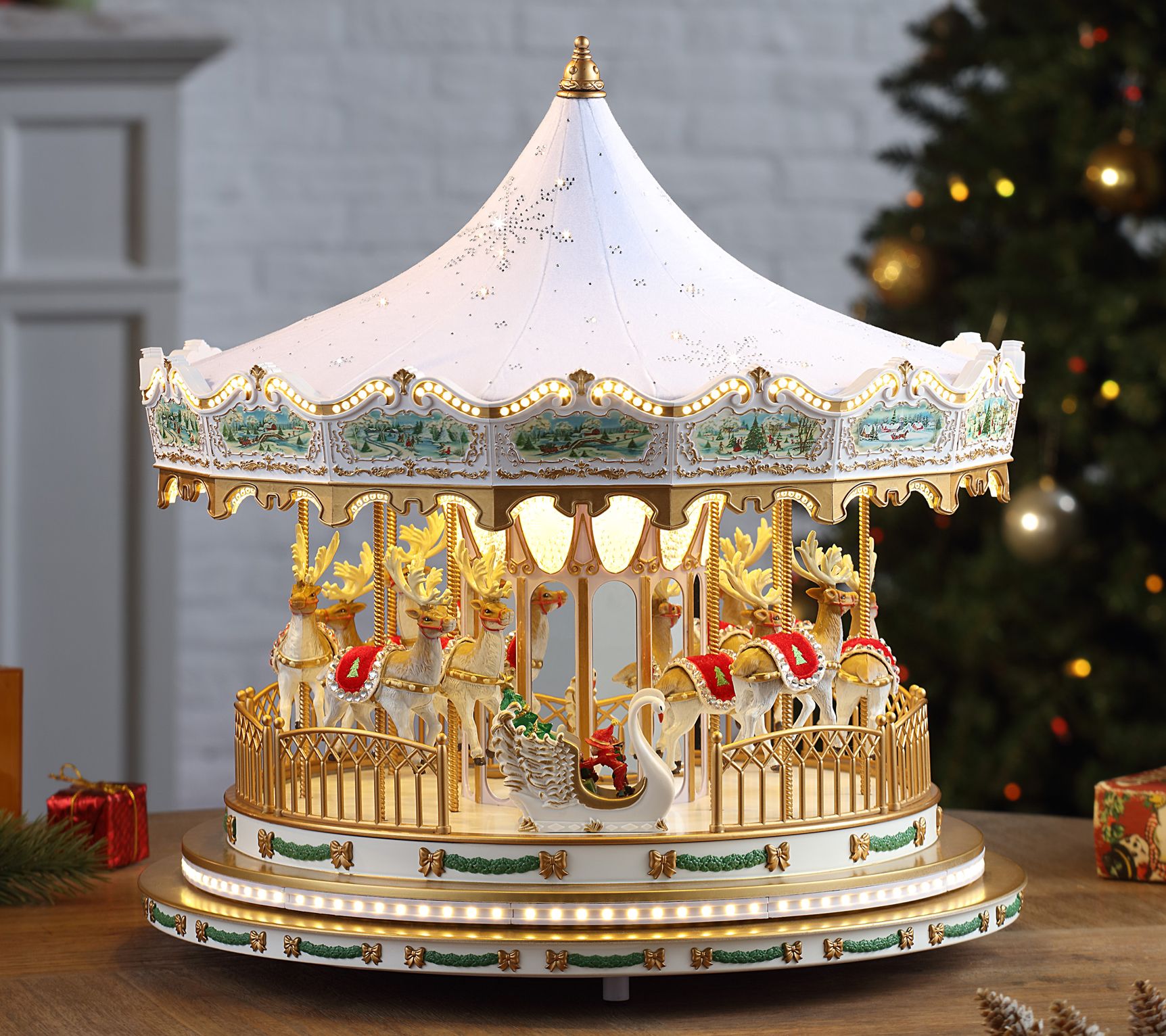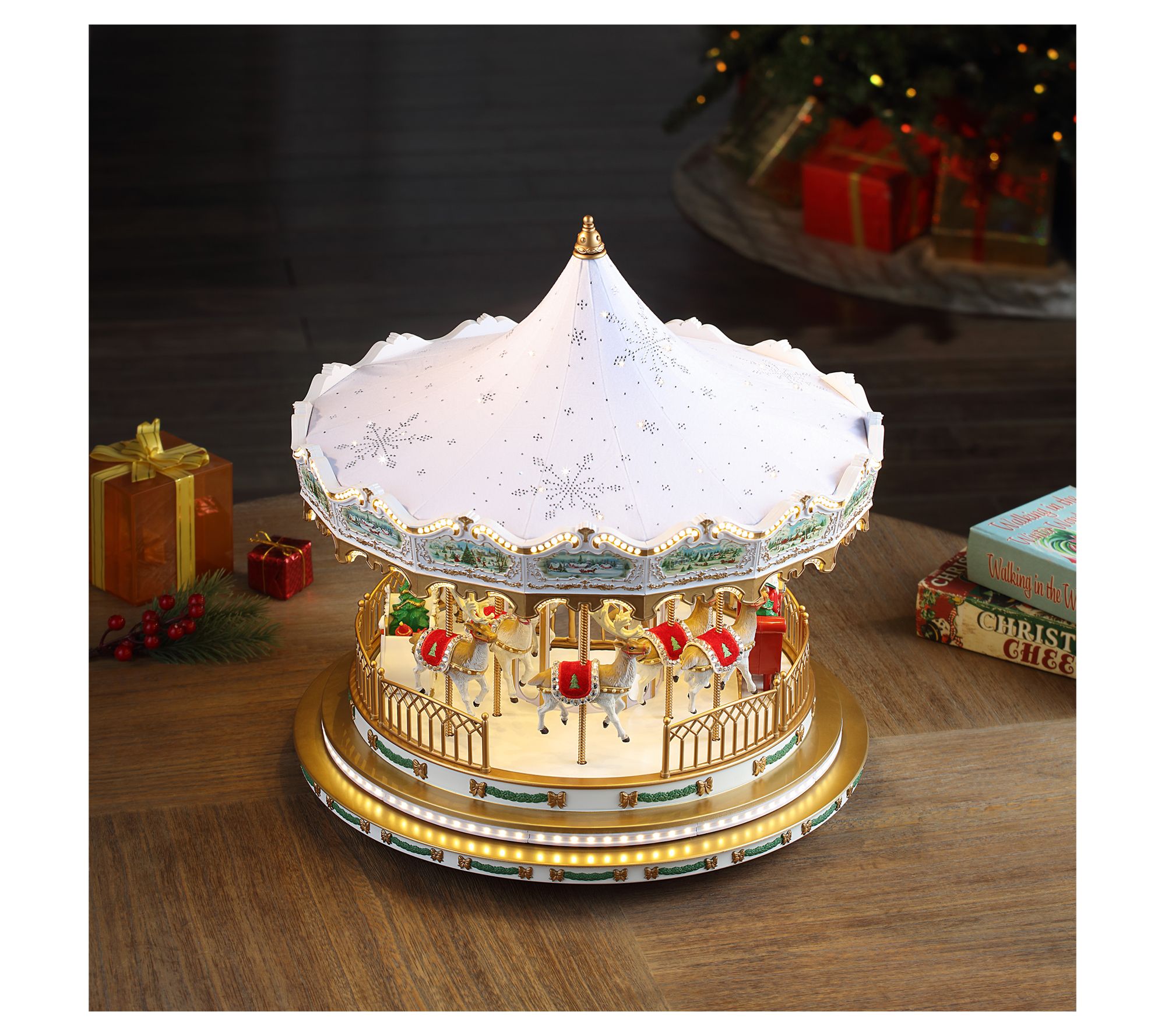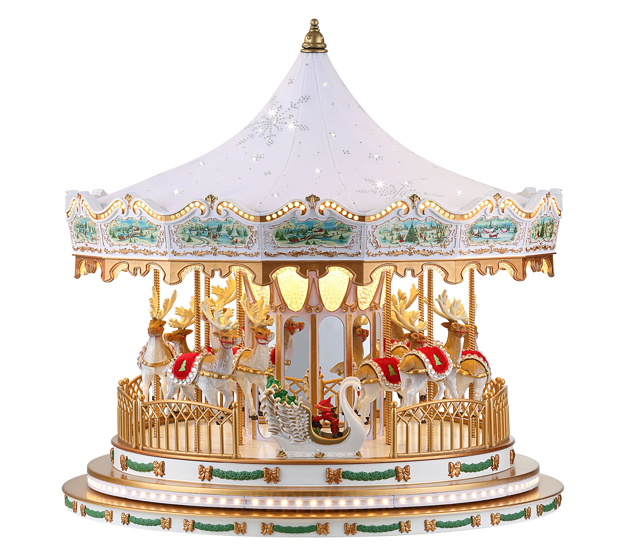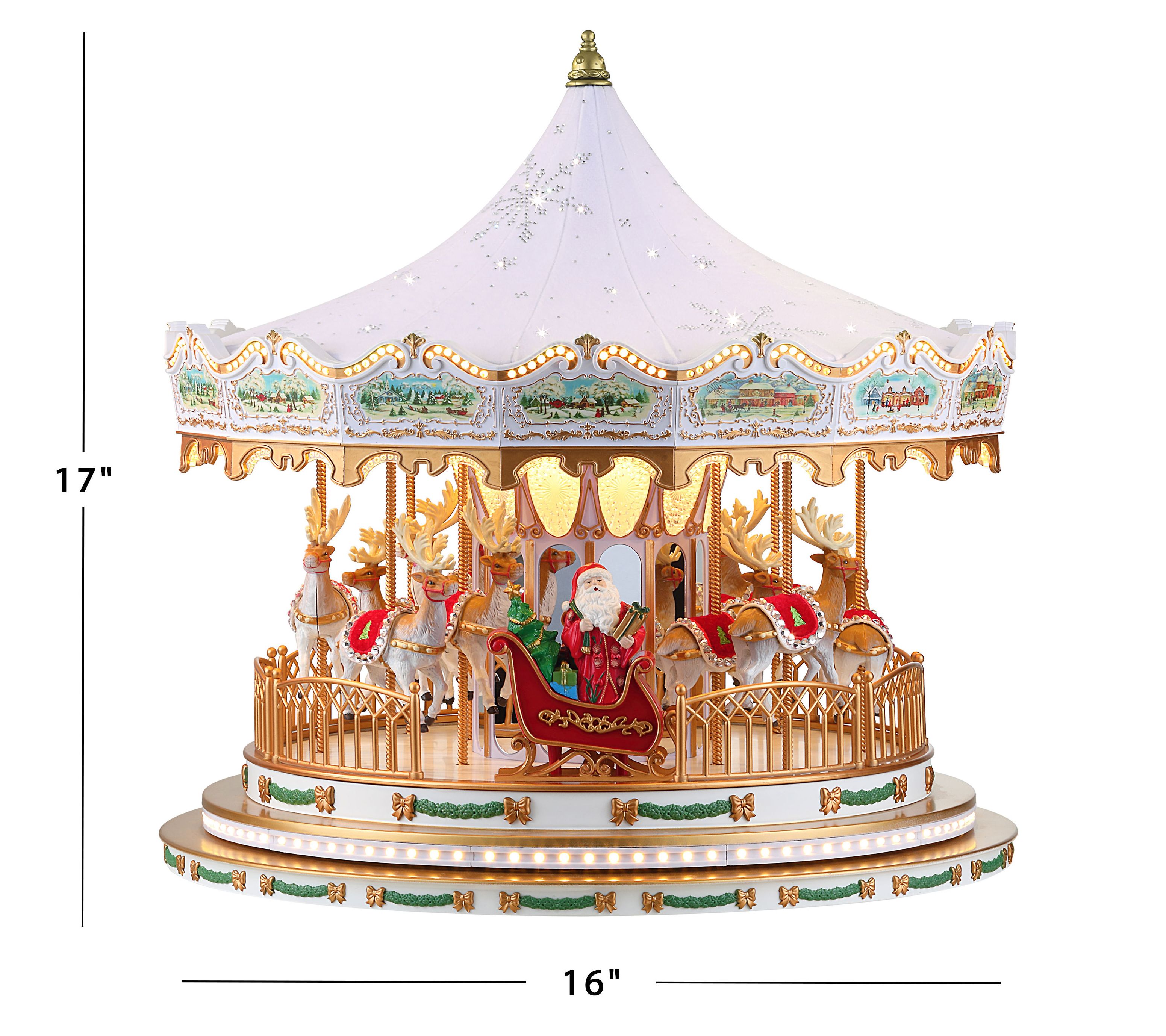 Bring a touch of magic to your holiday decor with the enchanting Deluxe Christmas Carousel by Mr. Christmas. Watch as Santa and Reindeer figures rise and fall to 20 beloved Christmas carols, all while the carousel's 300 LED lights create a mesmerizing light show. From Mr. Christmas.