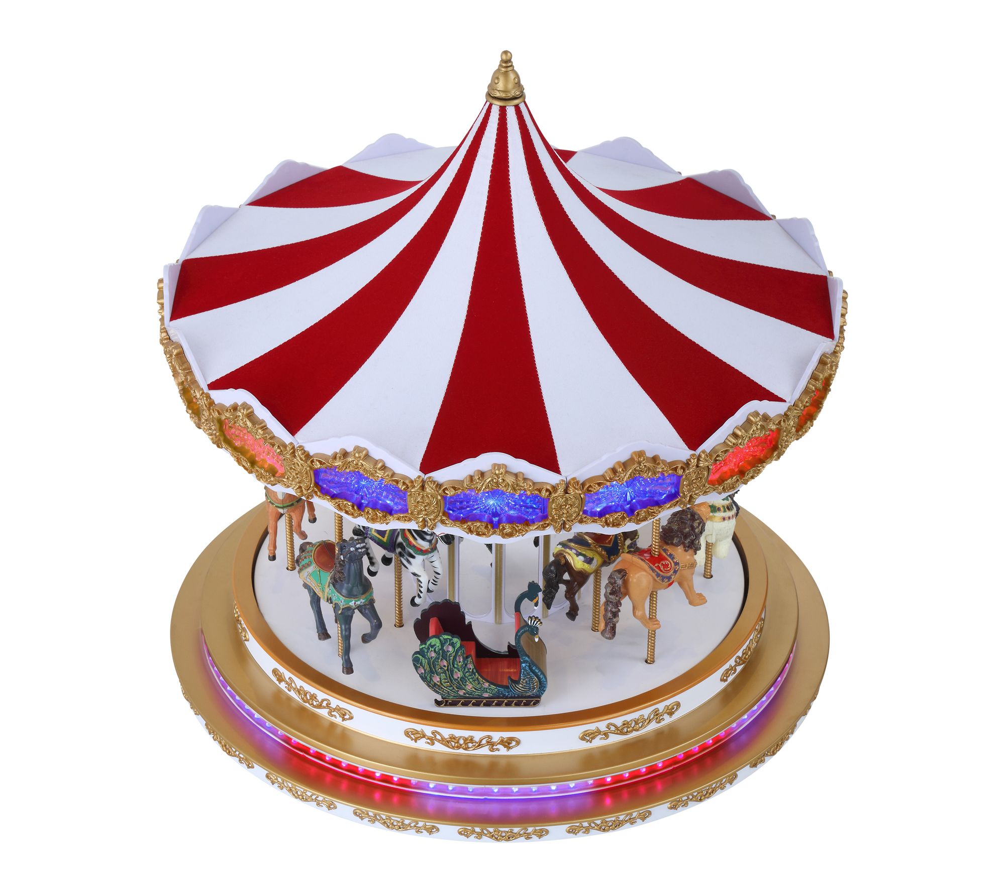 Holiday memories come alive with this Christmas carousel, where intricately painted Santa and reindeer figures revolve beneath an array of color-changing LEDs. Select from twelve dynamic light shows to create a breathtaking display that captivates family and guests. Brighten your celebrations with a festive centerpiece that brings elegance and magic to any room. From Mr. Christmas.