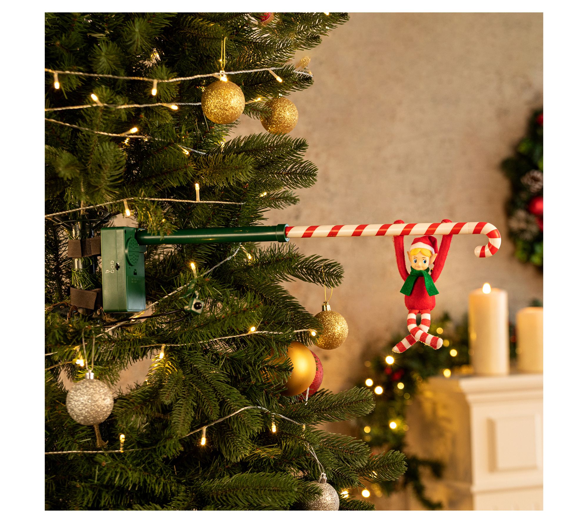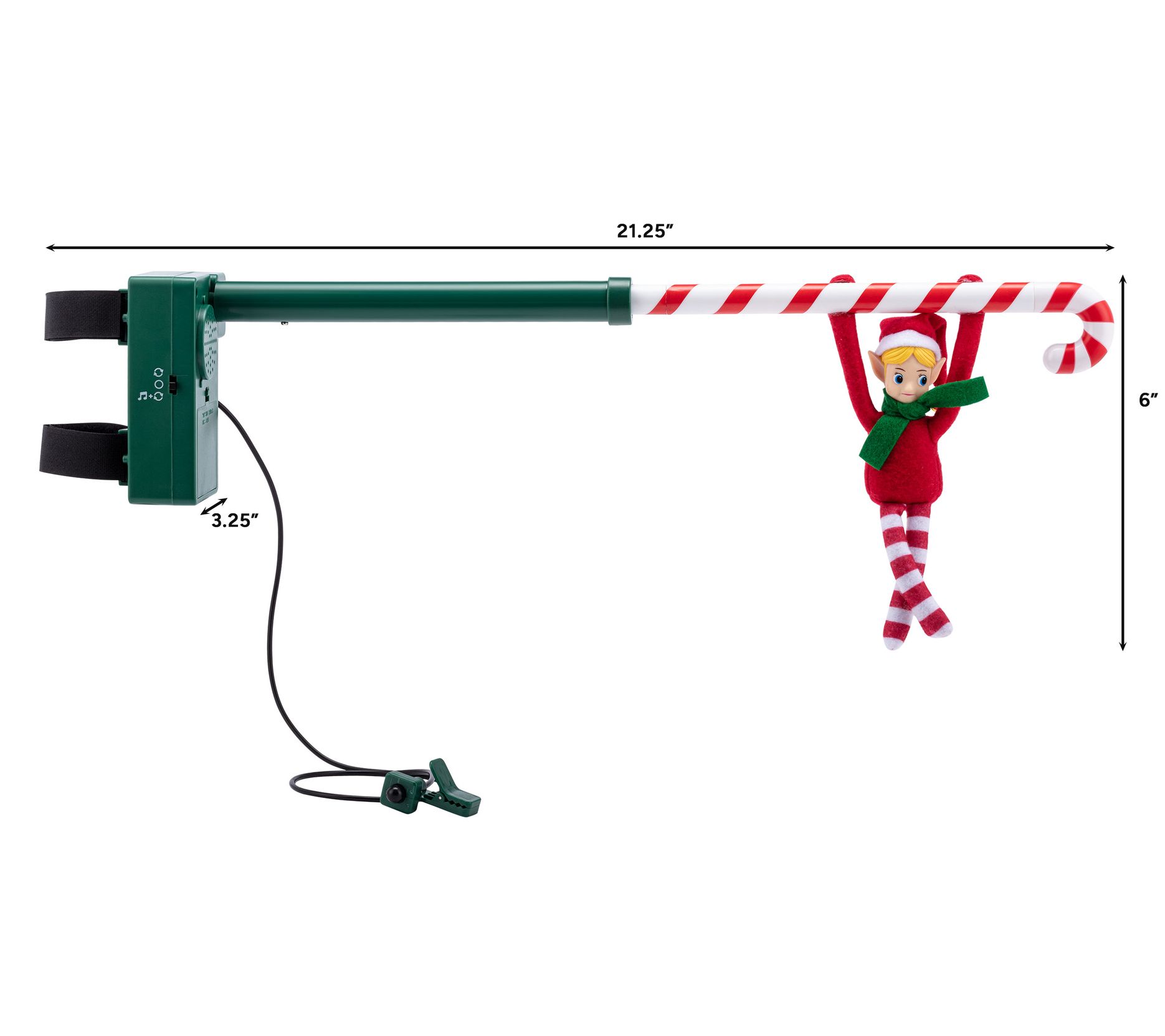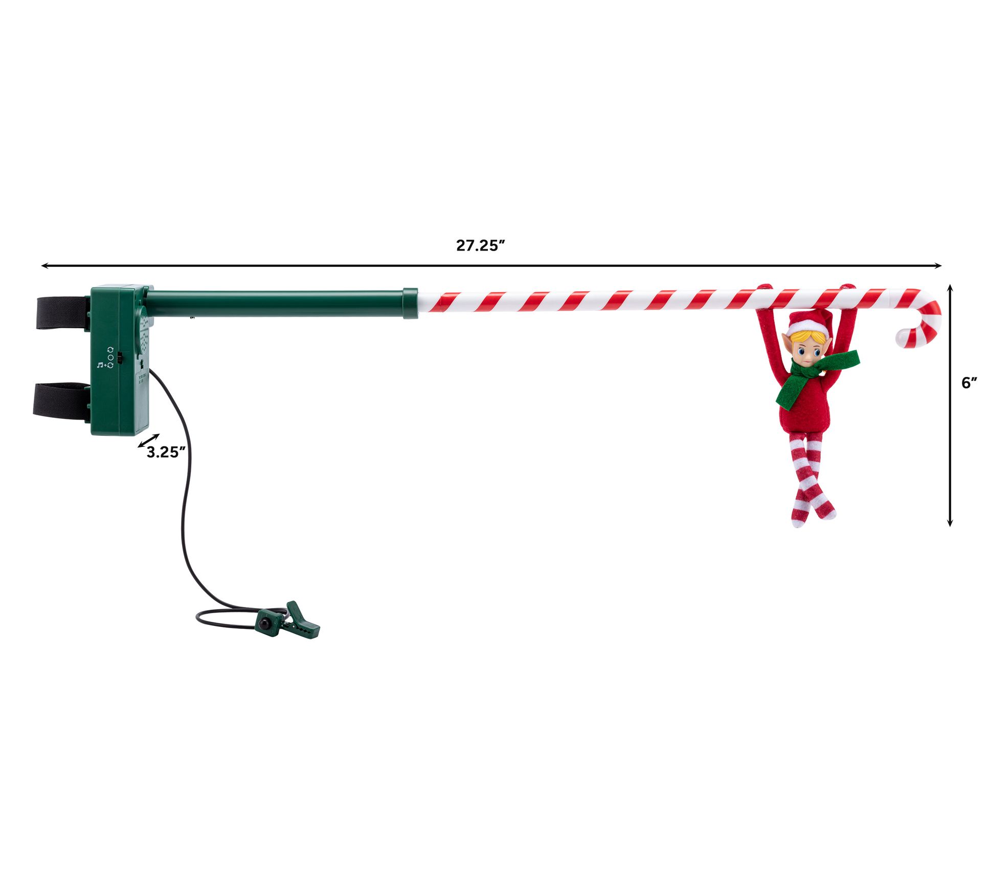 Add a touch of whimsical charm to your holiday decor with the Mr. Christmas 6" Animated Candy Cane Elf Acrobat. This delightful decoration features a fabric elf performing acrobatic flips on a candy cane pole, activated by a motion sensor. With three classic Christmas songs to choose from, it brings festive cheer to any home. From Mr. Christmas.