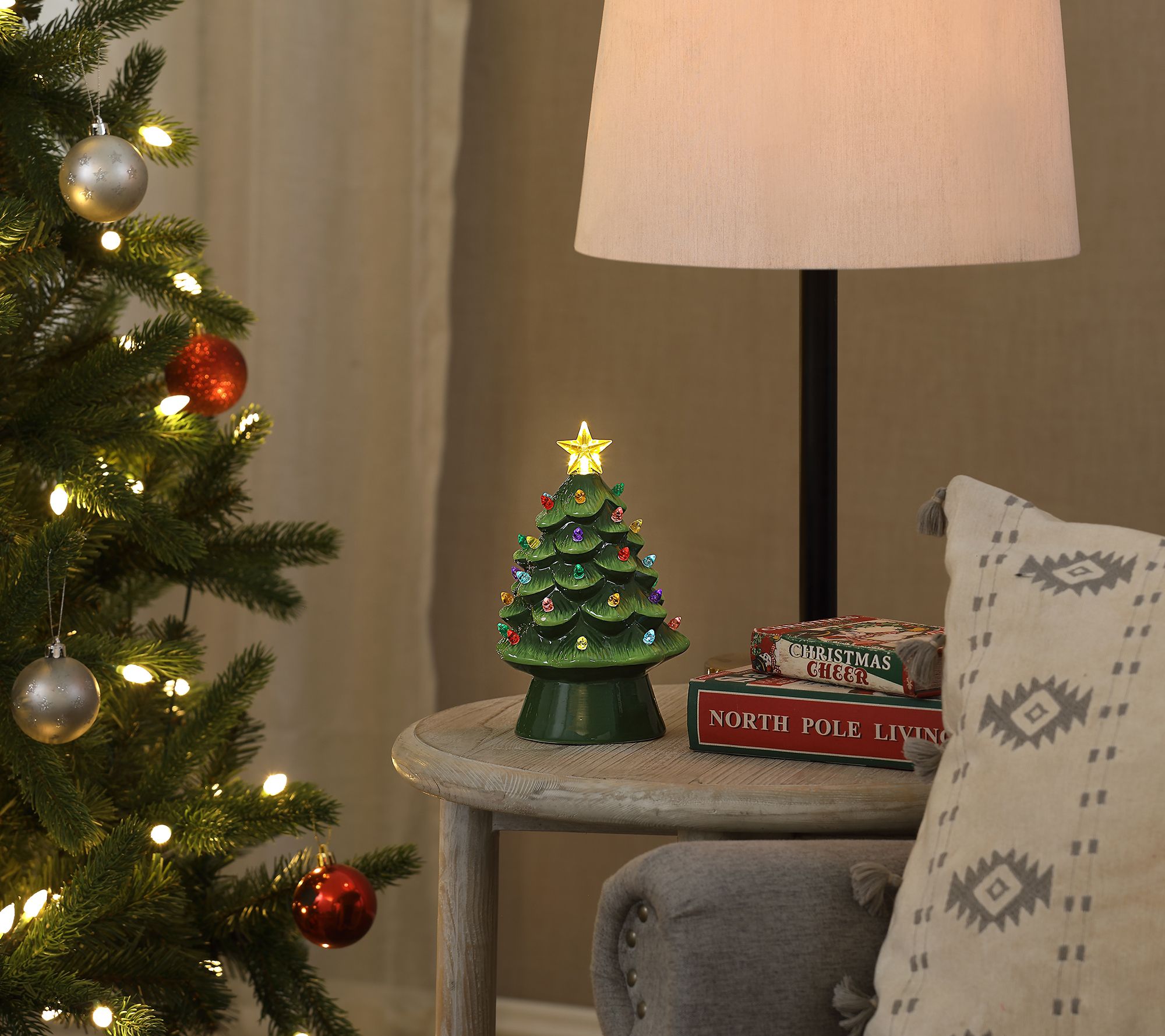 Bring a touch of vintage charm to your home with the Mr. Christmas 8" nostalgic ceramic tree. This delightful piece is inspired by classic holiday decor, featuring LED lights that glow through faceted bulbs and a bright yellow star on top. Perfect for mantels, side tables, or bookshelves, it adds a festive touch wherever it's placed. From Mr. Christmas.