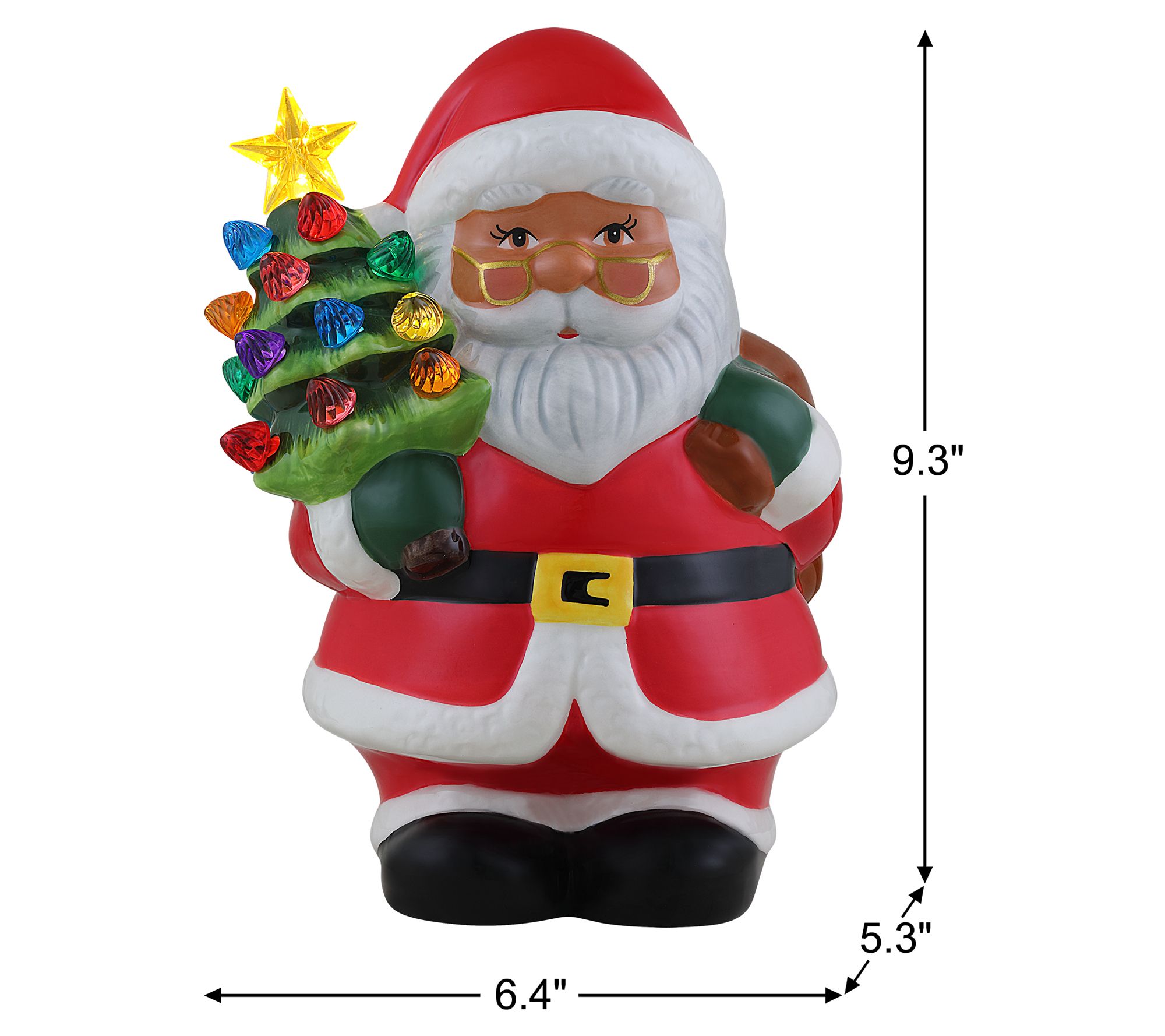 Bring the nostalgic charm of Christmases past into your home with this 9"H ceramic Santa figure. Dressed in his jolly red outfit, Santa holds a green tree illuminated with multi-colored LED lights, topped with a glowing yellow star. Perfect for your mantel, table, or windowsill, this festive figure adds a touch of holiday cheer wherever you place it. From Mr. Christmas.