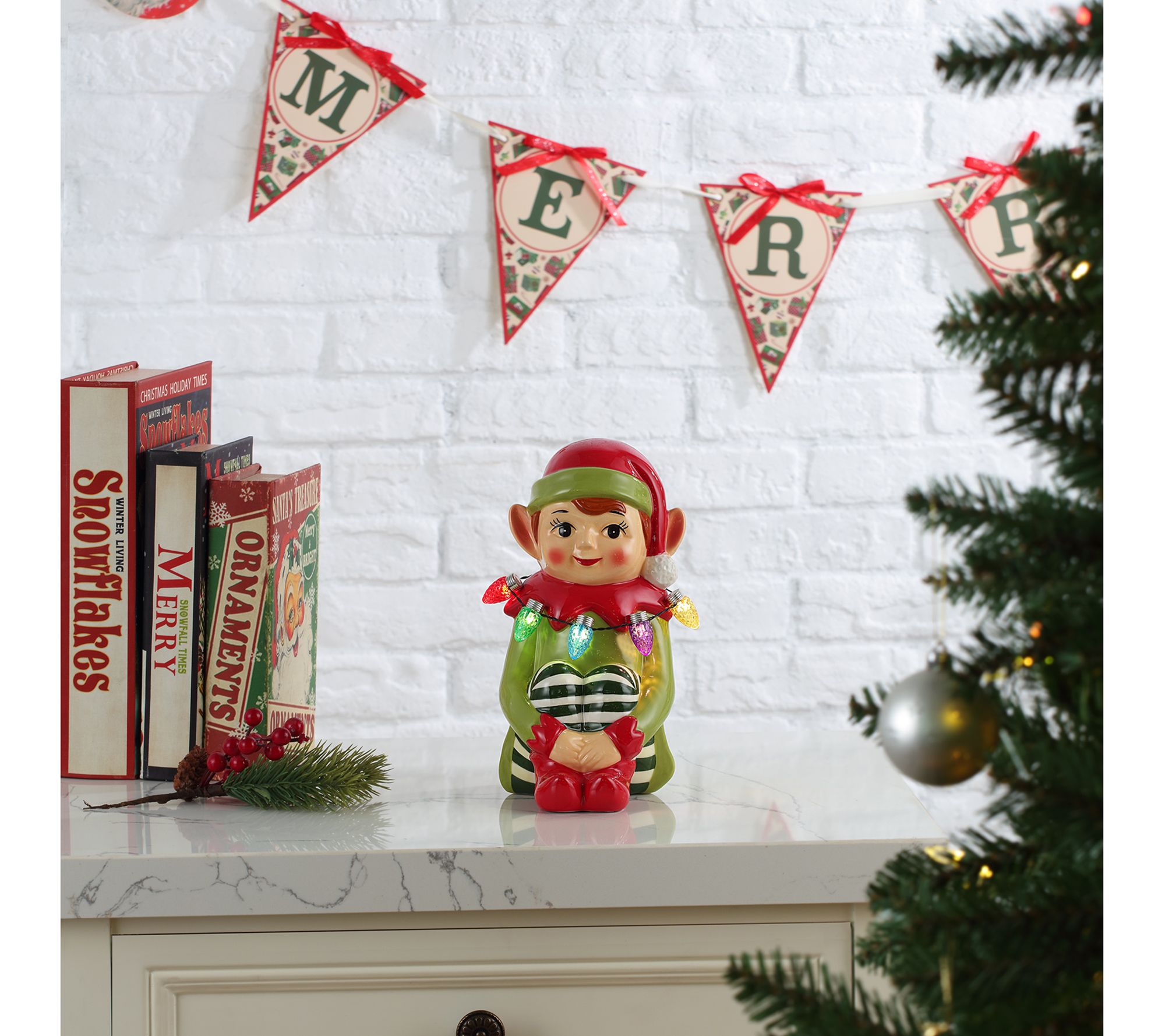 Bring home some nostalgic cheer with the Mr. Christmas 9" ceramic elf. This highly-detailed knee-hugging elf wears an adorable striped outfit and a necklace of LED Christmas lights, perfect for adding a touch of Christmas magic to your mantel, table, or windowsill. From Mr. Christmas.