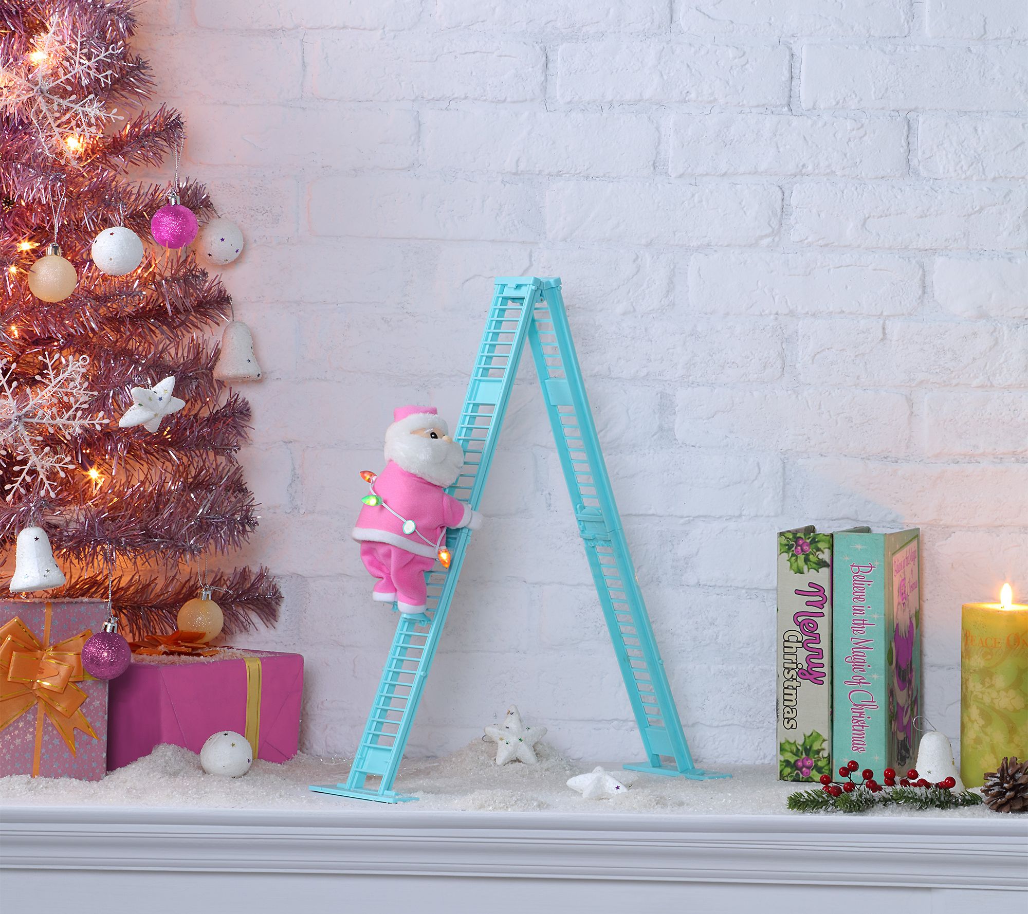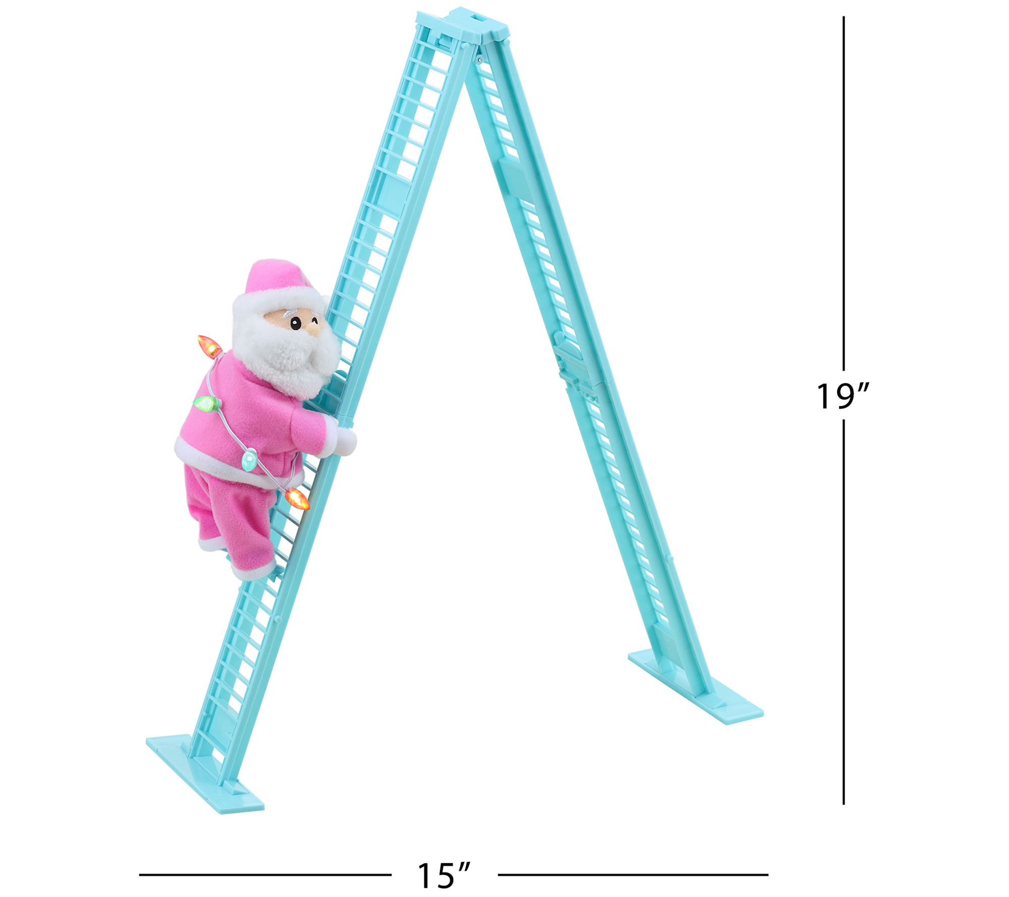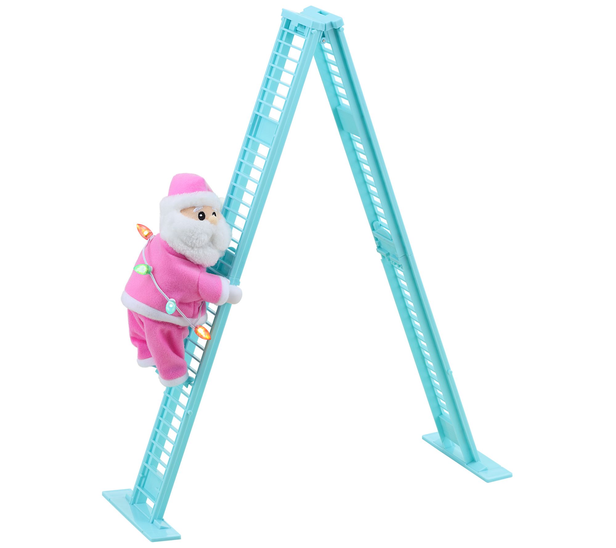 Dressed in a pastel outfit and holding a string of multicolored LED lights as he climbs a ladder, this fun Santa is ready to deliver a load of holiday cheer to a windowsill, mantel, or table. From Mr. Christmas.