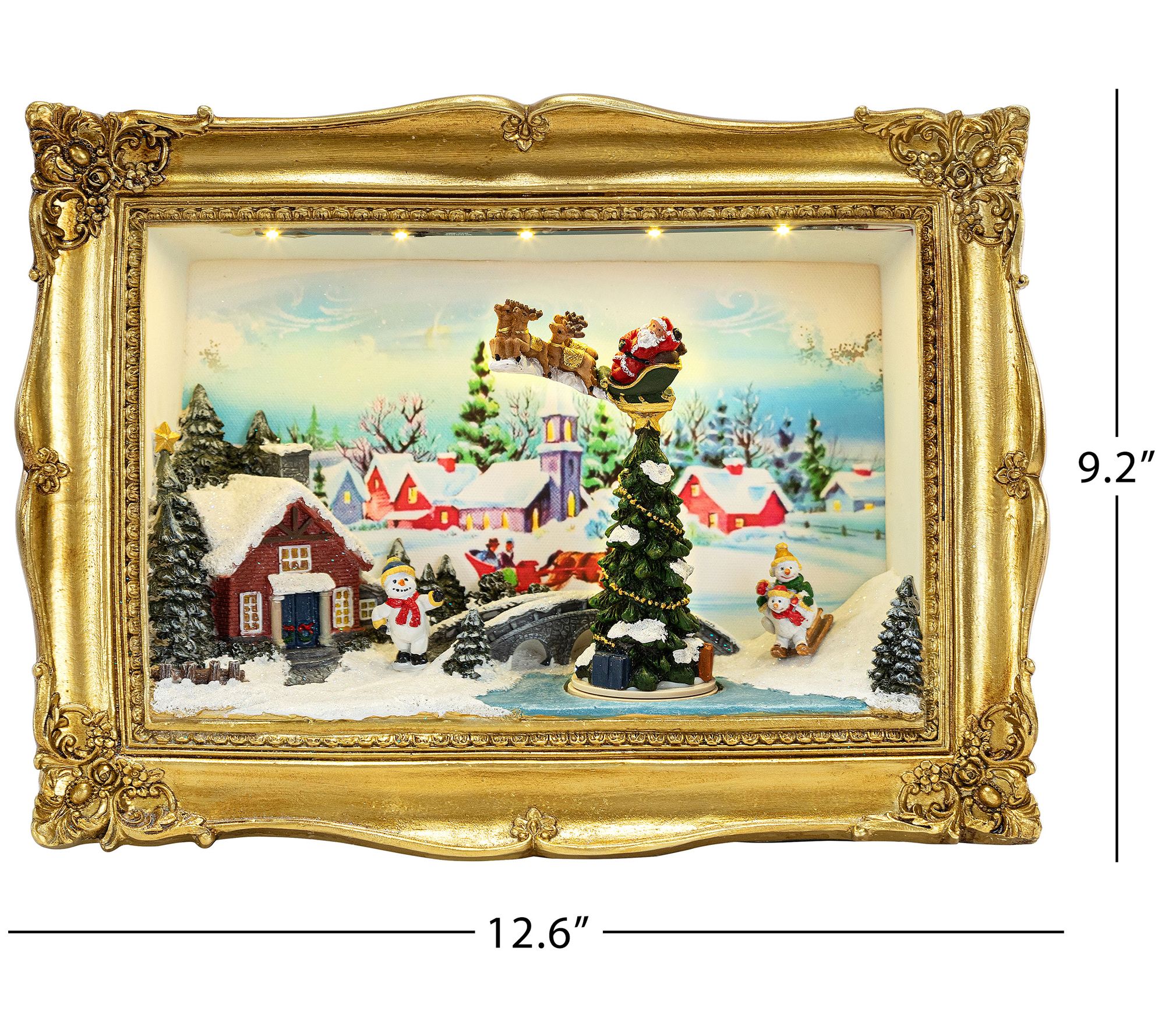 A beautiful goldtone frame sets the stage for a snowy Christmas scene full of magic with animation, bright LED illumination, and eight fun holiday tunes. From Mr. Christmas.