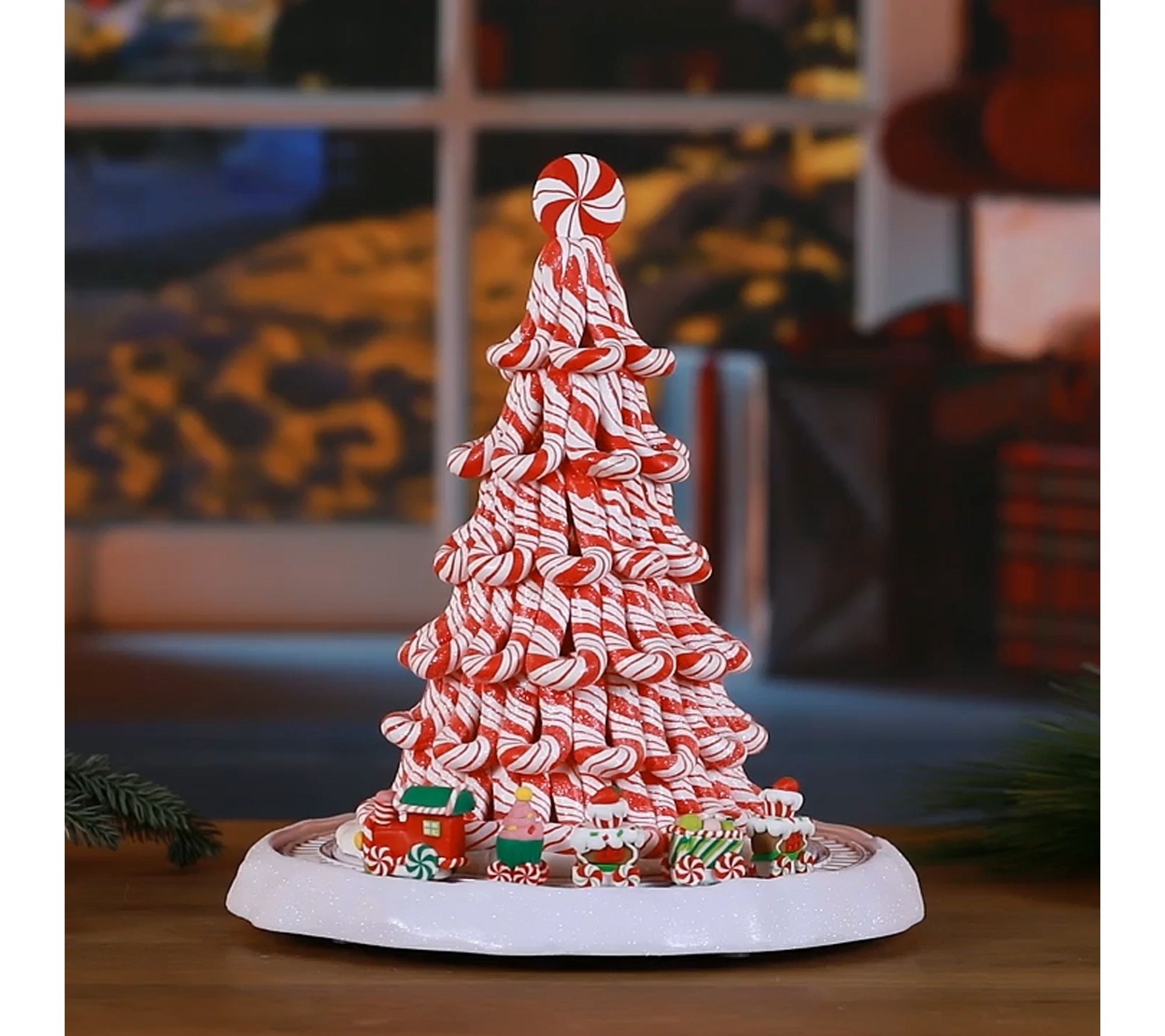 Bring a sprinkle of holiday magic to your home with this Peppermint Tree. Watch as a festive train made from classic holiday treats circles a glittery peppermint tree, illuminated by warm white LED lights and accompanied by the sounds of 15 Christmas carols. From Mr. Christmas.