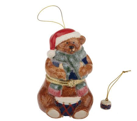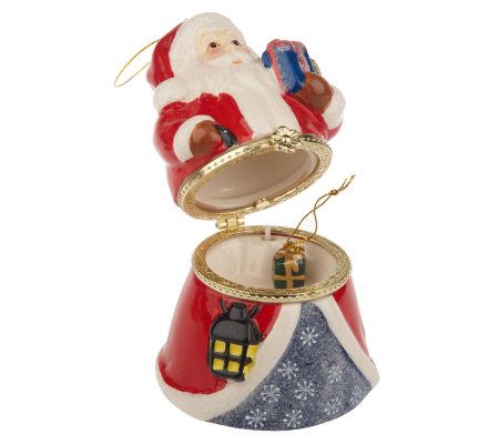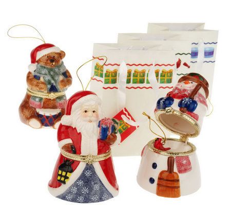 Enjoy the sights and the sounds of the holiday season with this keepsake trio of windup porcelain music boxes. Colorfully decorated in similar snowflake patterns, each features a different seasonal character and plays a different festive song. And the best part? Each opens to reveal a delightful surprise: a coordinating ornament. Display or give, individually or as a set. From Mr. Christmas.