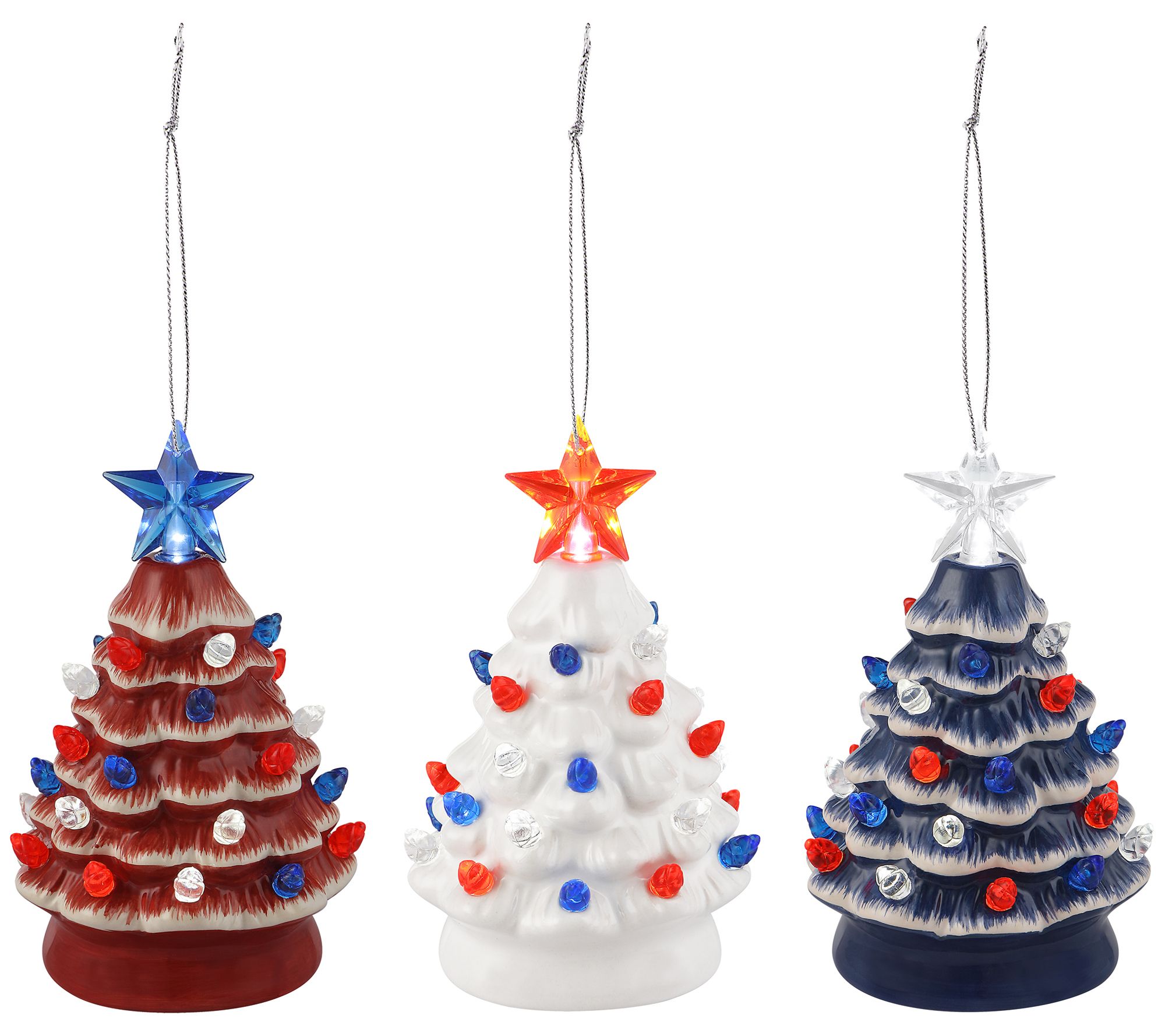 Show your patriotic pride during the holidays with this set of decorative Christmas trees, illuminated with red, white, and blue faceted bulbs. From Mr. Christmas.
