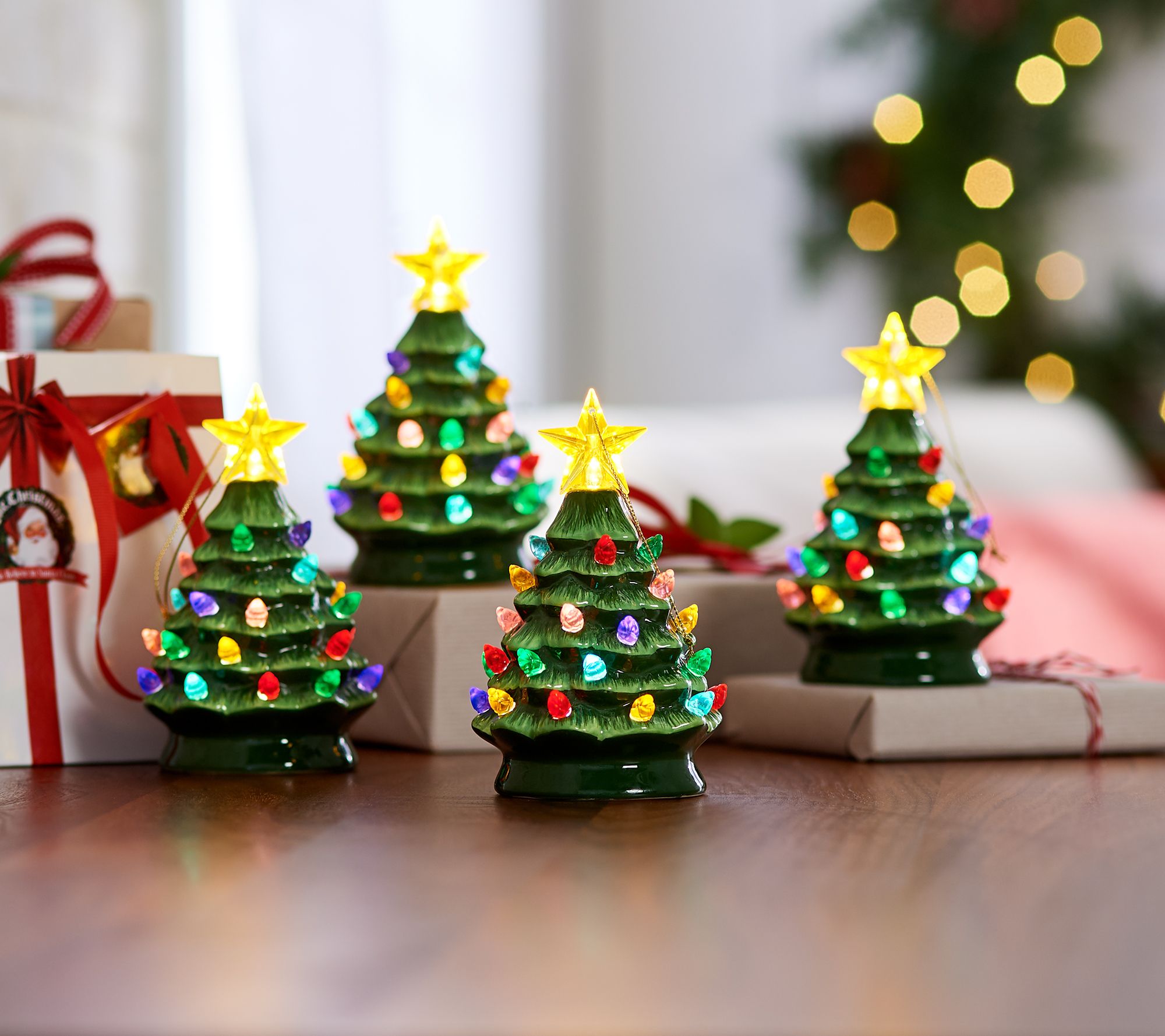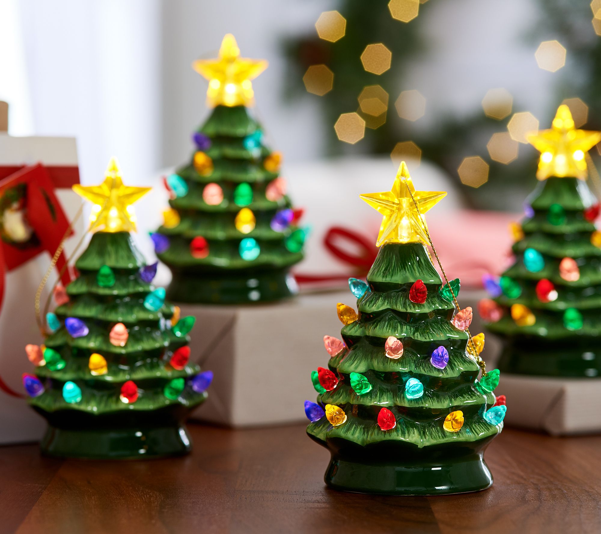 A merry little holiday awaits with these mini nostalgic tree ornaments. Their vintage-style design even lights up. From Mr. Christmas.