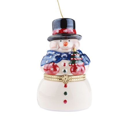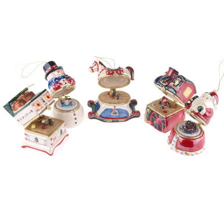 Start your season on the right note. These music box ornaments offer merry motifs for the tree as well as favorite festive melodies. Open the lid on each for miniature handpainted animated scenes that help liven holiday celebrations. From Mr. Christmas.