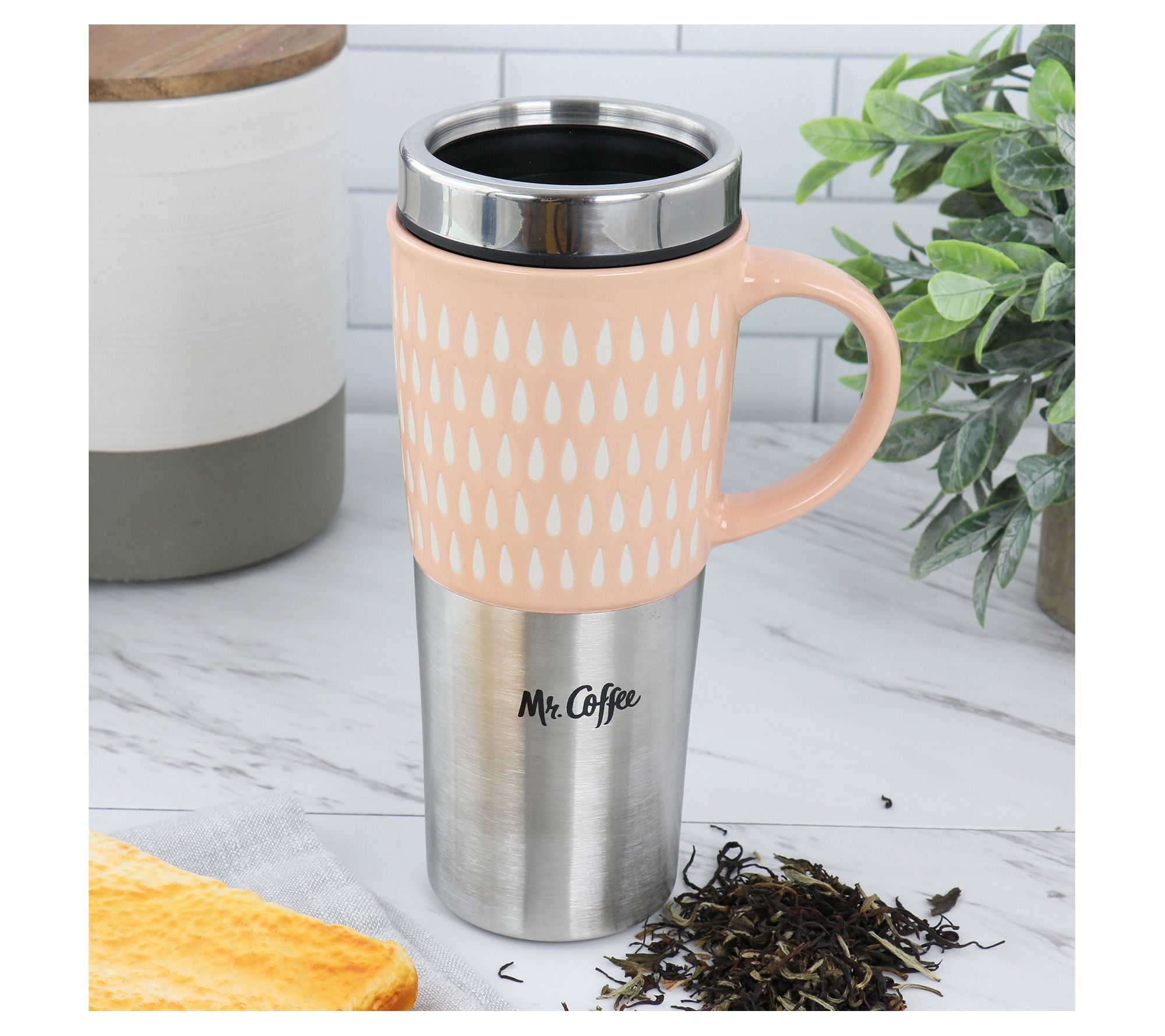Take your drink on the go with the Travertine, a stoneware and stainless steel travel mug that lets you enjoy your favorite beverages no matter where the day takes you. From Mr. Coffee.