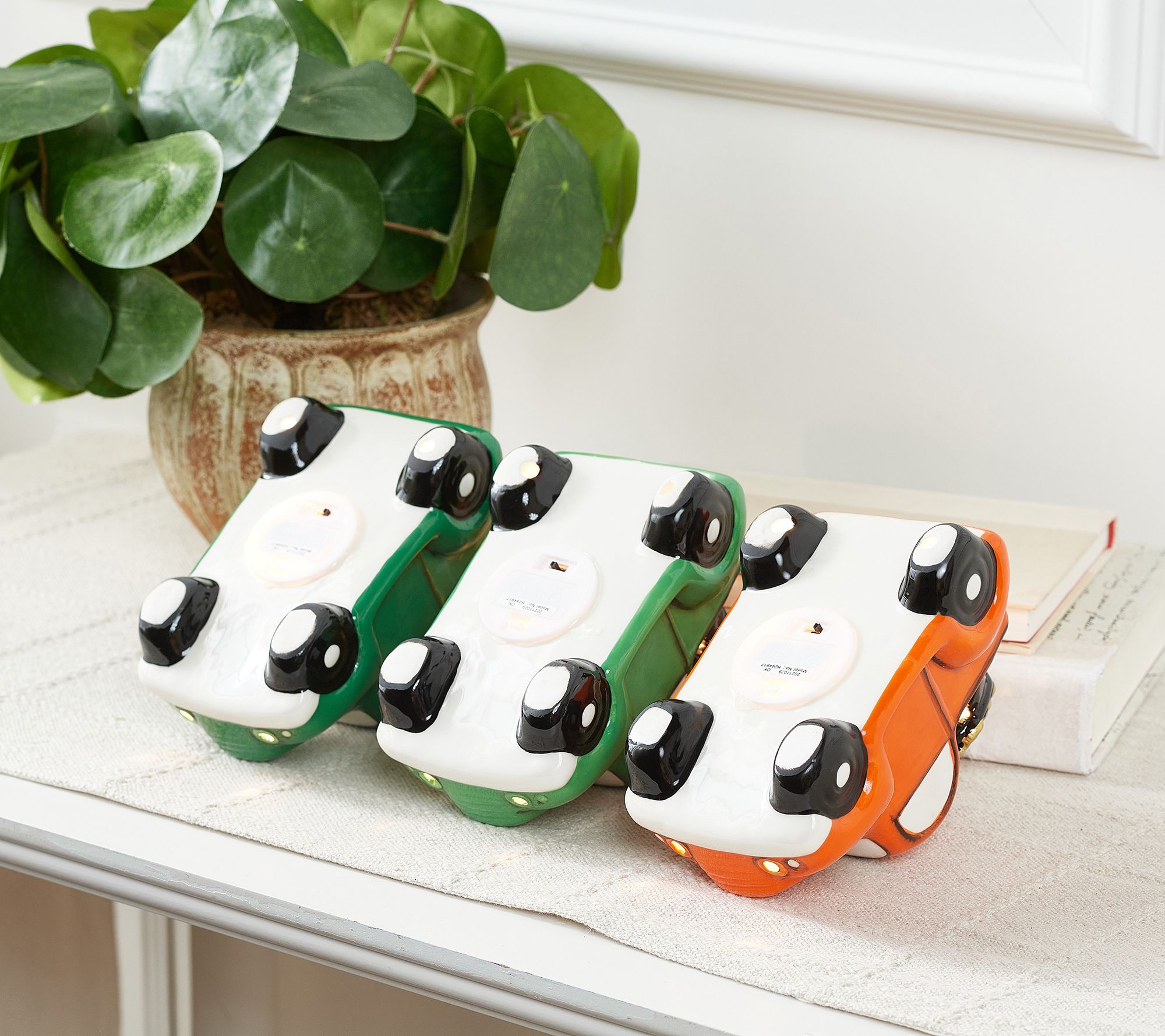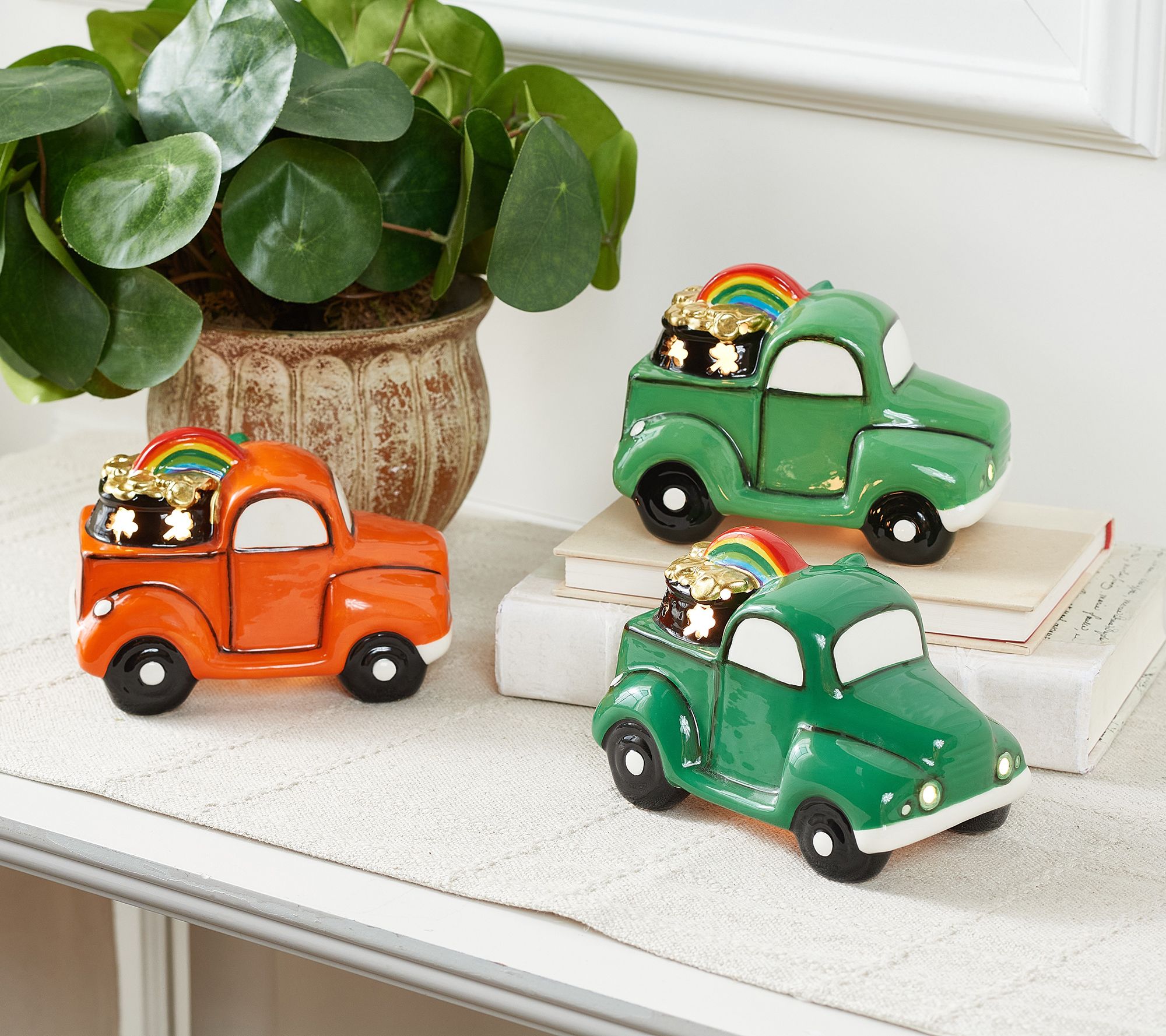 • Includes three St. Patrick's Day-themed mini illuminated pickup trucks