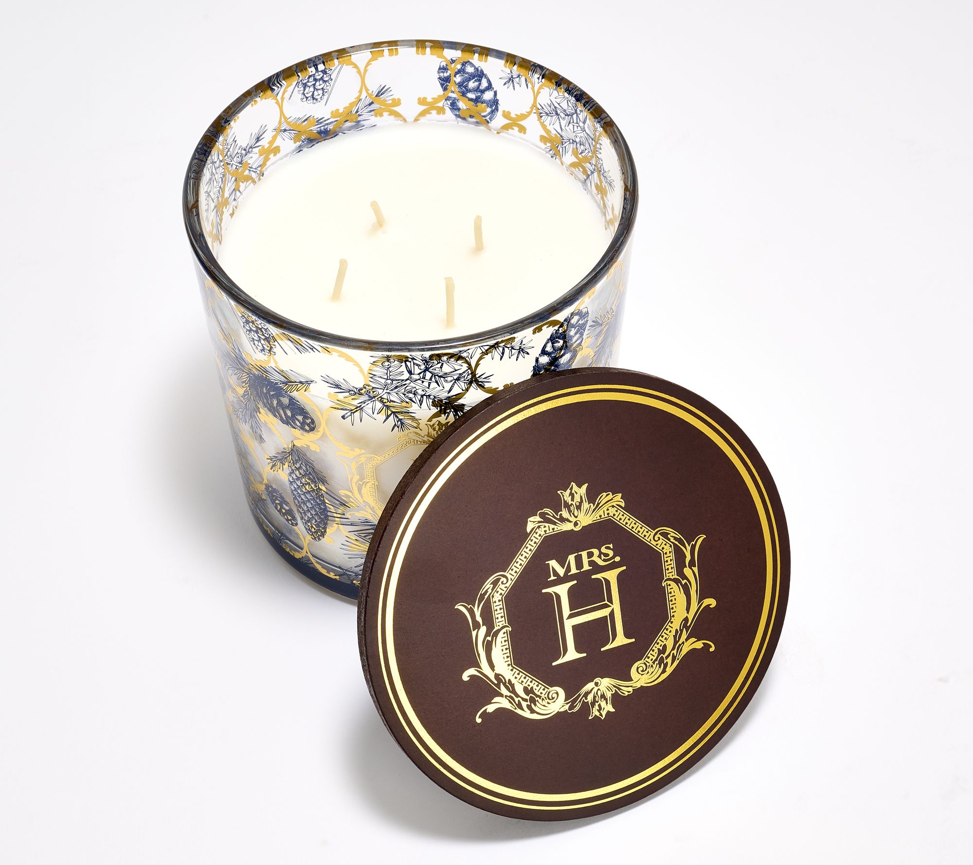 Glass vessel with custom-designed decal, dark wooden lid with goldtone brand logo
