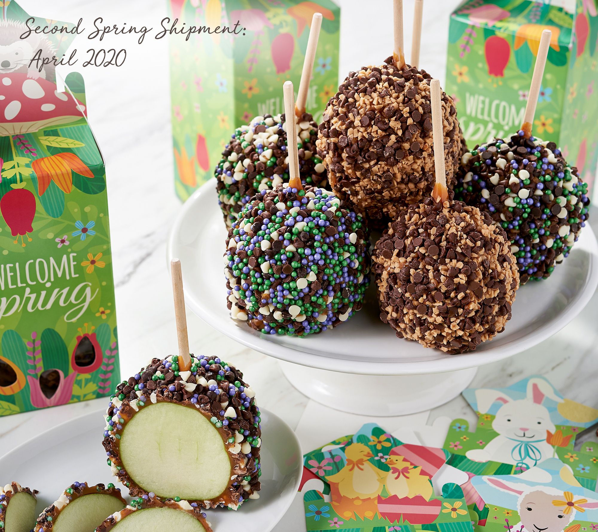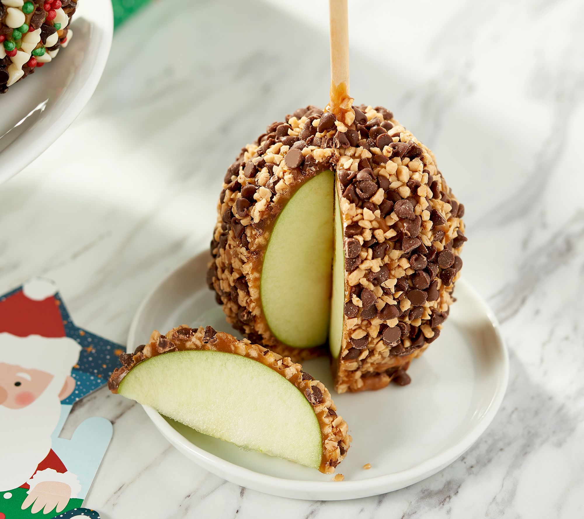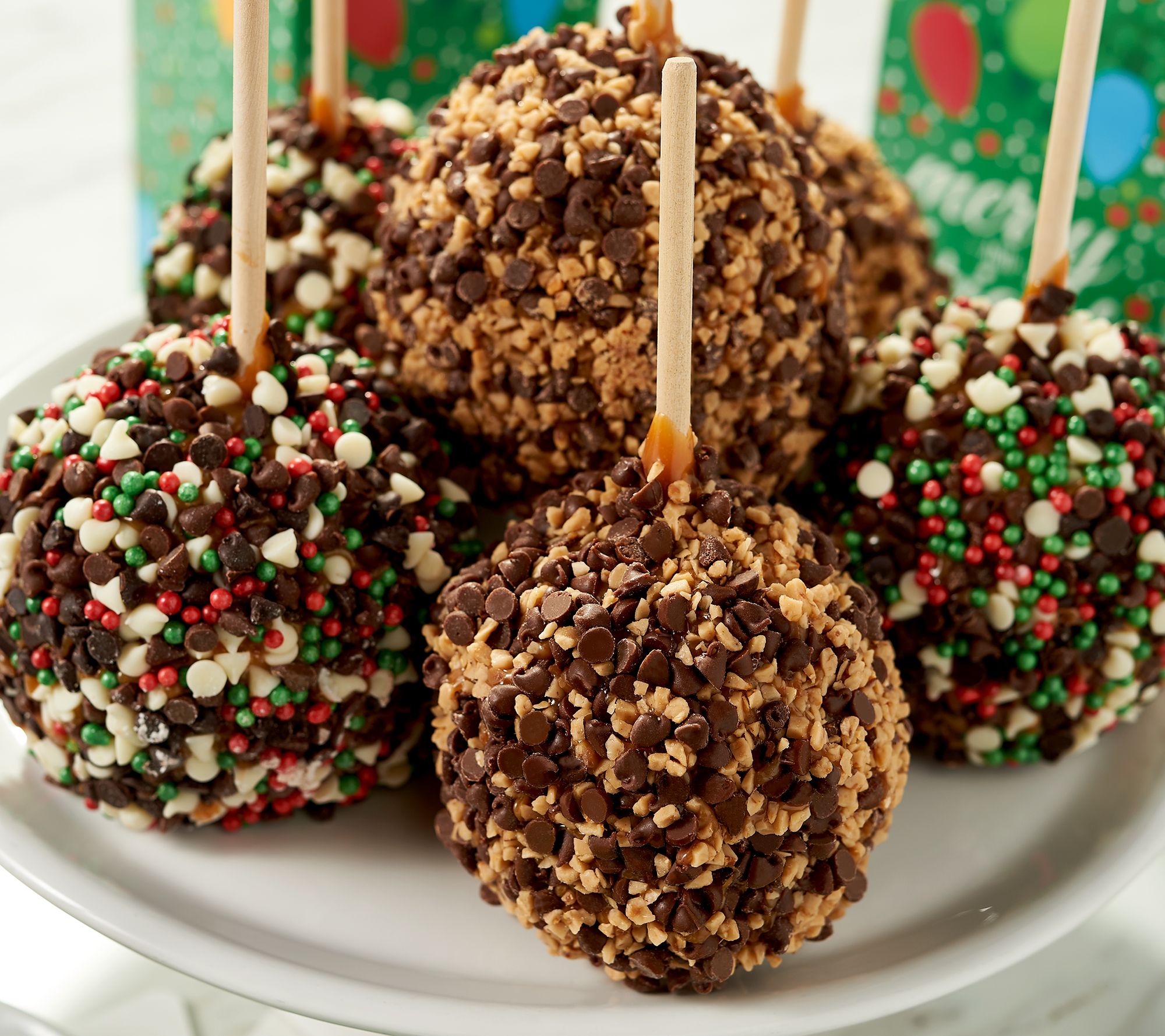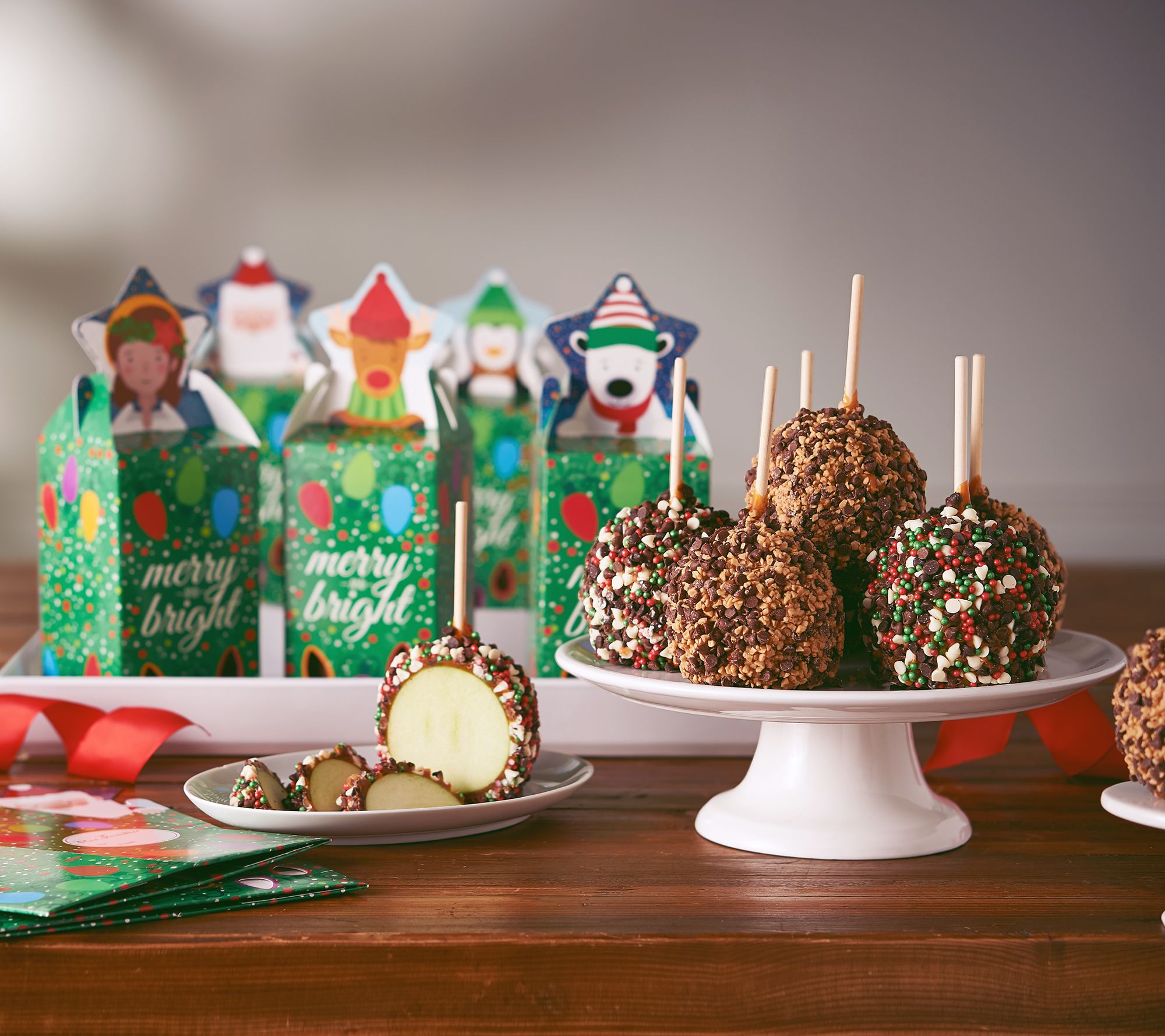 Includes 10 holiday gift boxes and 10 caramel apples: five each of triple chocolate chip apples with pearlescent sprinkles and five salted caramel milk chocolate chip and toffee