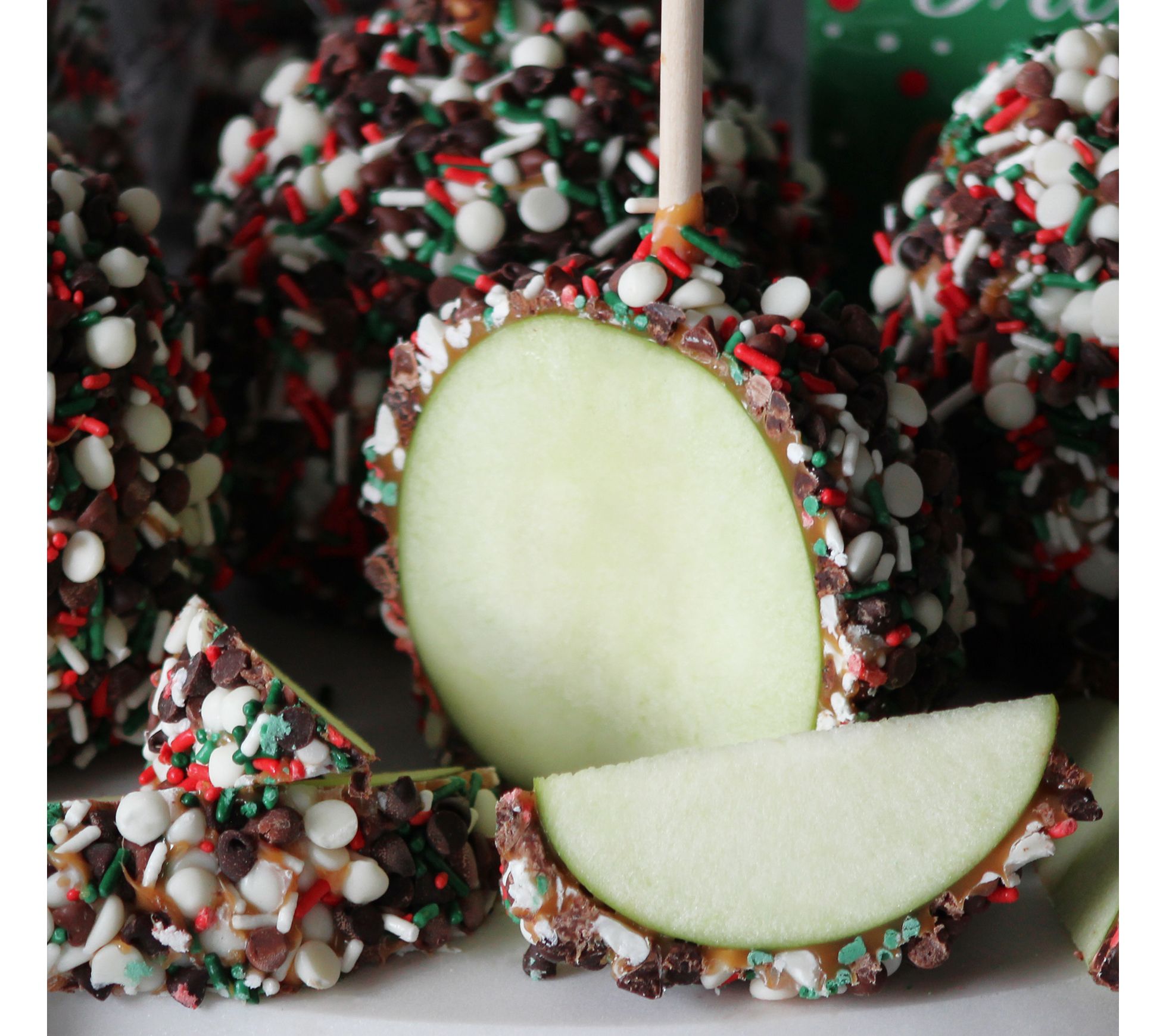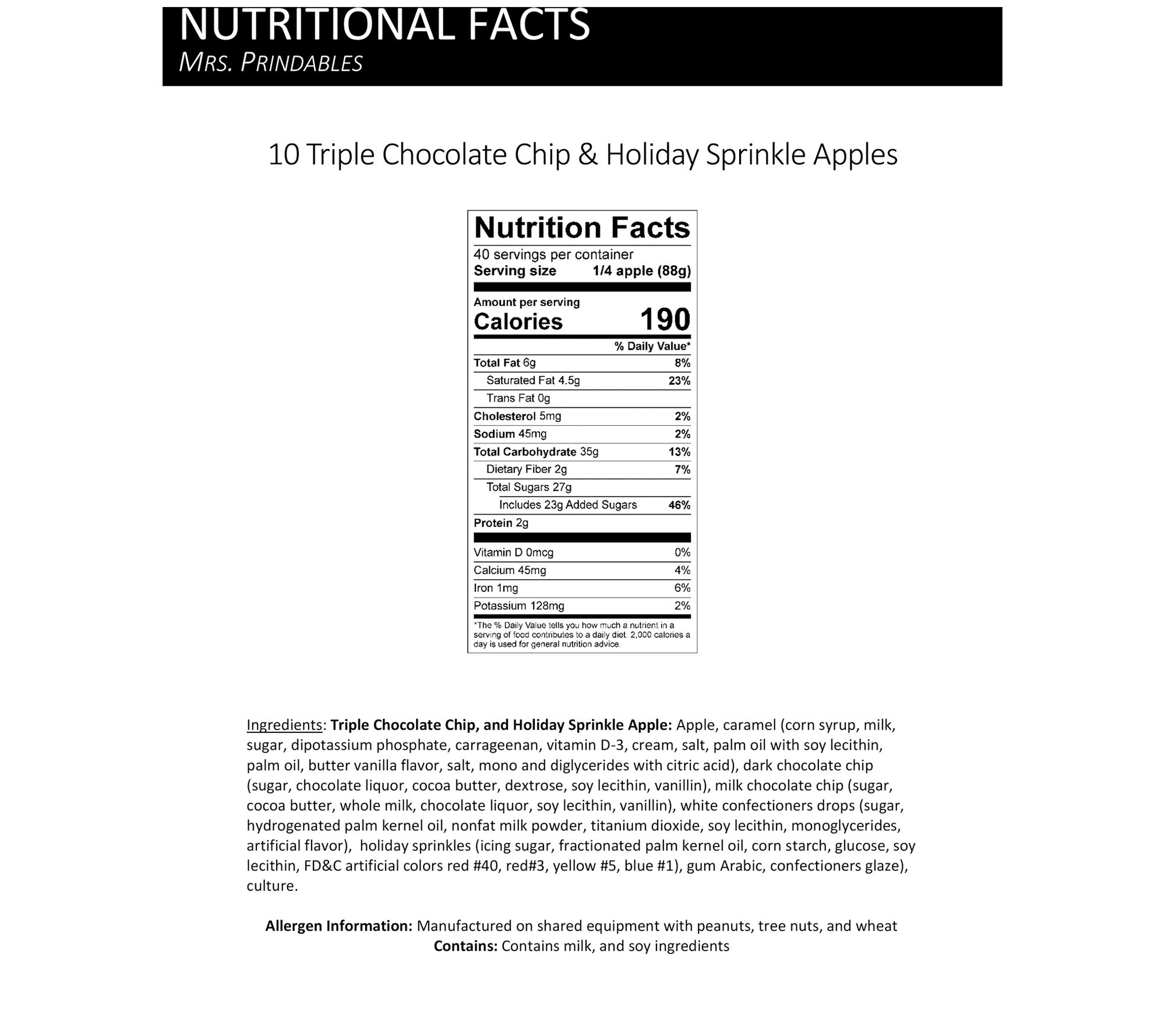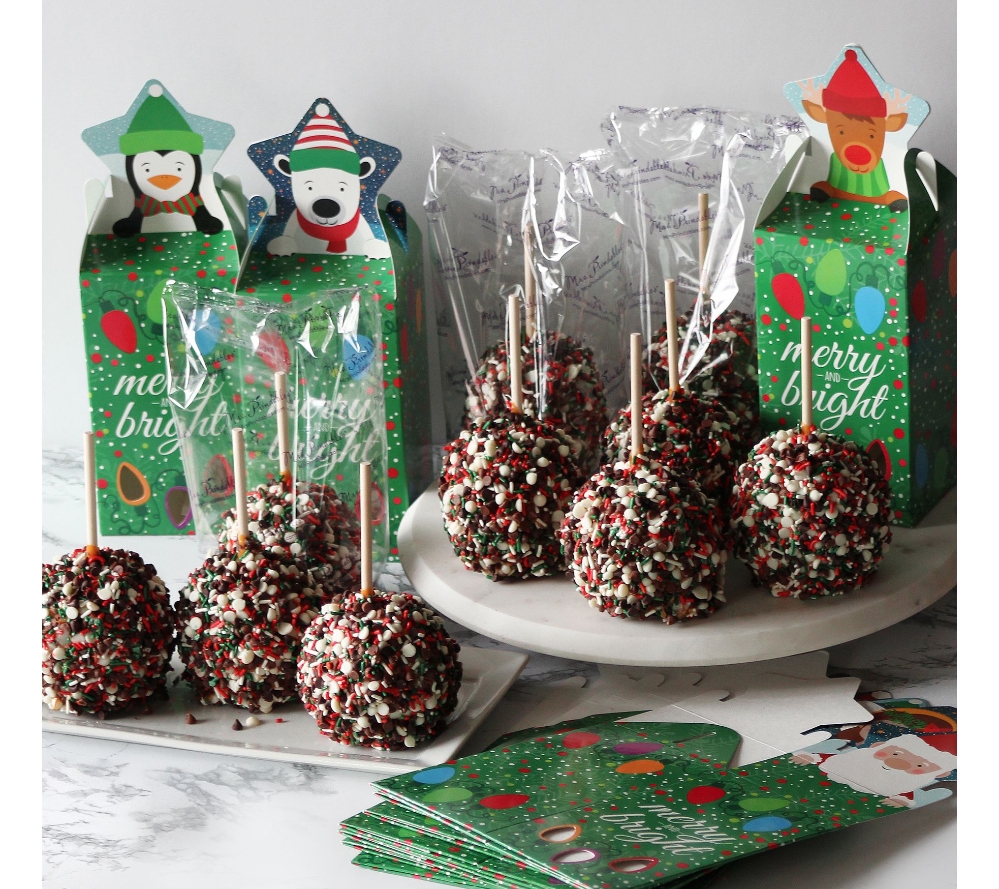 Includes 10 large caramel-dipped triple chocolate and holiday sprinkle apples and 10 gift boxes