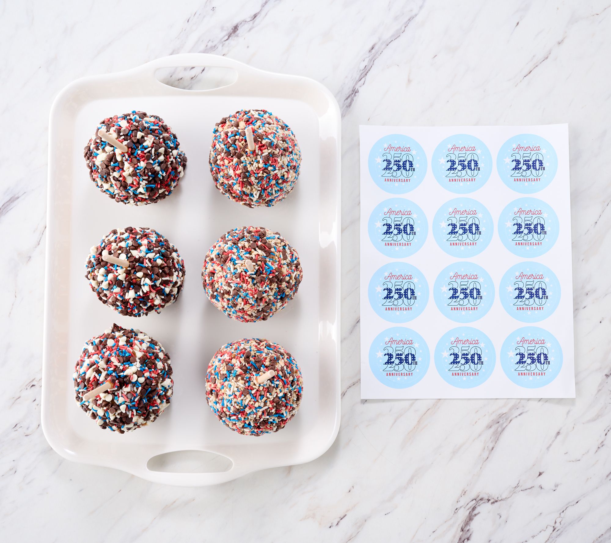 Includes six large caramel-dipped apples: three triple chocolate with patriotic and star sprinkles and three milk chocolate toffee with patriotic and star sprinkles; America 250th Anniversary stickers