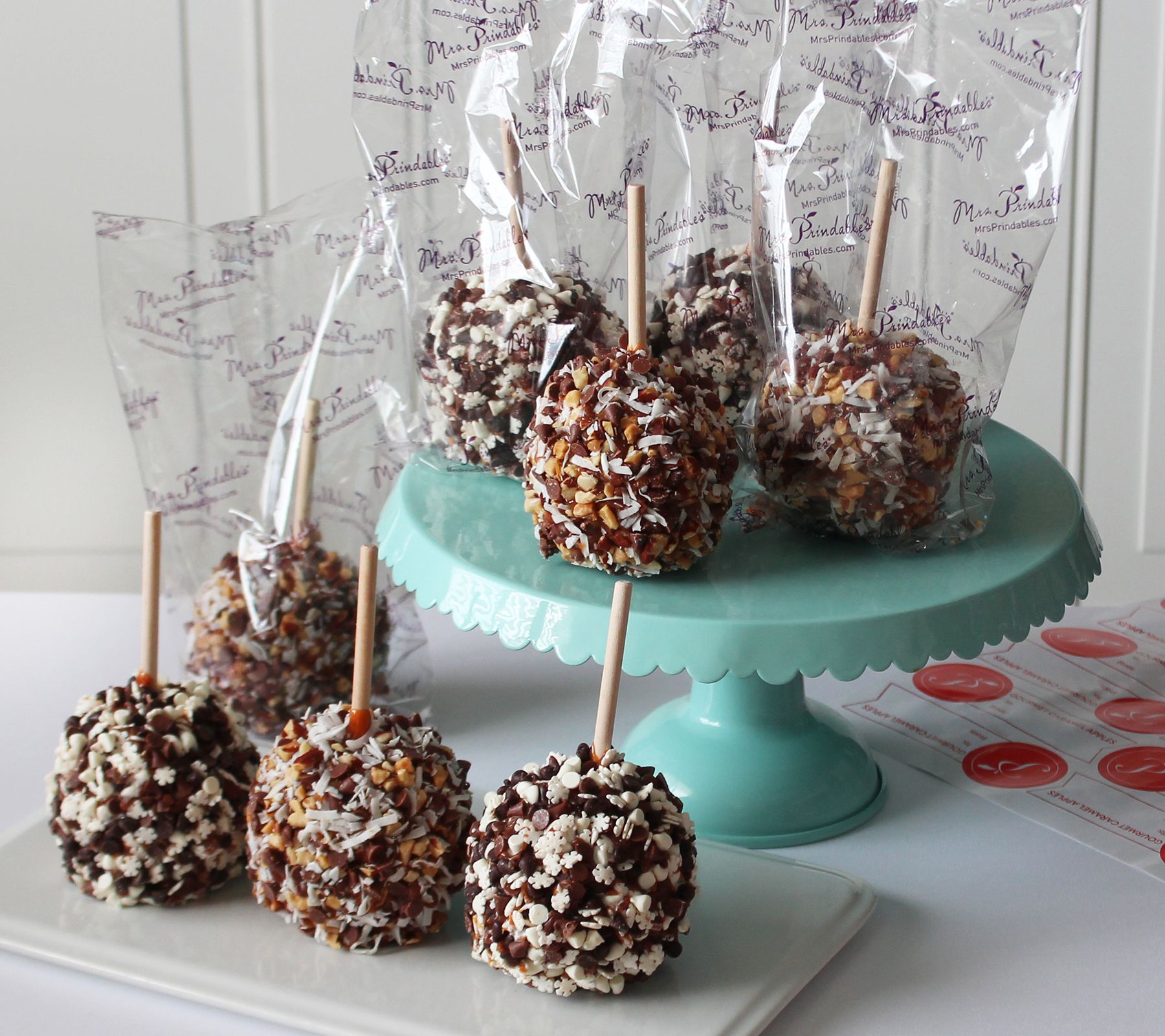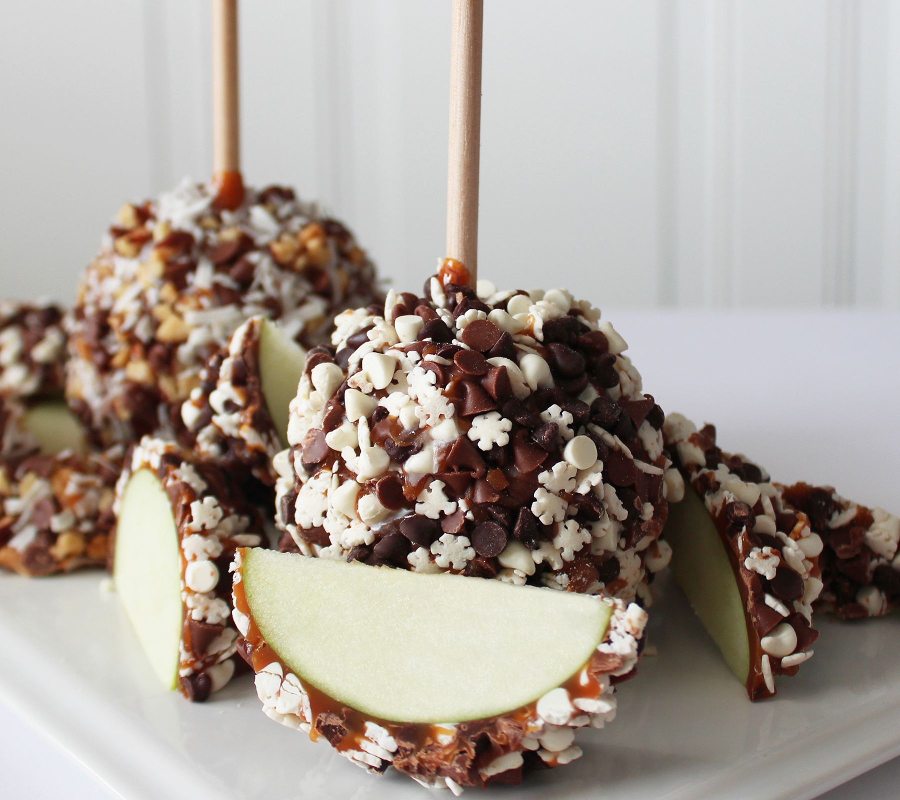 Includes sticker sheet and eight individual-sized caramel apples: four each in Milk Chocolate Chips with Almonds & Coconut Apples and Triple Chocolate Chips & Snowflakes Apples