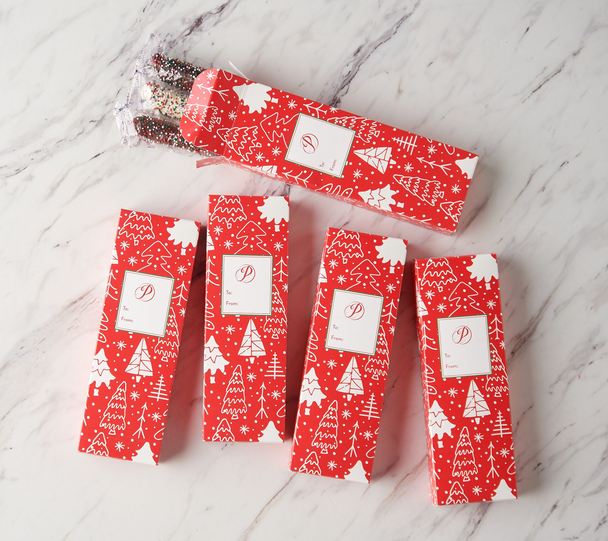 Includes 15 chocolate- and caramel-covered pretzels: five each of milk chocolate with holiday nonpareils, dark chocolate with holiday nonpareils, and white chocolate with holiday nonpareils; and five gift boxes