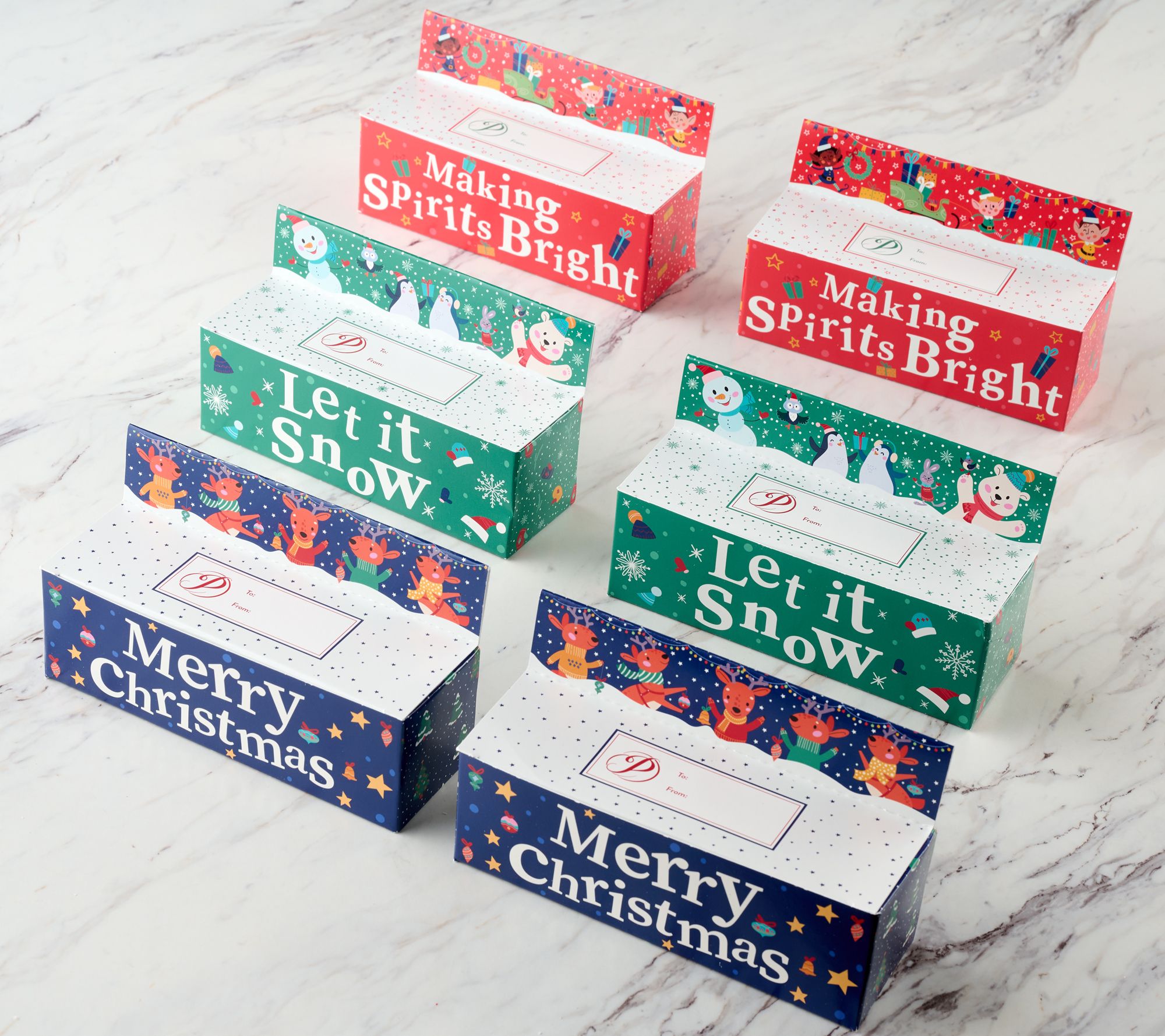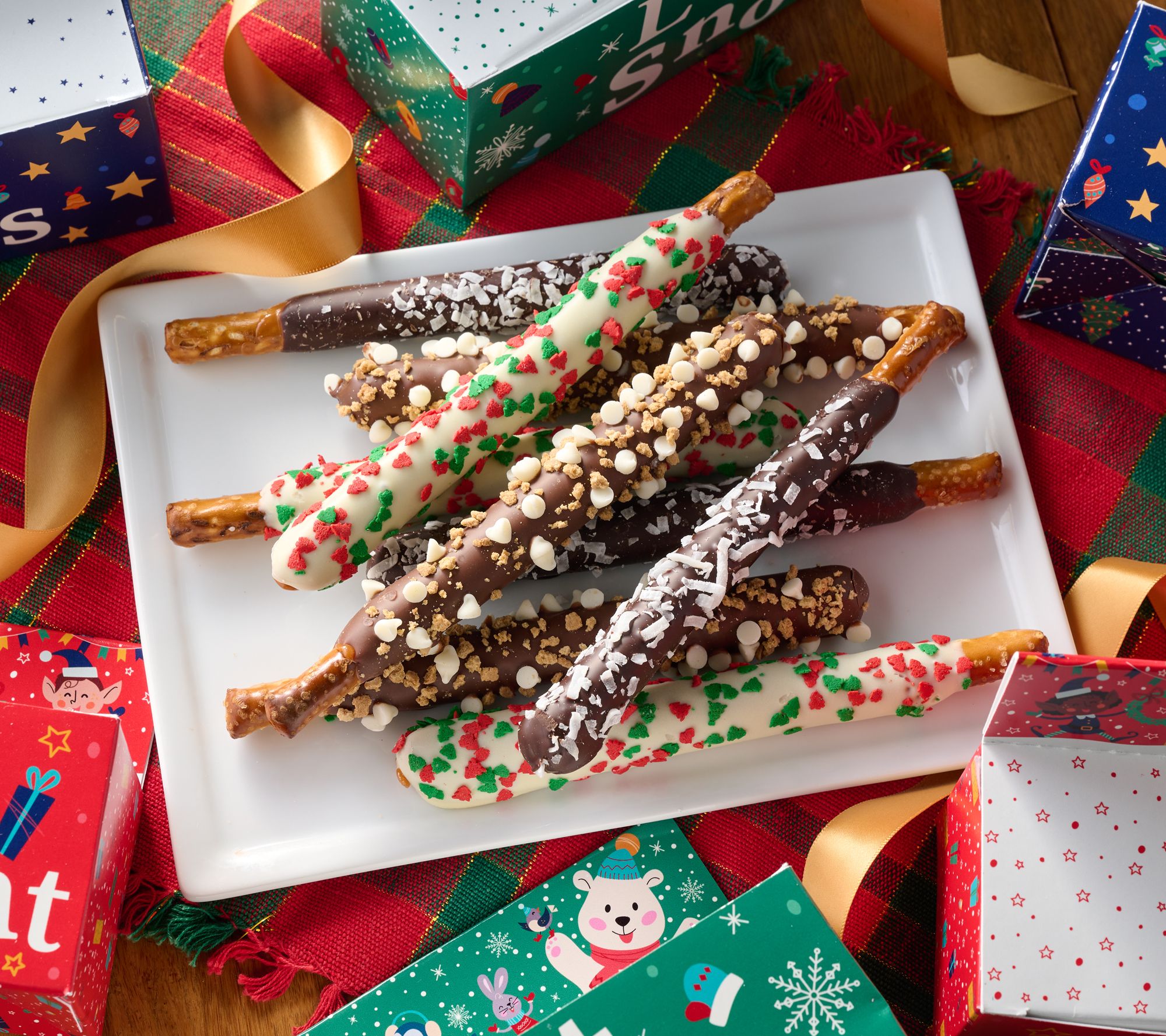 Includes six character gift boxes and 18 chocolate dipped pretzel rods in three flavors: milk chocolate with graham crunch and marshmallow pieces, white chocolate with red and green tree sprinkles, dark chocolate with coconut