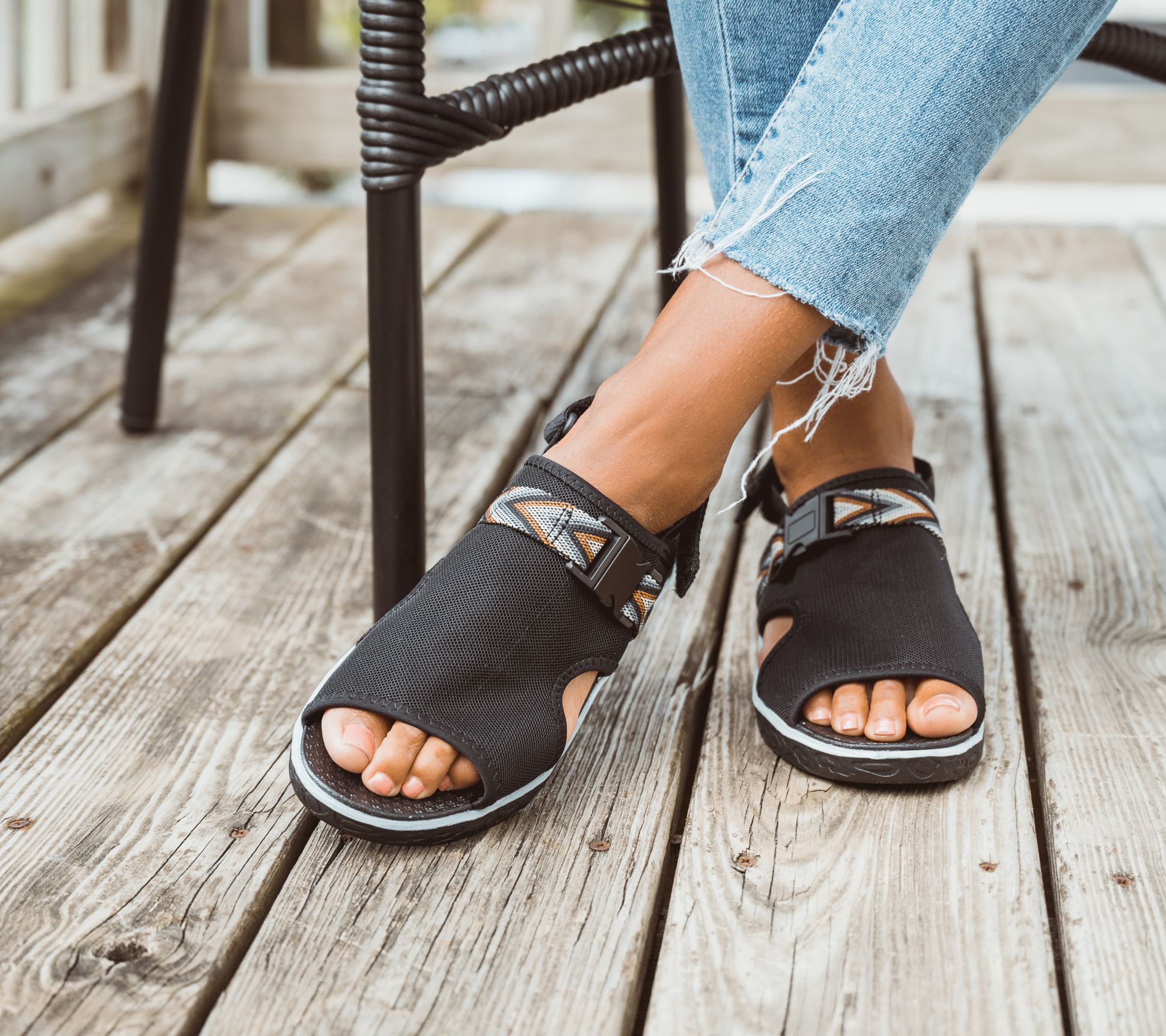 • Knit upper, woven adjustable buckle strap