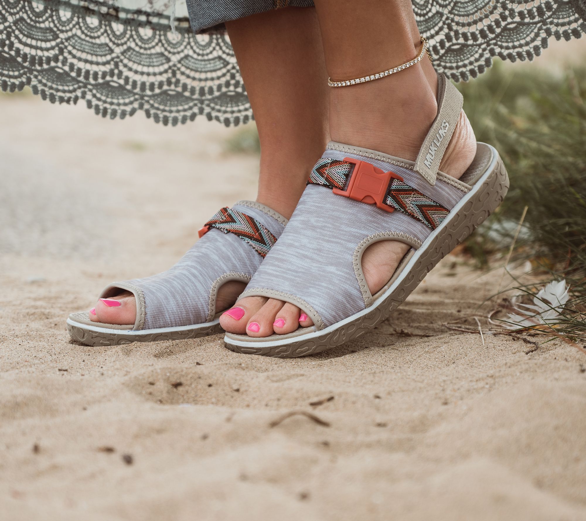 Summer vibes meet cushioned comfort! These adjustable slide sandals make your everyday adventures even better with a stylish knit upper and vibrant woven buckle strap accent. From MUK LUKS.