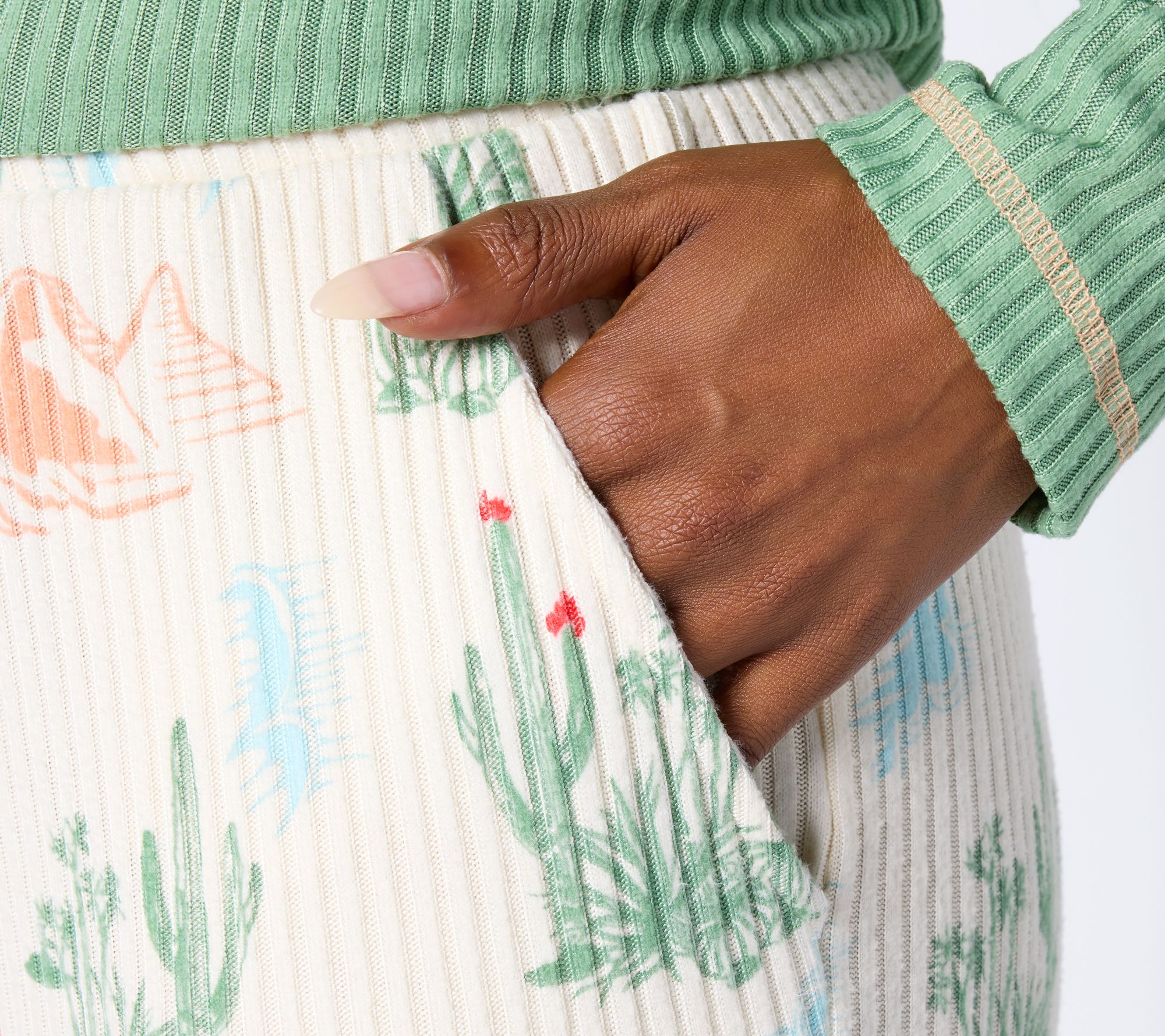 Ride off into dreamland in this prairie-inspired PJ set, crafted from luscious Butter Knit. Whether you're savoring the sunset on your porch after a full day or sipping coffee on a lazy morning, the ribbed V-neck top and easy pull-on pants deliver cozy ease and a hearty helping of prairie charm. Giddy up! From MUK LUKS.