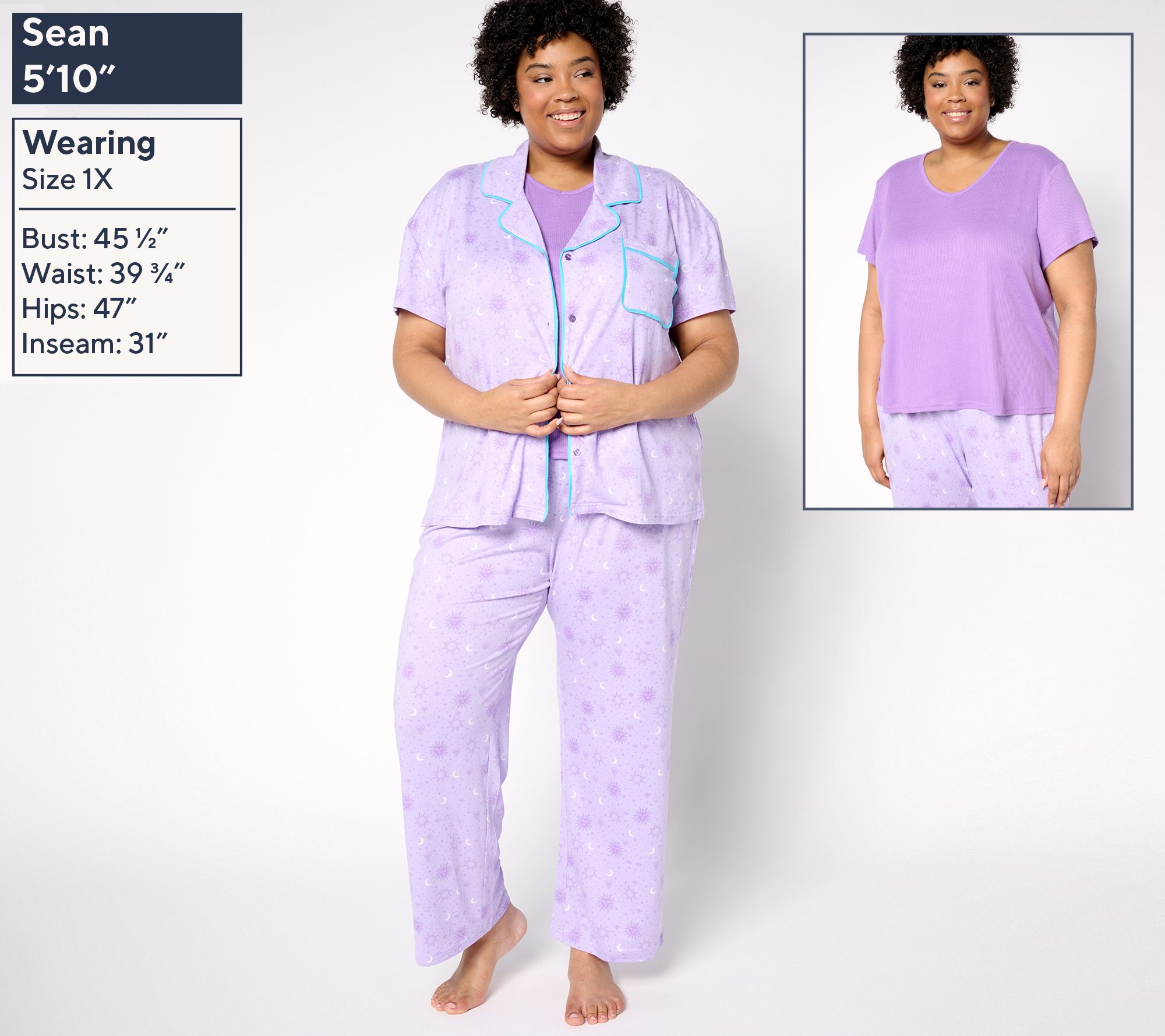 Includes top, tee, and pants