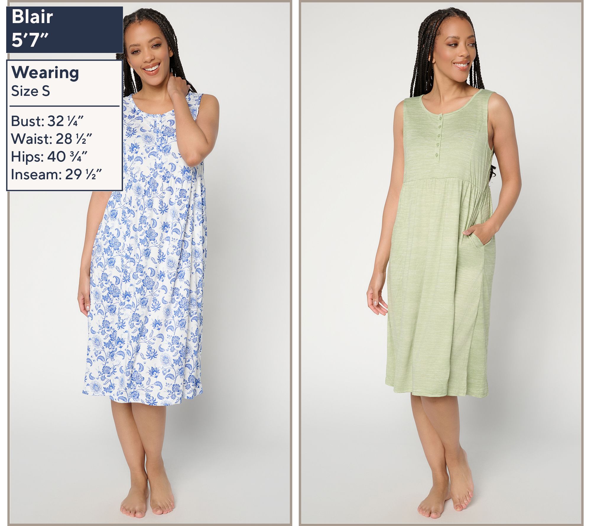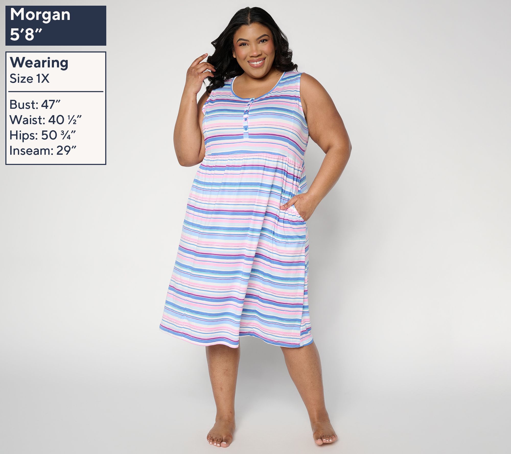 Features: tank style, round button-front henley neckline, midi length, side pockets, waist seam