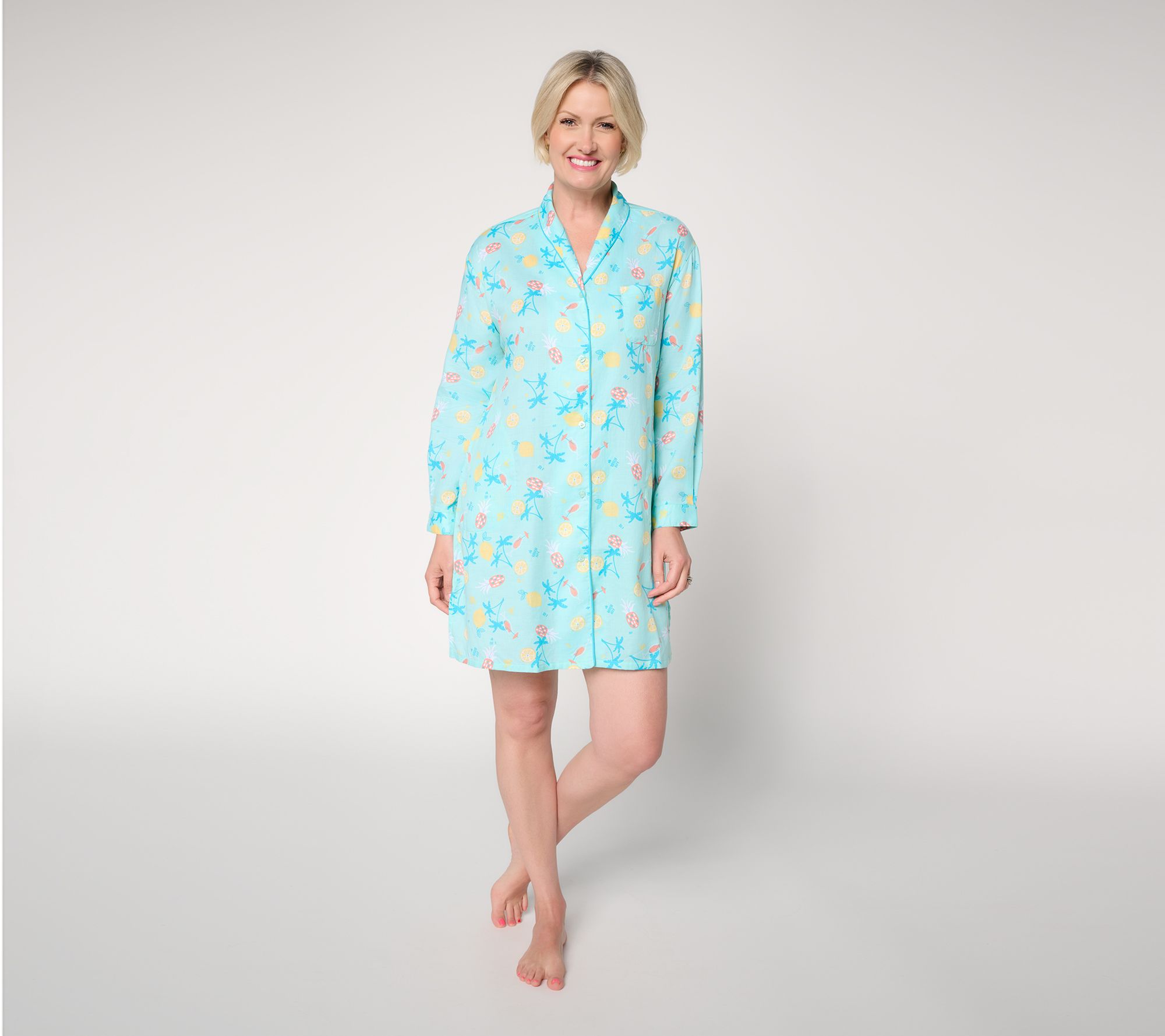 MUK LUKS Shawl Collar Button Up Sleepshirt. Woven. Not a QVC fit. Semi-fitted; follows the lines of the body with added wearing ease. Long sleeves. Button front. Collared v-neckline. Missy: 35"-37". Plus: 38"-40". Contents: 54% lyocell, 46% cotton. Care: MWCGCWLC/ONCBWN/TDLRP/LIIN. COO: import.