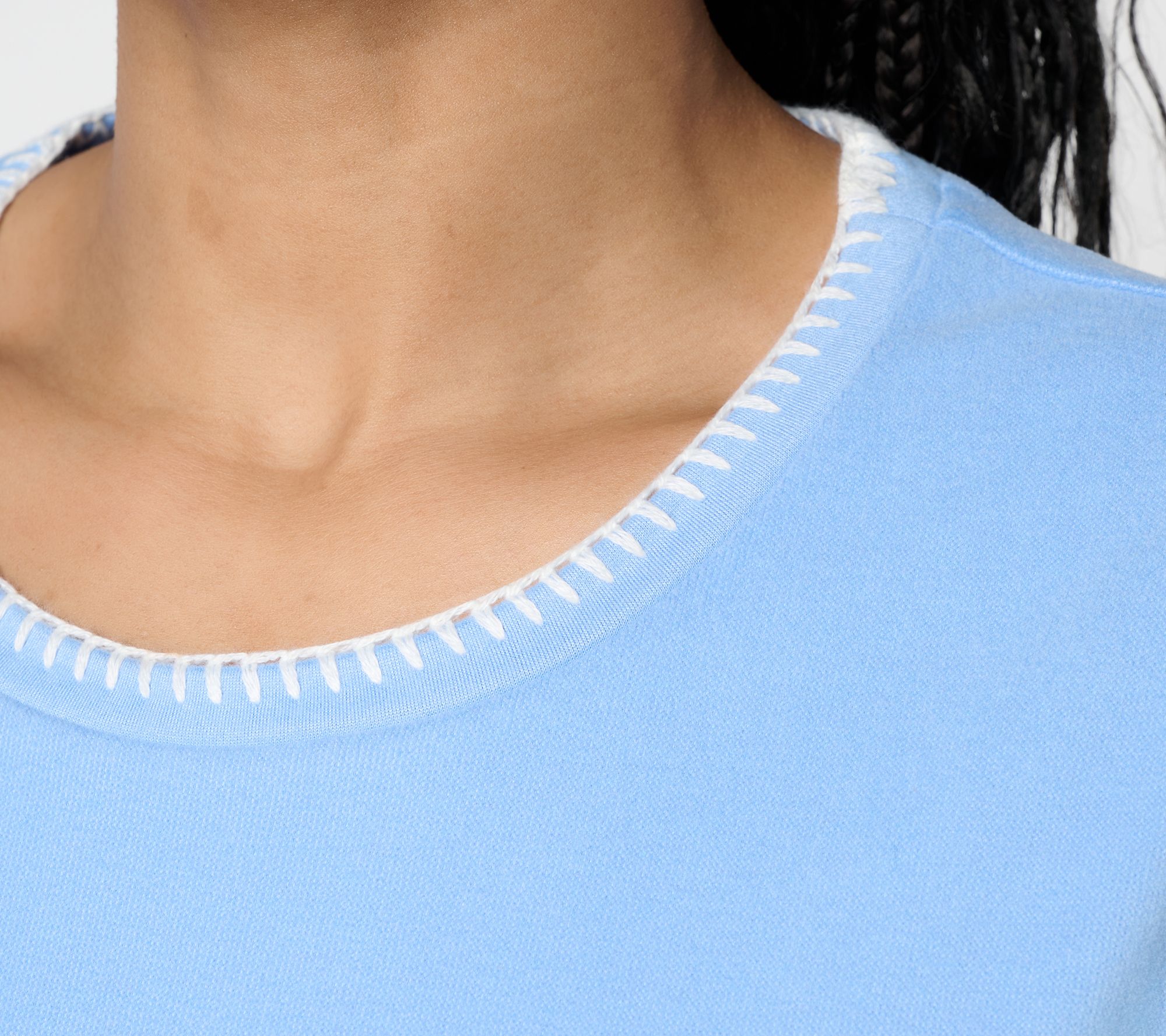 Top Features: round neckline, short sleeves, drop shoulders, whipstitch details
