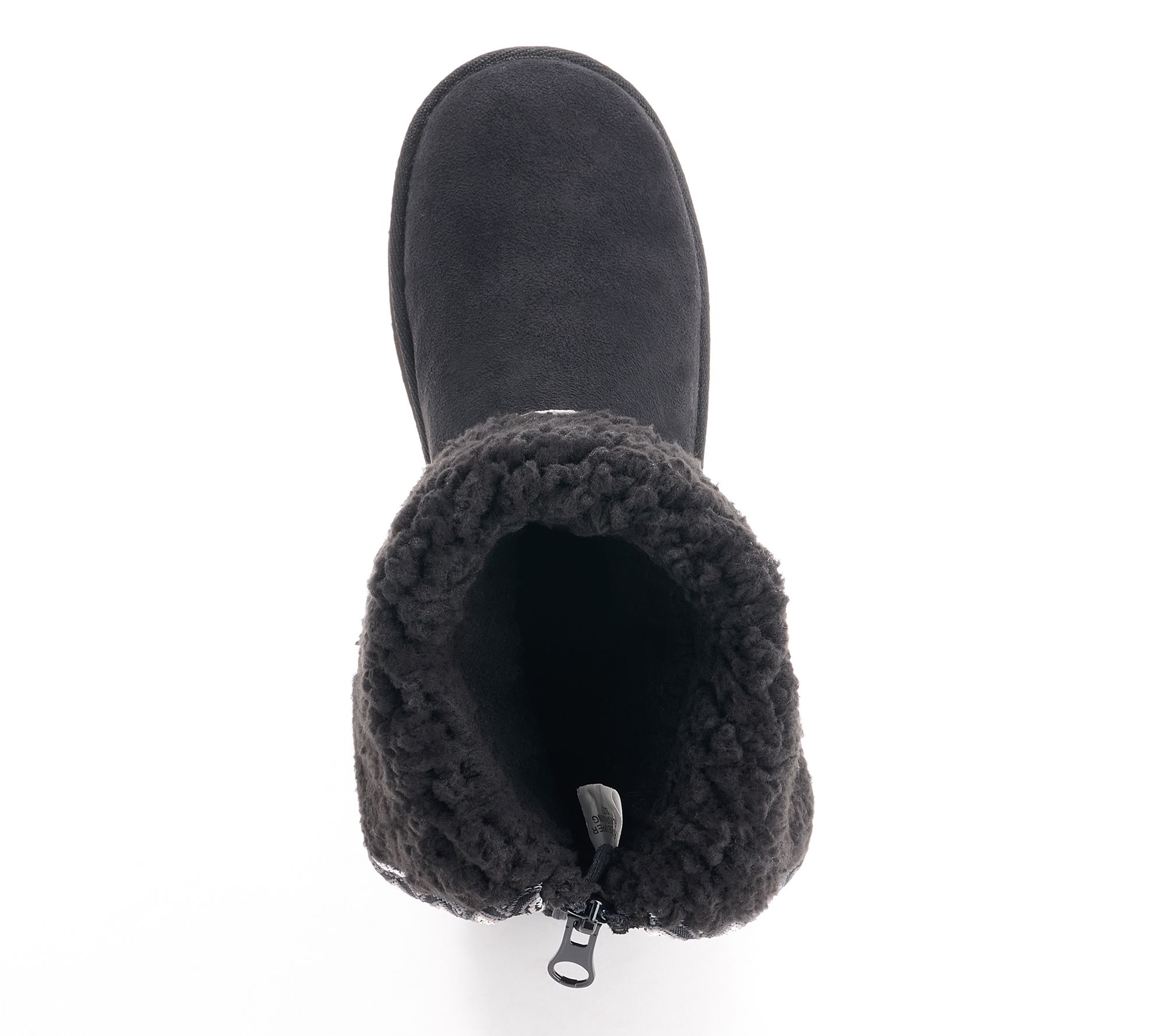 • Faux suede upper, faux fur cuff, decorative trim along opening, back-seam zipper