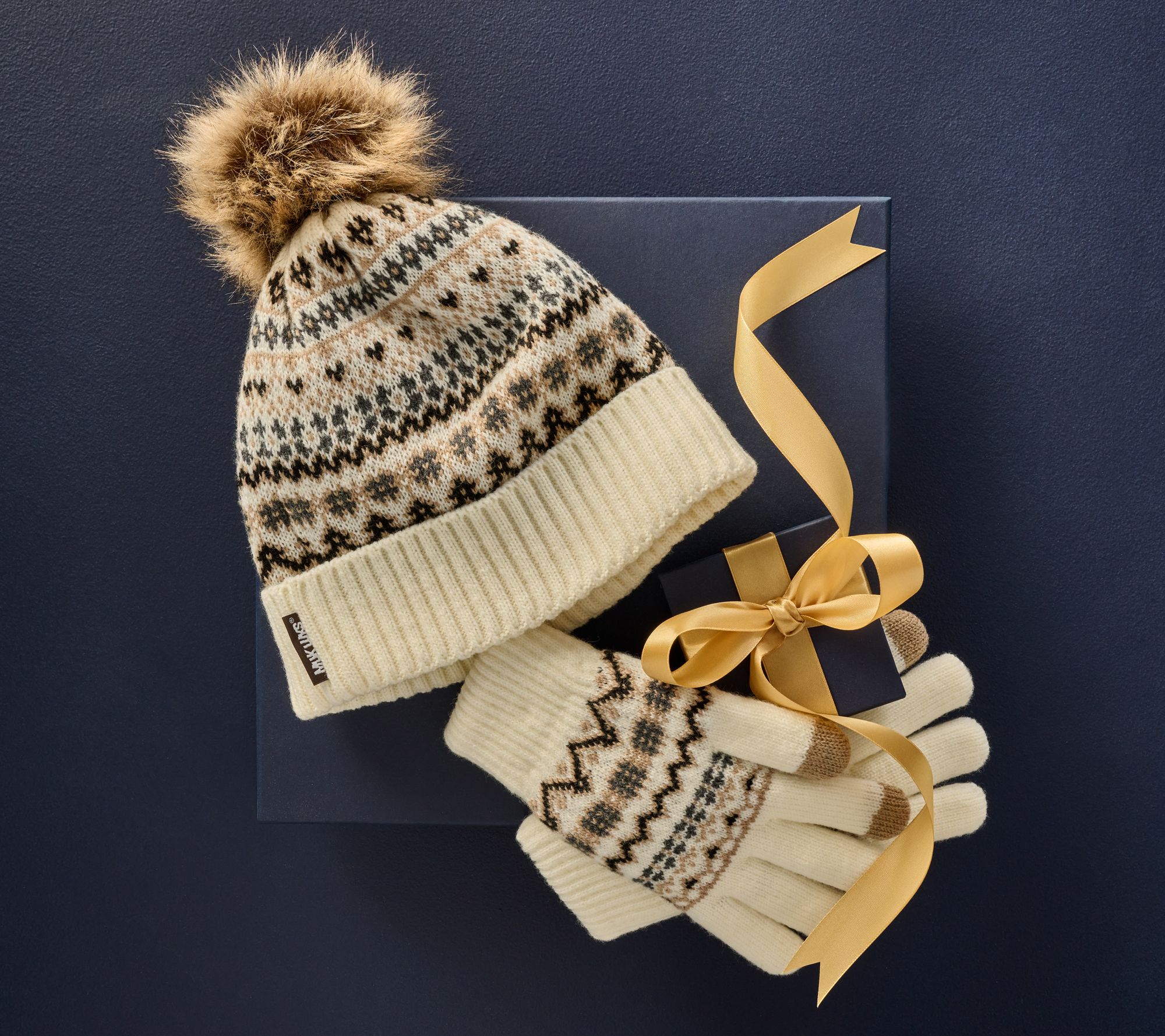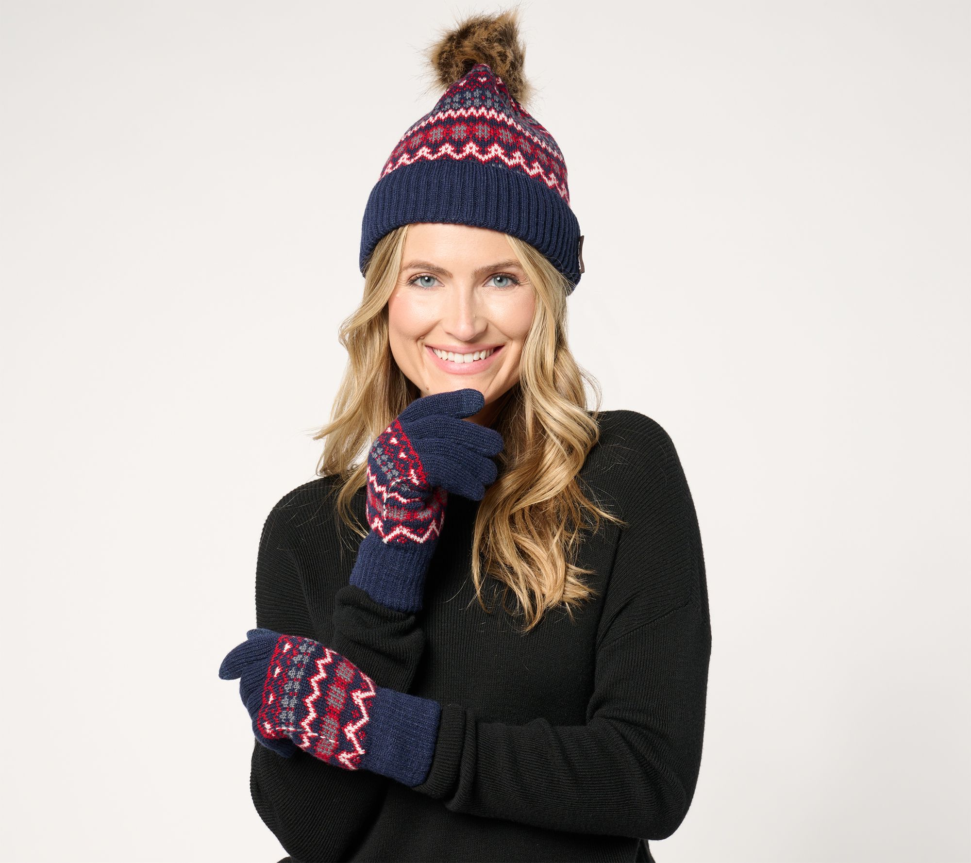 Stay warm this winter with this cozy knit hat and glove set featuring . Featuring a classic fair isle pattern and heat-retaining technology, the hat is topped with a furry pom pom and the gloves include touch screen technology to keep you connected. Combat cold weather with this stylish and functional ensemble. From MUK LUKS.
