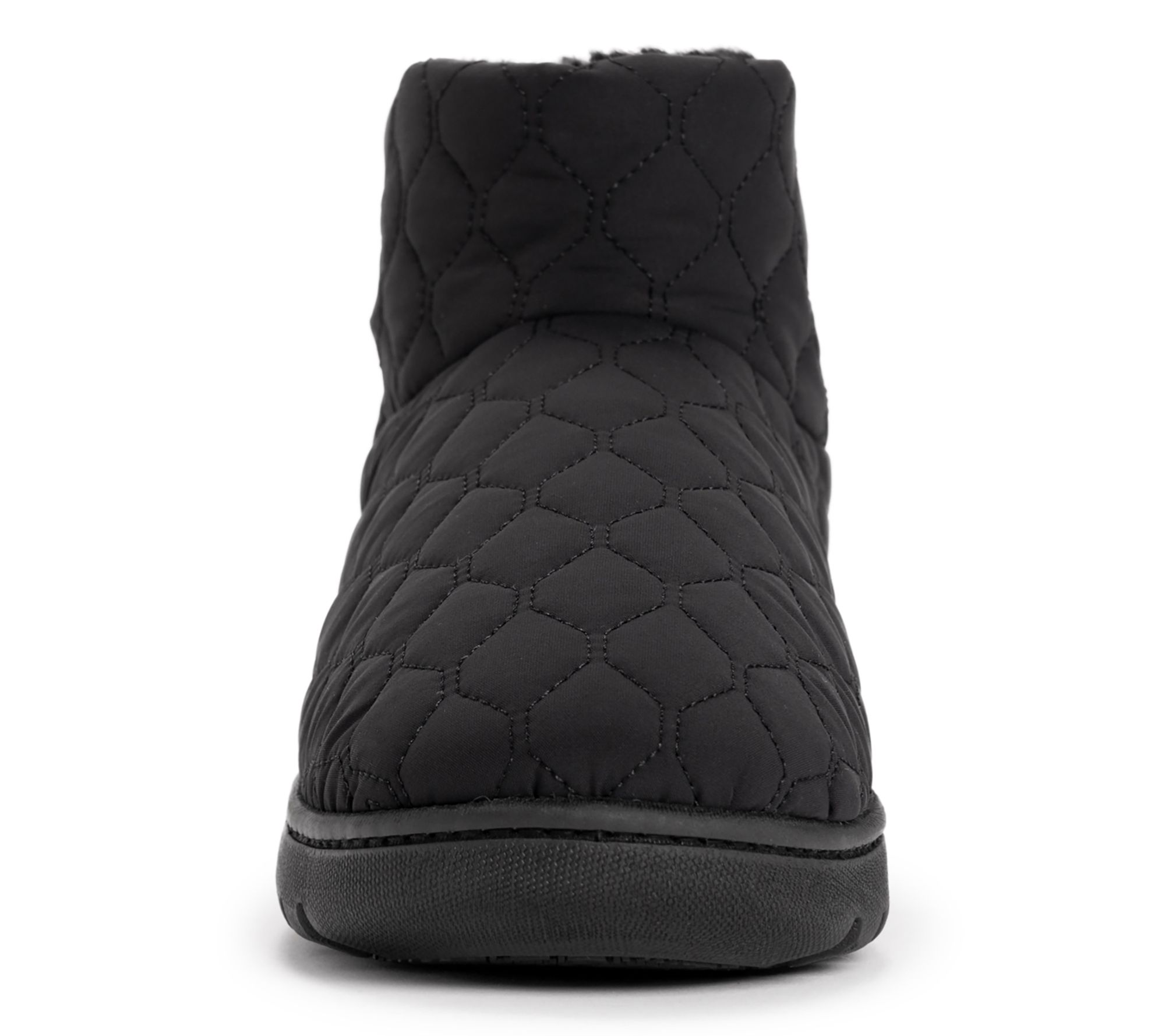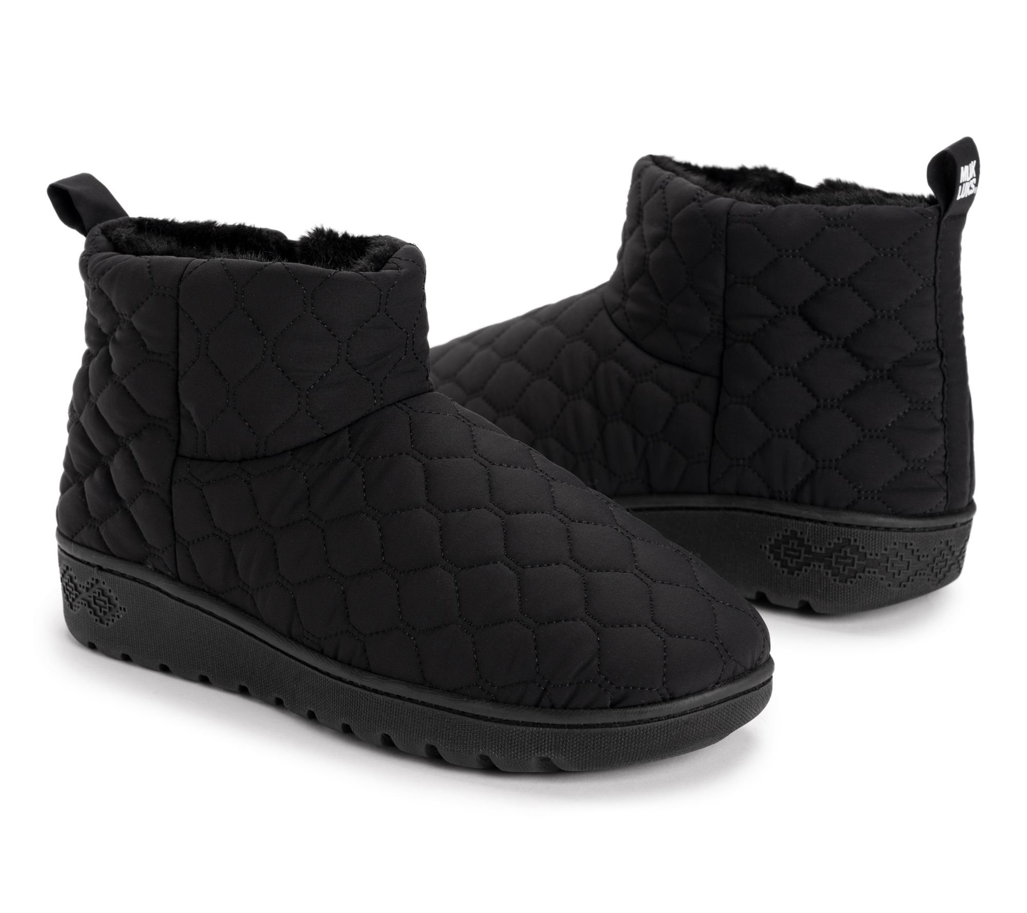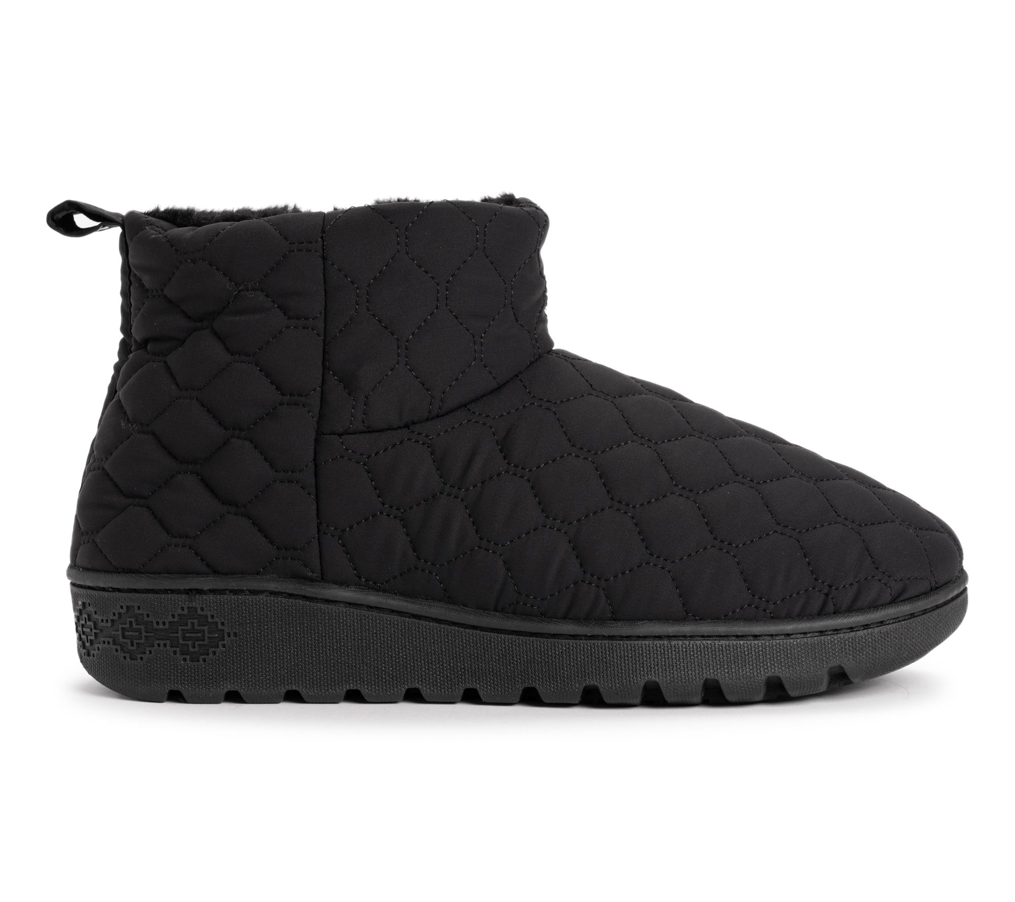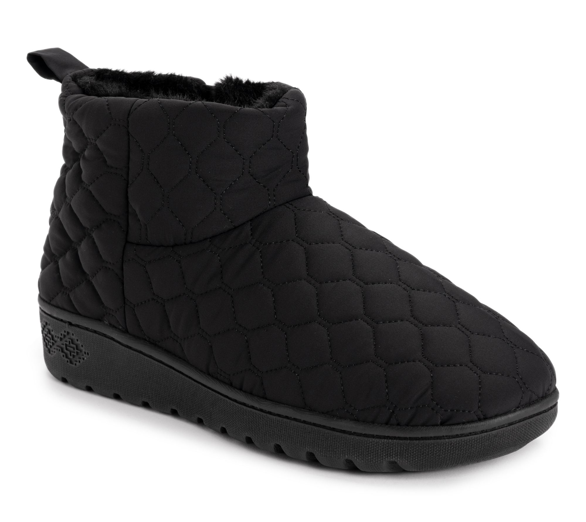 Relax in style with the MUK LUKS Avery Rose mini wedge slippers. Perfect for chilly fall and winter days, this quilted slipper bootie features a low wedge and a rounded toe, offering both comfort and a touch of elegance. From MUK LUKS.