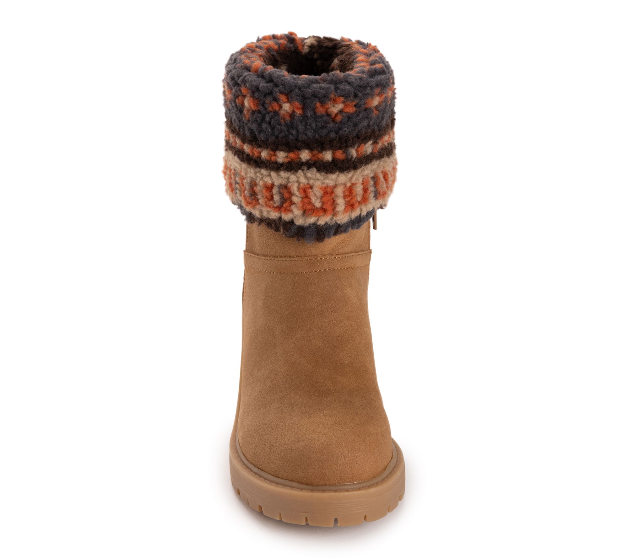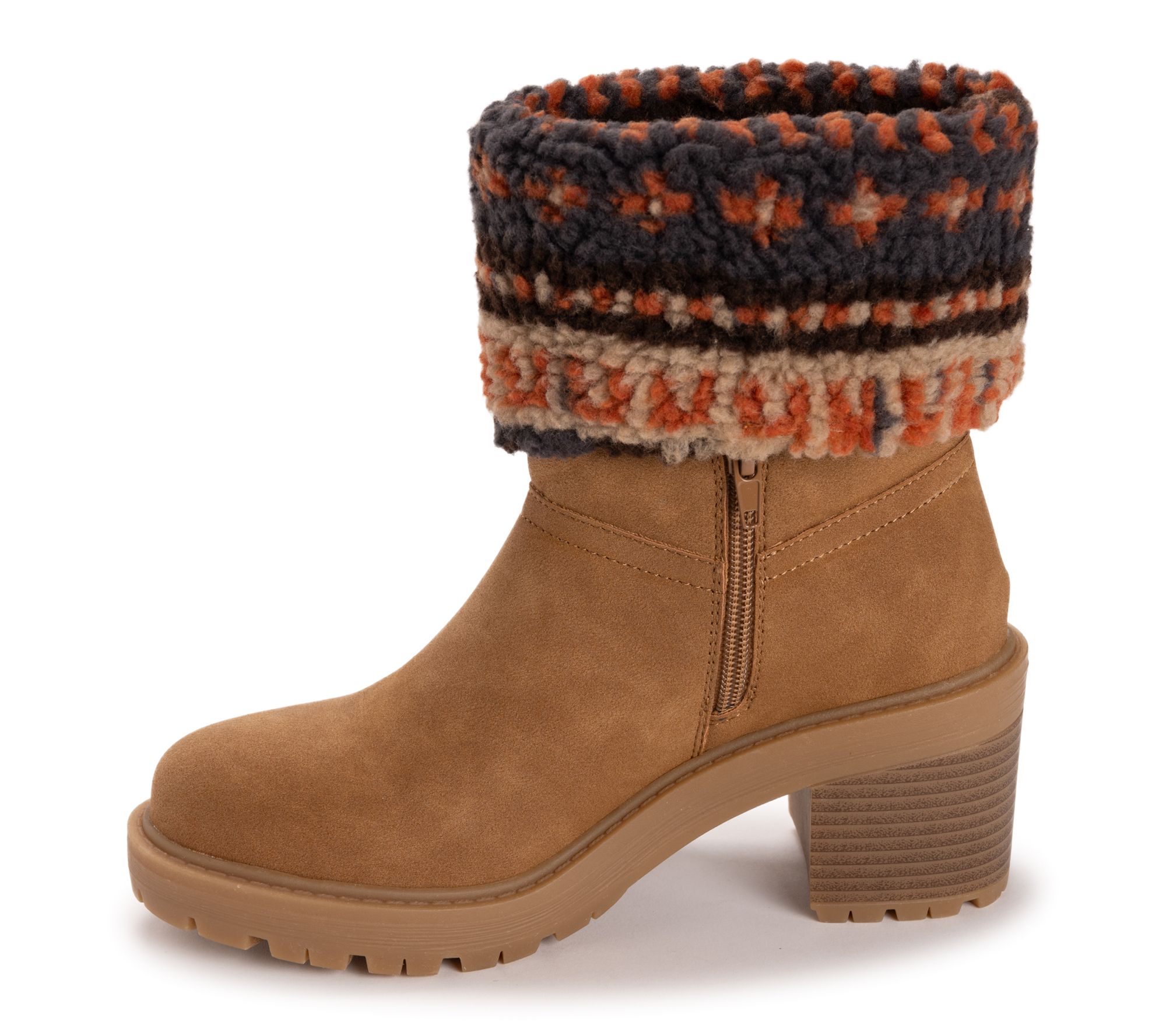 Knit foldover cuff, side zipper, faux suede upper, rounded toe