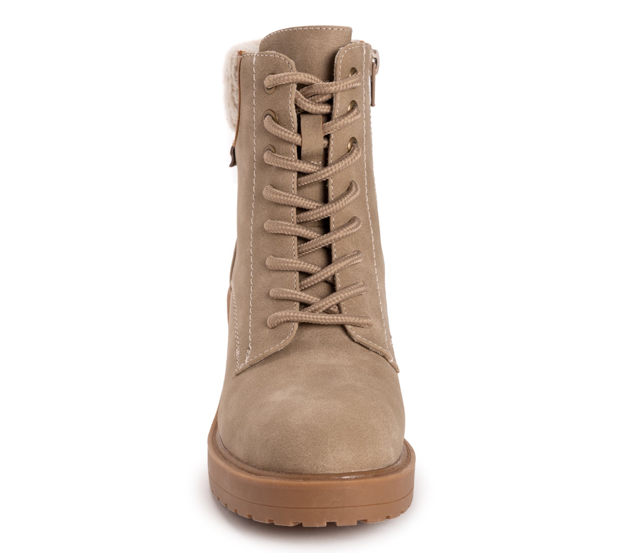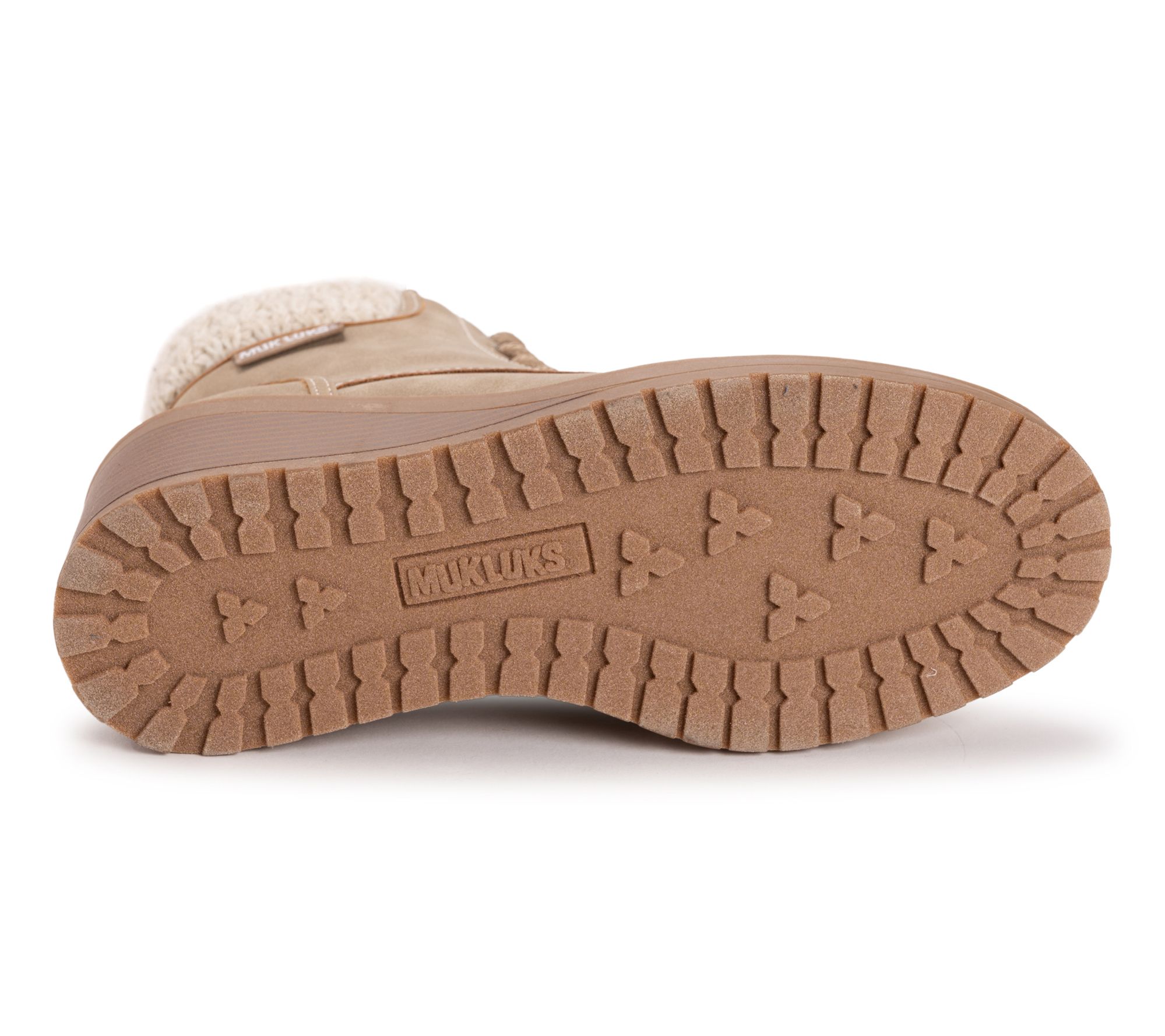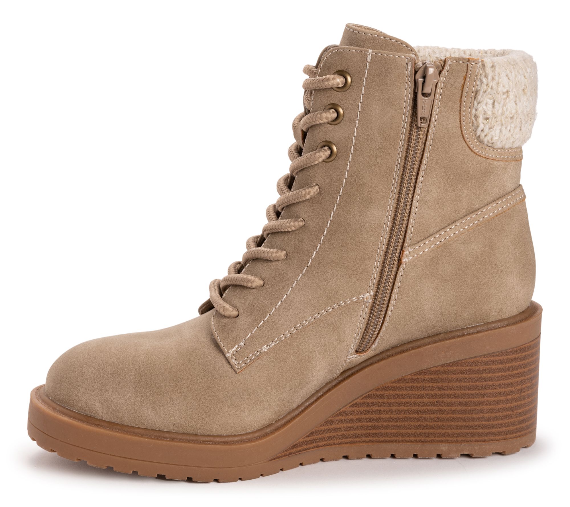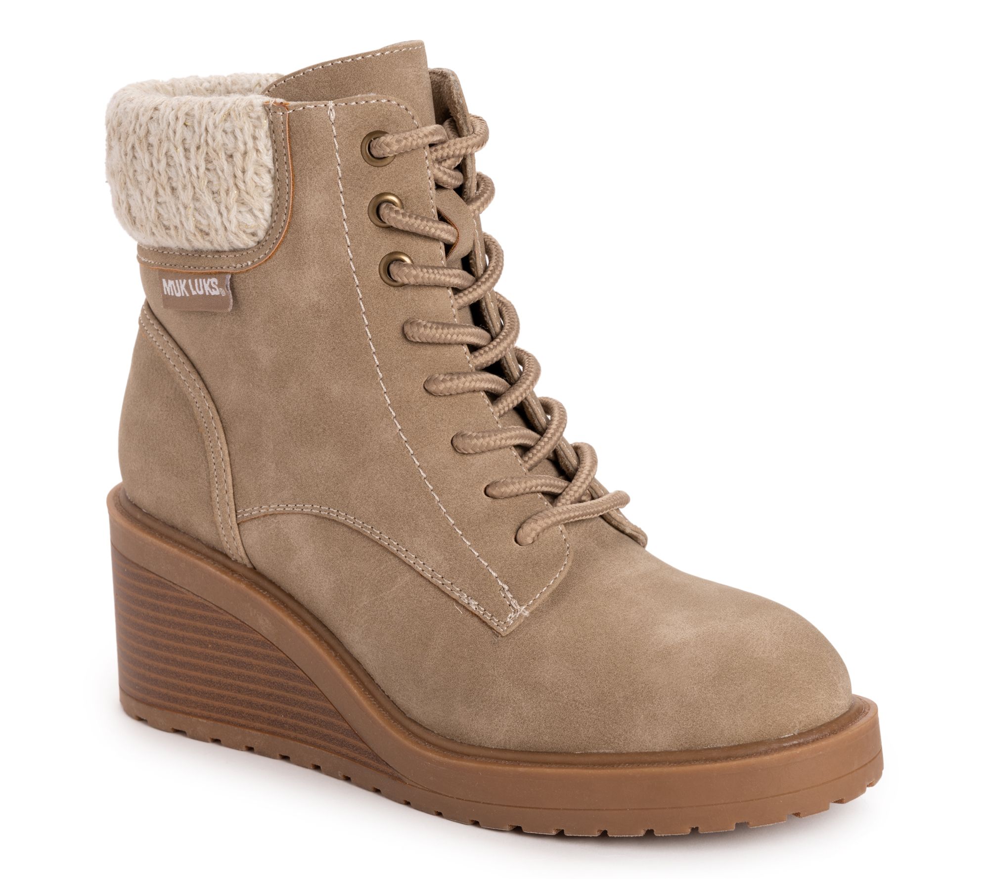 Meet your new fall/winter footwear: the MUK LUKS Sky Solange wedge boot. Adorable foldover cuffs reveal a chic knit design, making these boots as cute as they are cozy. Lace 'em up once, then easily step in and out using the side-zip entry. Plus, the memory foam insoles provide comfort with every step, perfect for all your fall adventures. From MUK LUKS.