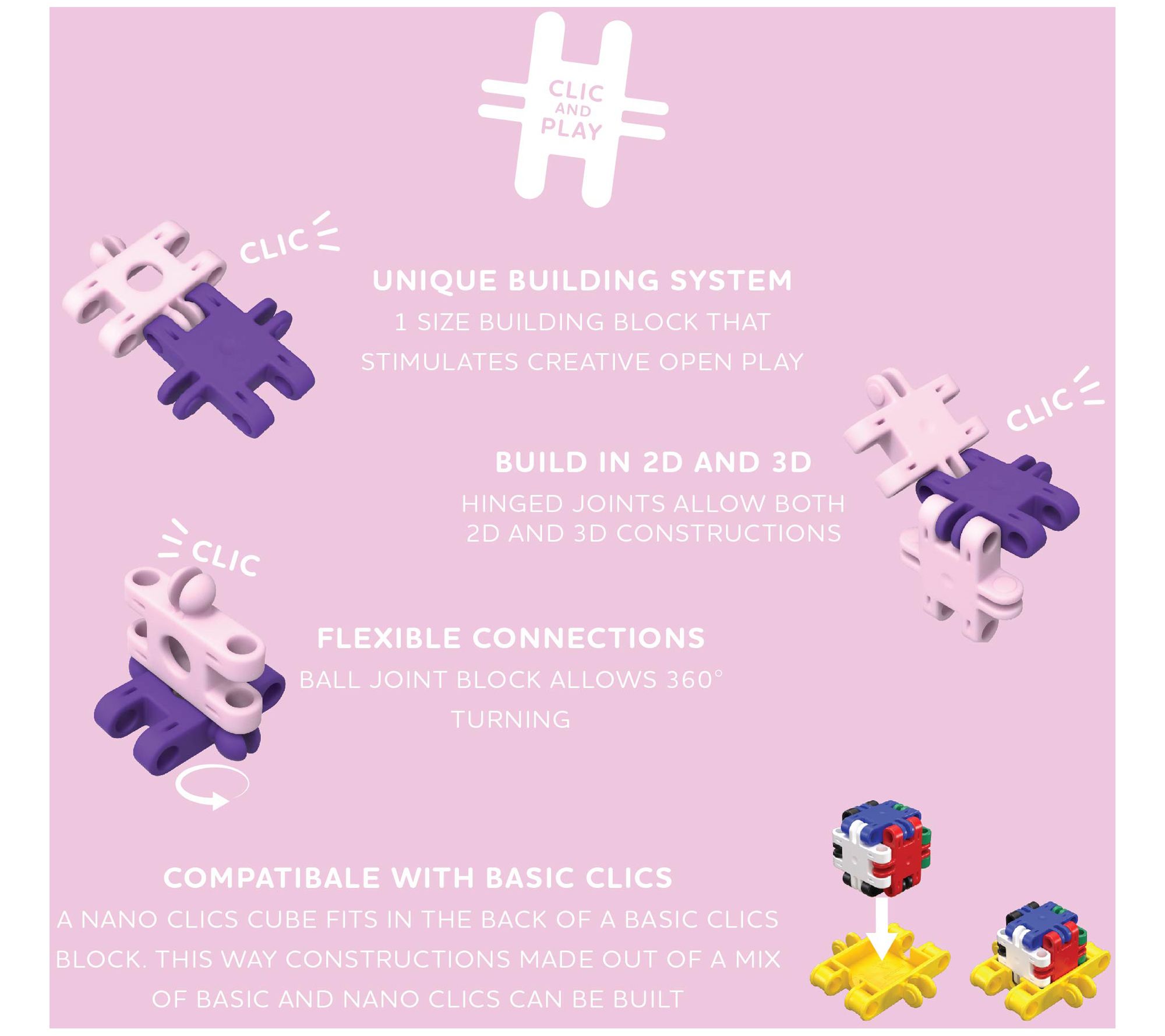 • Includes 250 pieces of nano clics and connection pieces, sticker sheet, building instructions