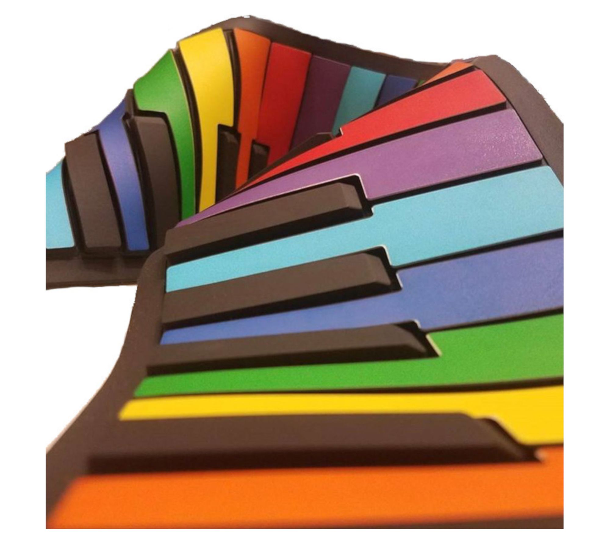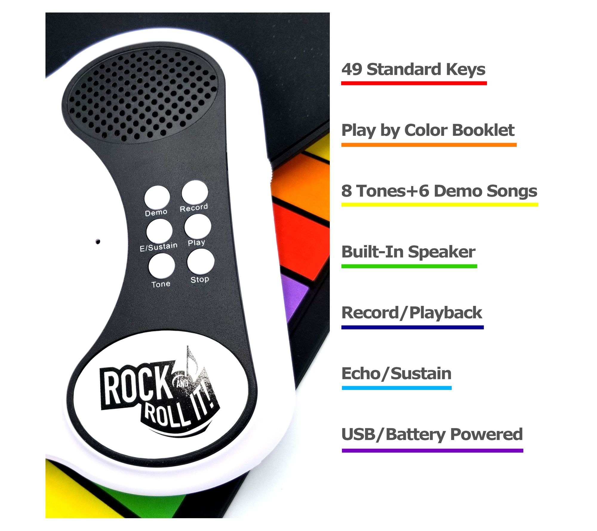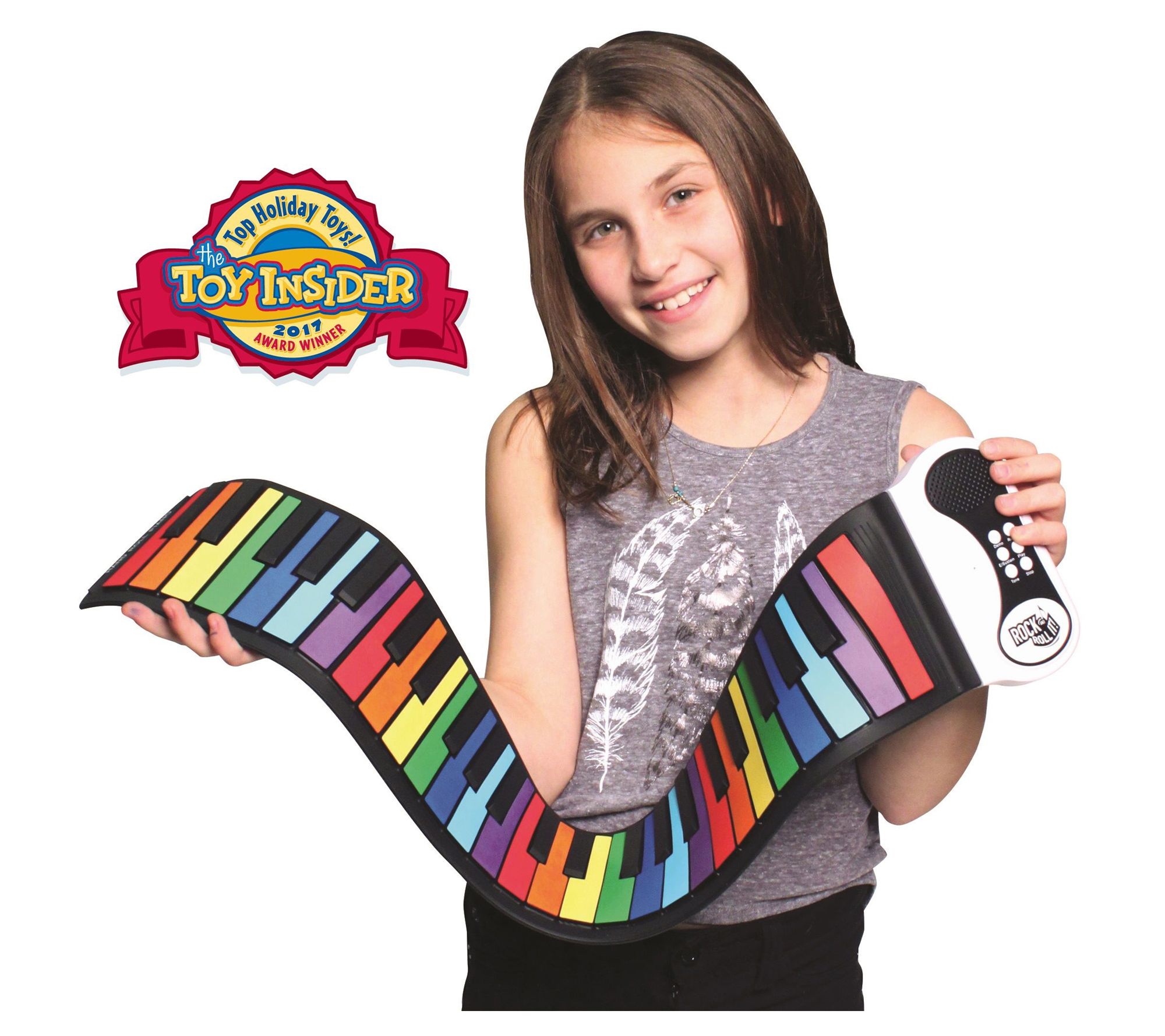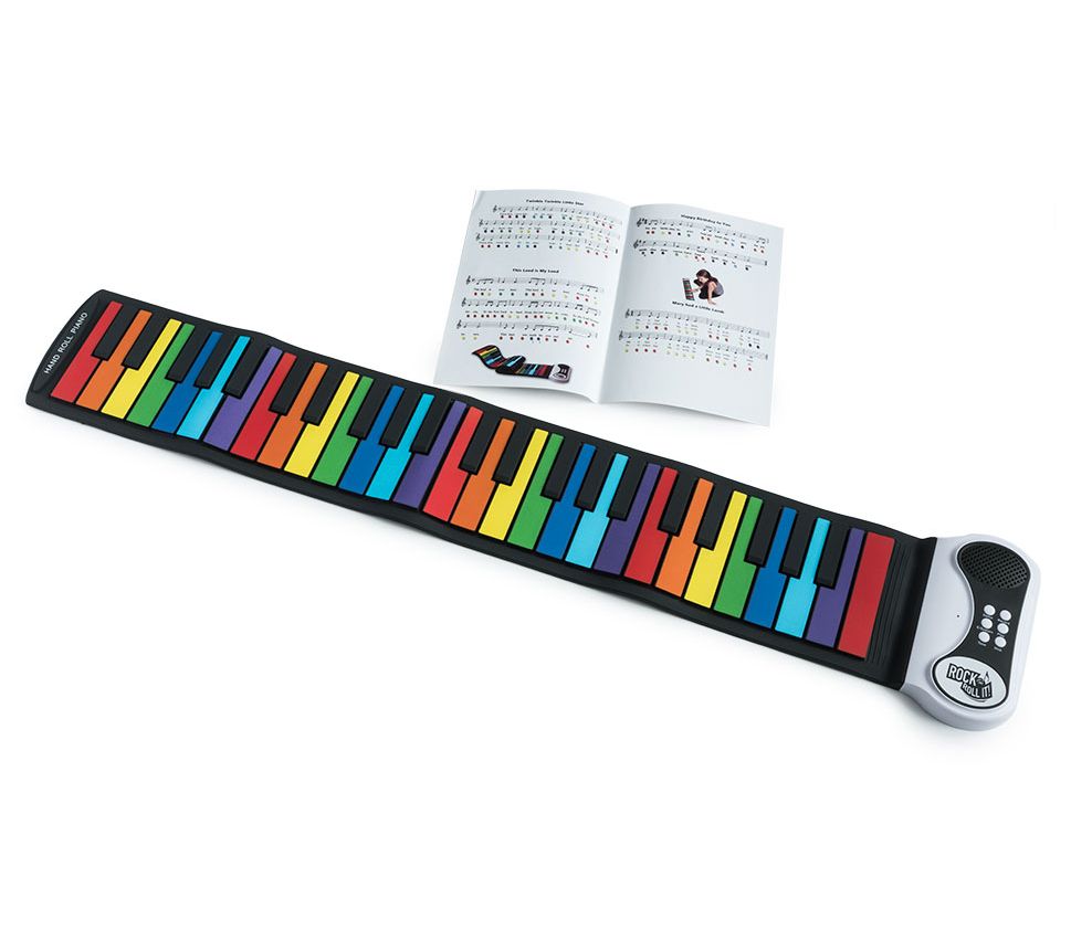 Let your child discover the joy of music with the MukikiM Rock and Roll It Rainbow Piano Toy! This portable and flexible piano is perfect for budding musicians and features a learn-to-play-by-color system, volume control, and headphone capability for quiet practice. From MukikiM.