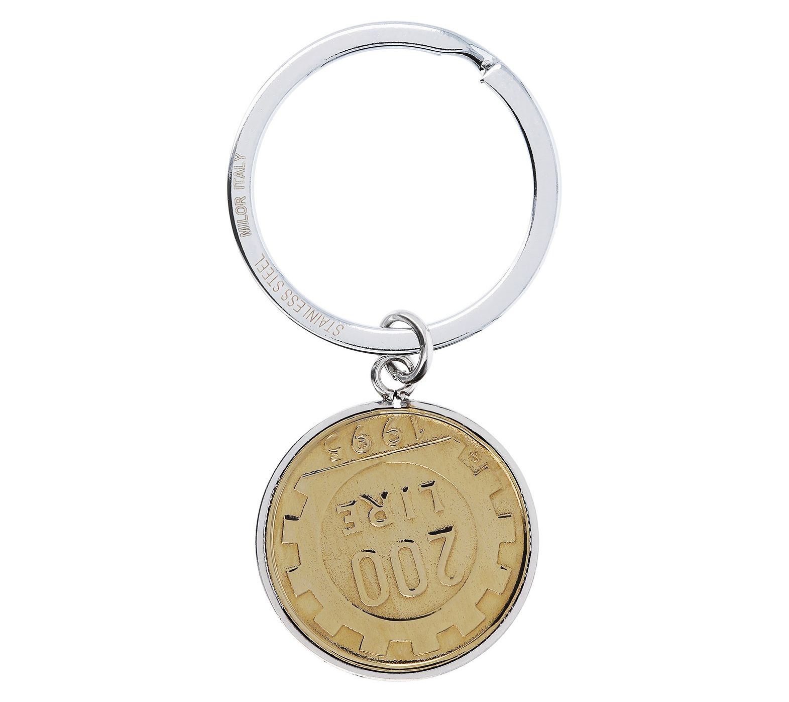 • Key ring with goldtone, bezel-set 200-lire coin charm; polished finish