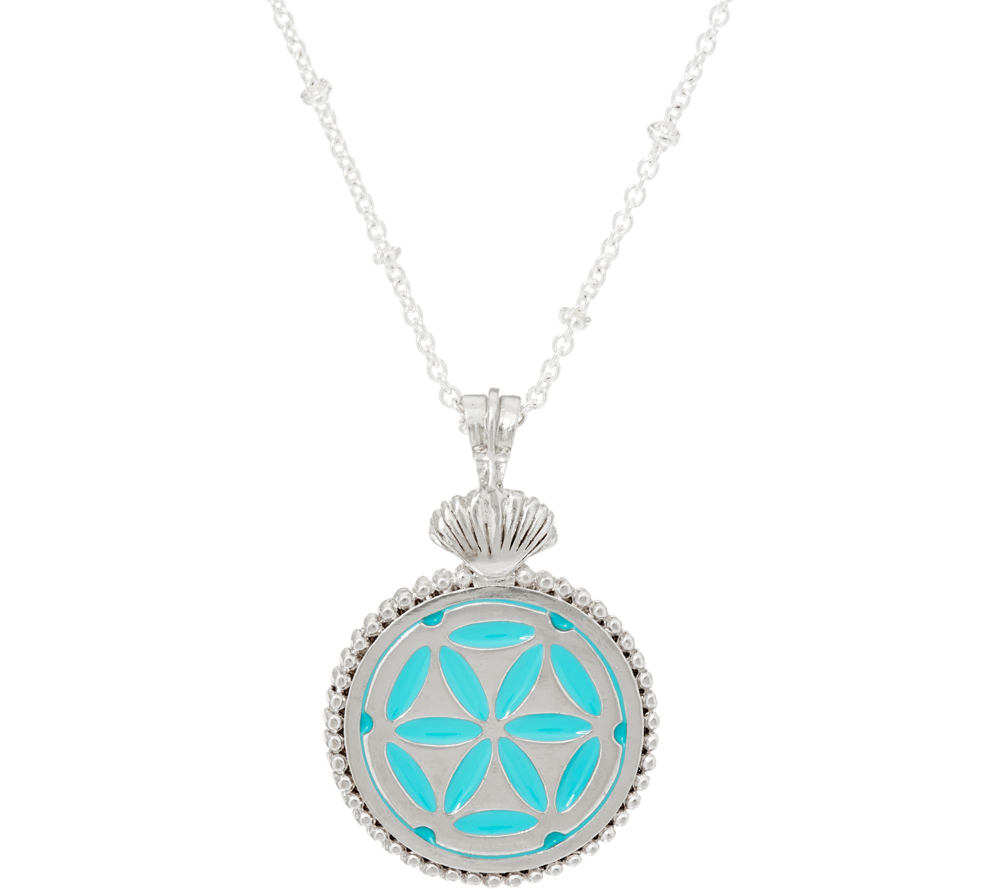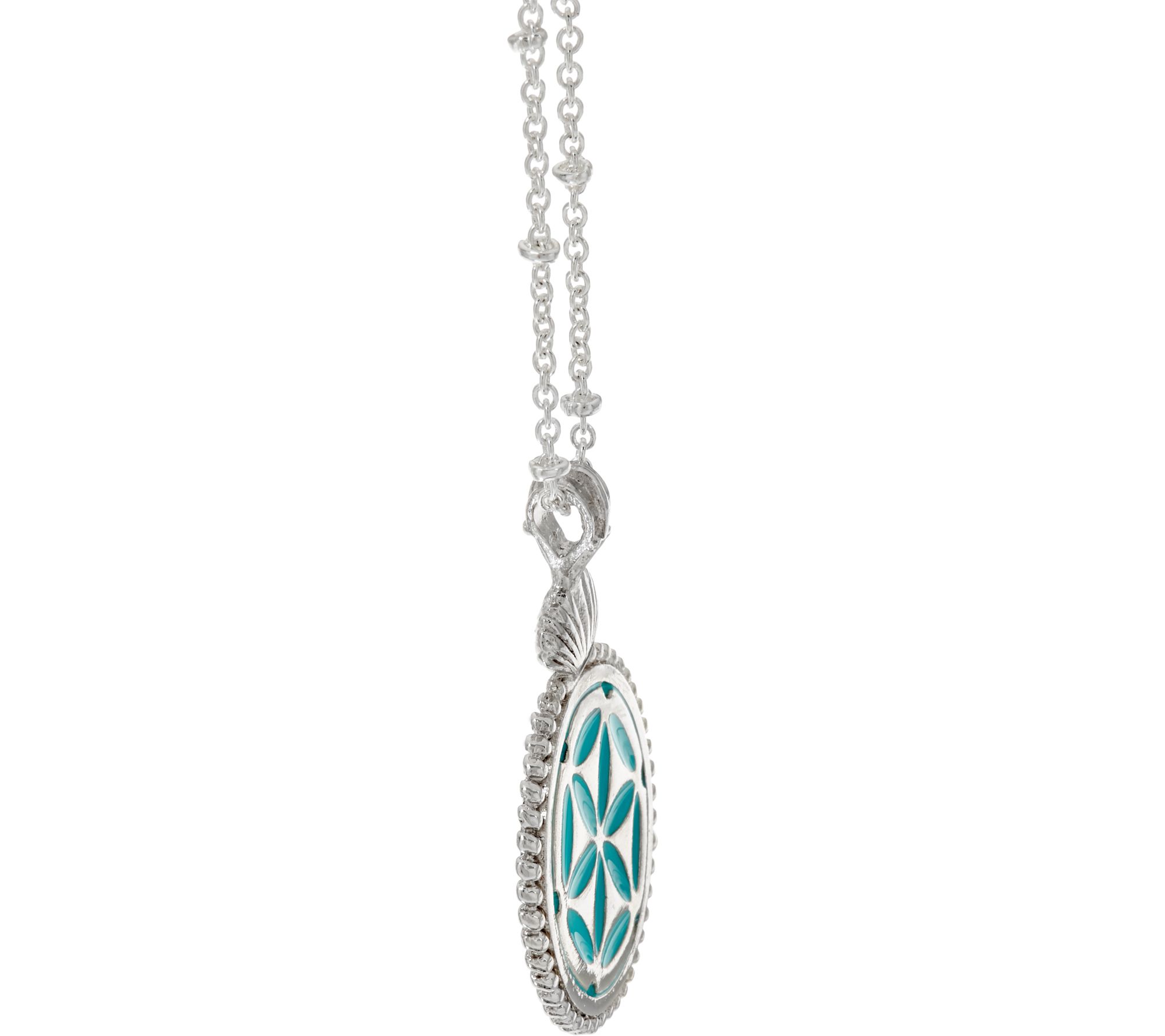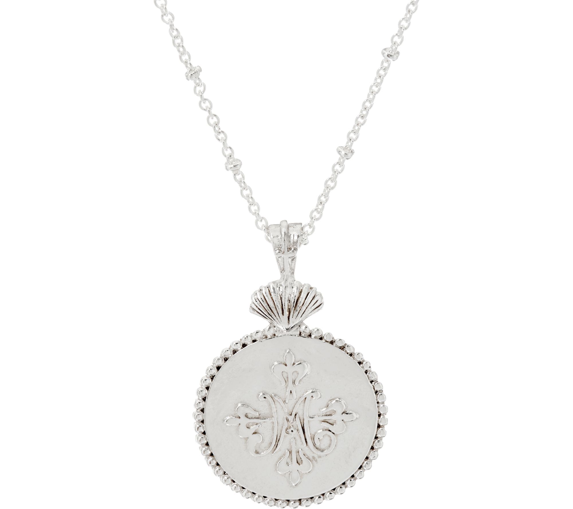 • Polished chain with stations; circle pendant with Magdalene symbol, colored epoxy enamel, rope edging, and brand logo on back; shell design below bail