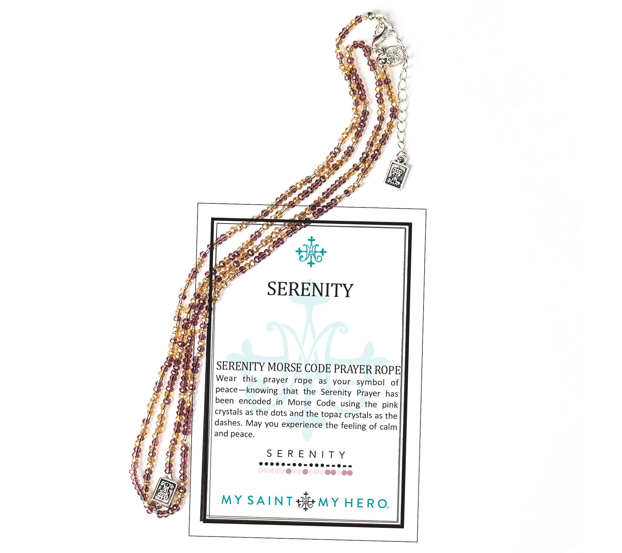 This prayer rope necklace is a symbol of peace, with the Serenity Prayer encoded in morse code using the pink crystals as the dots and the topaz crystals as the dashes. From My Saint, My Hero.