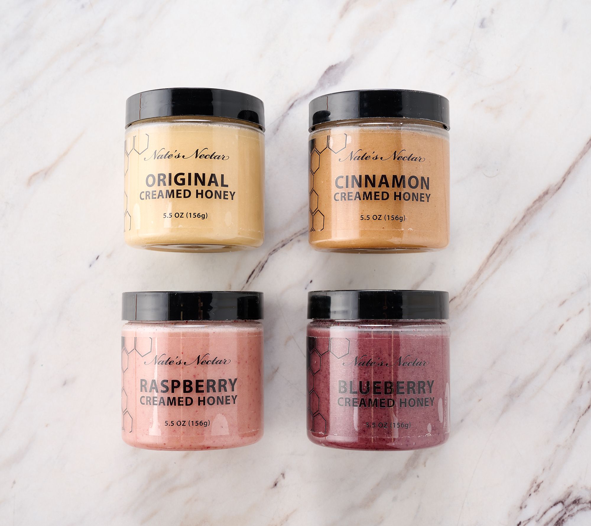 • Includes four 5.5-oz jars of creamed honey: one each of cinnamon, blueberry, original, and raspberry