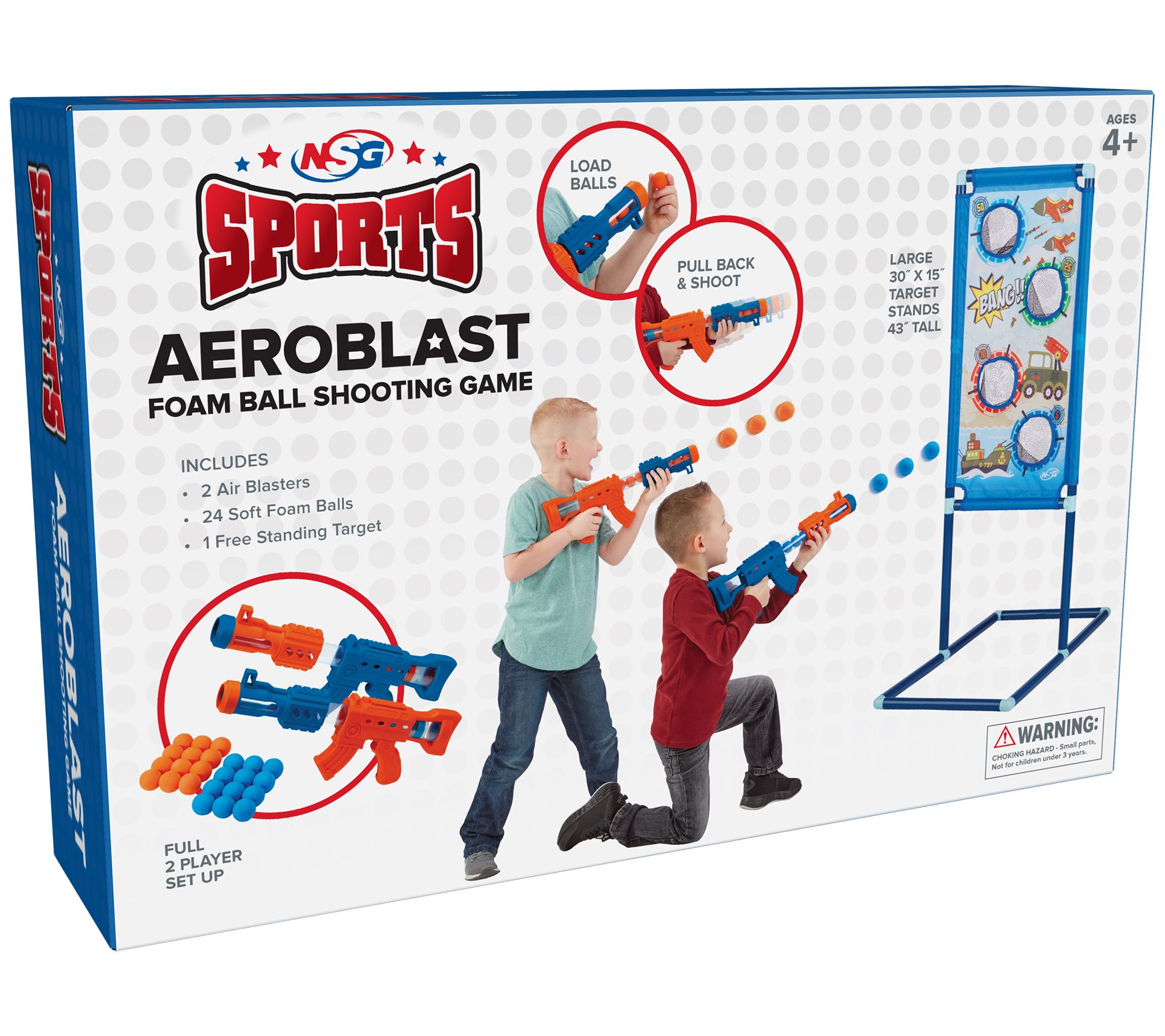 • Includes two air blasters, 12 orange foam balls, 12 blue foam balls, and freestanding target