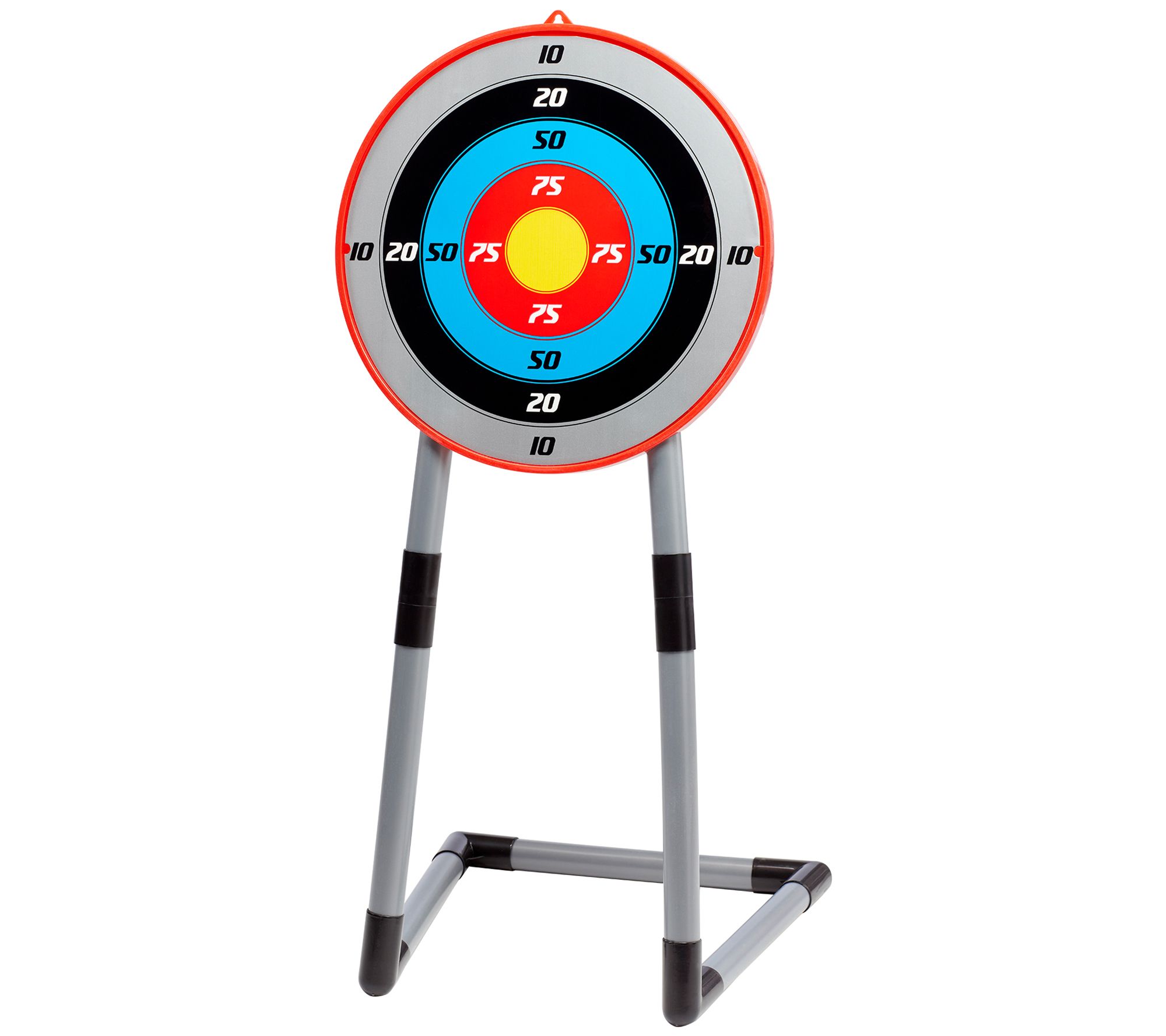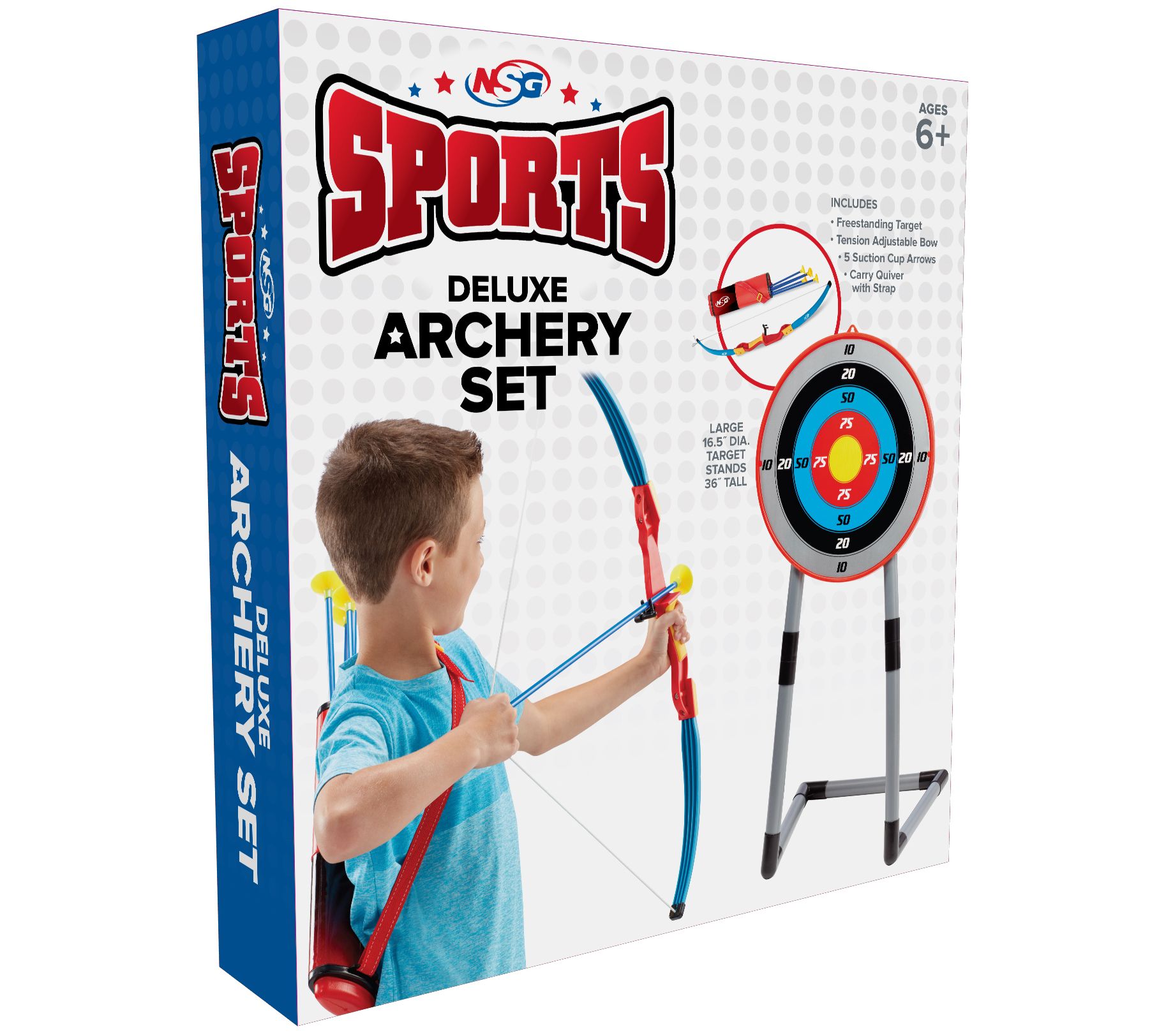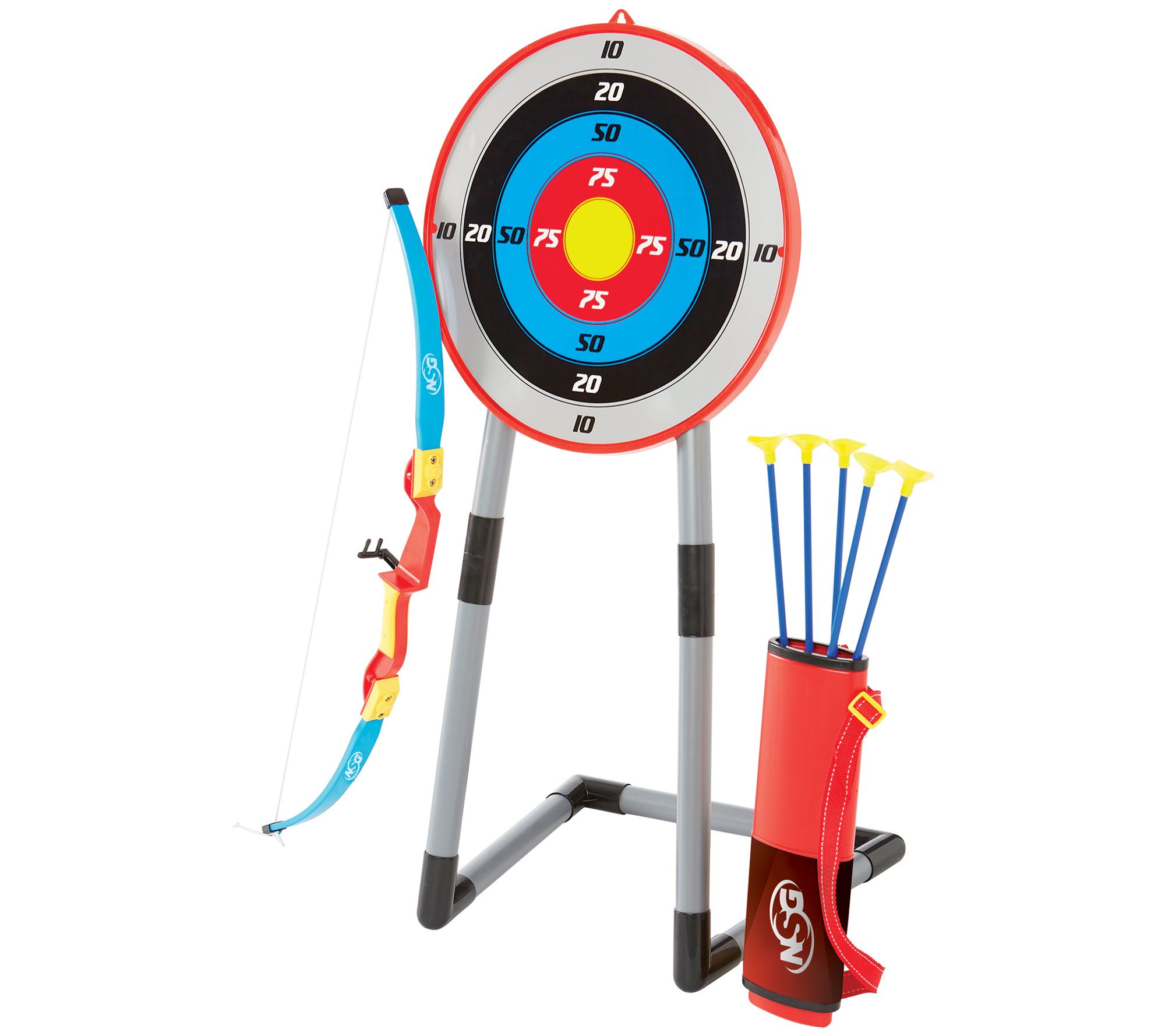 • Includes tension adjustable bow, free-standing target with scoring system, quiver with adjustable carrying strap, and five arrows with suction-cup tips